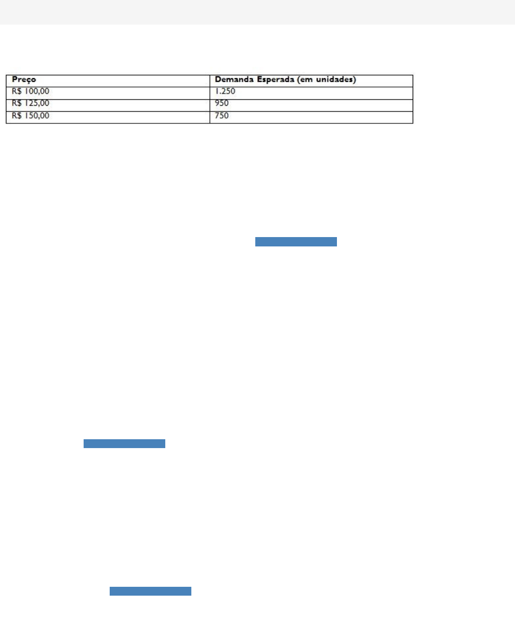 Av2 - Marketing de Produtos e Serviços Texto base:Uma empresa faz um teste de mercado para estudar aumento de preço de seu principal serviço, conforme a tabela abaixo: Tendo em vista o teste de mercado realizado pela empresa, por qual preço ela deverá se decidir e por quê? Alternativas: · a)R$ 150, visto que é o maior preço. · b)R$ 125, visto que é o maior faturamento esperado. · c)R$ 100, visto que o custo de fabricação é menor. · d)R$ 150, visto que o faturamento é maior. · e)R$ 100, visto que o faturamento é maior. Alternativa assinalada 2)Texto base:Uma dona de casa resolve ajudar seu marido nas contas da casa. Ela acredita que, vendendo bolos de aniversário, conseguirá pagar o aluguel da sua casa e assim contribuir financeiramente para a vida da família. O aluguel da sua casa é de R$ 1.500/mês. Ela calcula que o custo de produção de cada quilograma de bolo de aniversário será, em média, de R$ 15. Na sua região, os bolos de aniversários são vendidos a R$ 30/kg, valor que ela também pretende cobrar. Com esse preço, quantos quilos de bolo a dona de casa precisará vender para pagar o aluguel da sua residência? Alternativas: · a)50 kg. · b)65 kg. · c)80 kg. · d)100 kg.Alternativa assinalada · e)115 kg. 3)Texto base:Uma empresa possui Custos Fixos no valor de R$ 2.250. Seus custos variáveis (unitário) são de R$ 275. O preço de venda decidido pelo pessoal de marketing será de R$ 475. Quantas unidades ela precisará vender para atingir seu ponto de equilíbrio? Alternativas: · a)8 unidades. · b)9 unidades. · c)10 unidades. · d)11 unidades. · e)12 unidades.Alternativa assinalada 4)Texto base:Considere, atentamente, o anúncio dos refrigerantes do supermercado Dia% Fonte: Folheto Dia da loja Freguesia do Ó, São Paulo, Capital, 21/01/2016 a 27/01/2016 Pelo tipo de comunicação feita, podemos identificar determinada política de preço. Sobre esse tema, podemos I-Trata-se da estratégia conhecida como preço de mercado. II-O principal atrativo dessa estratégia é preço abaixo dos concorrentes. III-Também conhecida como estratégia de combate à concorrência. Está correto o que se diz em: Alternativas: · a)I Apenas Alternativa assinalada · b)II Apenas · c)I e II Apenas · d)II e III Apenas · e)I,II e III 5)Texto base:Observe a propaganda do Supermercado Makro Qual é a estratégia de preço adotada? Alternativas: · a)Preço geográfico. · b)Preço isca. · c)Preço de economia. Alternativa assinalada · d)Preço de mercado. · e)Preço psicológico.