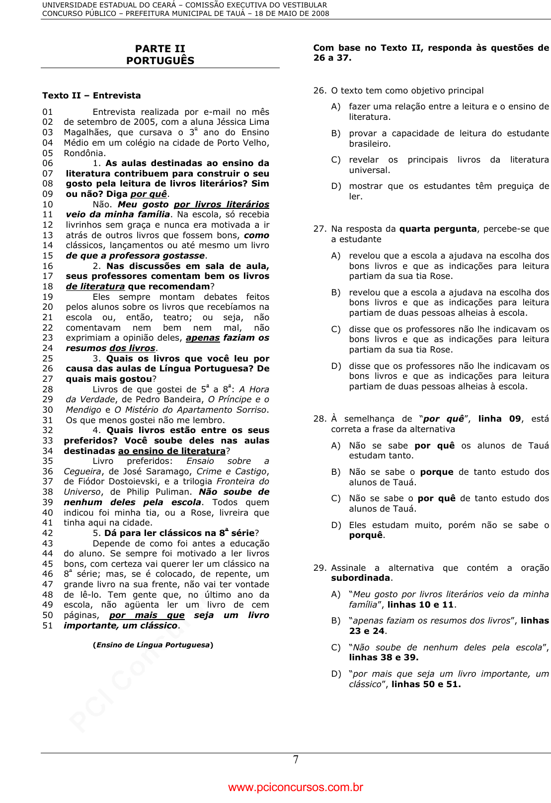 pcimarkpci MDAwMDowMDAwOjAwMDA6MDAwMDowMDAwOmZmZmY6YjVkNzplZTg0:VHVlLCAyMSBKdWwgMjAyMCAxMzo0MjozMyAtMDMwMA== UNIVERSIDADE ESTADUAL DO CEARÁ – COMISSÃO EXECUTIVA DO VESTIBULAR CONCURSO PÚBLICO – PREFEITURA MUNICIPAL DE TAUÁ – 18 DE MAIO DE 2008 7 PARTE II PORTUGUÊS Texto II – Entrevista 01 02 03 04 05 06 07 08 09 10 11 12 13 14 15 16 17 18 19 20 21 22 23 24 25 26 27 28 29 30 31 32 33 34 35 36 37 38 39 40 41 42 43 44 45 46 47 48 49 50 51 Entrevista realizada por e-mail no mês de setembro de 2005, com a aluna Jéssica Lima Magalhães, que cursava o 3º ano do Ensino Médio em um colégio na cidade de Porto Velho, Rondônia. 1. As aulas destinadas ao ensino da literatura contribuem para construir o seu gosto pela leitura de livros literários? Sim ou não? Diga por quê. Não. Meu gosto por livros literários veio da minha família. Na escola, só recebia livrinhos sem graça e nunca era motivada a ir atrás de outros livros que fossem bons, como clássicos, lançamentos ou até mesmo um livro de que a professora gostasse. 2. Nas discussões em sala de aula, seus professores comentam bem os livros de literatura que recomendam? Eles sempre montam debates feitos pelos alunos sobre os livros que recebíamos na escola ou, então, teatro; ou seja, não comentavam nem bem nem mal, não exprimiam a opinião deles, apenas faziam os resumos dos livros. 3. Quais os livros que você leu por causa das aulas de Língua Portuguesa? De quais mais gostou? Livros de que gostei de 5ª a 8ª: A Hora da Verdade, de Pedro Bandeira, O Príncipe e o Mendigo e O Mistério do Apartamento Sorriso. Os que menos gostei não me lembro. 4. Quais livros estão entre os seus preferidos? Você soube deles nas aulas destinadas ao ensino de literatura? Livro preferidos: Ensaio sobre a Cegueira, de José Saramago, Crime e Castigo, de Fiódor Dostoievski, e a trilogia Fronteira do Universo, de Philip Puliman. Não soube de nenhum deles pela escola. Todos quem indicou foi minha tia, ou a Rose, livreira que tinha aqui na cidade. 5. Dá para ler clássicos na 8ª série? Depende de como foi antes a educação do aluno. Se sempre foi motivado a ler livros bons, com certeza vai querer ler um clássico na 8ª série; mas, se é colocado, de repente, um grande livro na sua frente, não vai ter vontade de lê-lo. Tem gente que, no último ano da escola, não agüenta ler um livro de cem páginas, por mais que seja um livro importante, um clássico. (Ensino de Língua Portuguesa) Com base no Texto II, responda às questões de 26 a 37. 26. O texto tem como objetivo principal A) fazer uma relação entre a leitura e o ensino de literatura. B) provar a capacidade de leitura do estudante brasileiro. C) revelar os principais livros da literatura universal. D) mostrar que os estudantes têm preguiça de ler. 27. Na resposta da quarta pergunta, percebe-se que a estudante A) revelou que a escola a ajudava na escolha dos bons livros e que as indicações para leitura partiam da sua tia Rose. B) revelou que a escola a ajudava na escolha dos bons livros e que as indicações para leitura partiam de duas pessoas alheias à escola. C) disse que os professores não lhe indicavam os bons livros e que as indicações para leitura partiam da sua tia Rose. D) disse que os professores não lhe indicavam os bons livros e que as indicações para leitura partiam de duas pessoas alheias à escola. 28. À semelhança de “por quê”, linha 09, está correta a frase da alternativa A) Não se sabe por quê os alunos de Tauá estudam tanto. B) Não se sabe o porque de tanto estudo dos alunos de Tauá. C) Não se sabe o por quê de tanto estudo dos alunos de Tauá. D) Eles estudam muito, porém não se sabe o porquê. 29. Assinale a alternativa que contém a oração subordinada. A) “Meu gosto por livros literários veio da minha família”, linhas 10 e 11. B) “apenas faziam os resumos dos livros”, linhas 23 e 24. C) “Não soube de nenhum deles pela escola”, linhas 38 e 39. D) “por mais que seja um livro importante, um clássico”, linhas 50 e 51. www.pciconcursos.com.br pcimarkpci MDAwMDowMDAwOjAwMDA6MDAwMDowMDAwOmZmZmY6YjVkNzplZTg0:VHVlLCAyMSBKdWwgMjAyMCAxMzo0MjozMyAtMDMwMA== UNIVERSIDADE ESTADUAL DO CEARÁ – COMISSÃO EXECUTIVA DO VESTIBULAR CONCURSO PÚBLICO – PREFEITURA MUNICIPAL DE TAUÁ – 18 DE MAIO DE 2008 8 30. Com relação à função dos termos I – “por livros literários”, linha 10, II – “de literatura”, linha 18, e III – “dos livros”, linha 24, são A) adjuntos adnominais somente I e III. B) complementos nominais somente I e III. C) adjuntos adnominais. D) complementos nominais. 31. A palavra “como”, linha 13, transmite idéia de A) exemplificação, ou seja, equivale a por exemplo. B) comparação, ou seja, equivale a por exemplo. C) exemplificação, ou seja, corresponde a assim como. D) comparação, ou seja, corresponde a assim como. 32. Do mesmo modo que em “de que a professora gostasse”, linha 15, deve haver uma preposição no espaço da frase: A) A equipe ______ que o novo técnico de Tauá assumiu treina muito. B) Chegaram os estudantes ______ que o diretor quer ajudar. C) A aprendizagem ______ que os estudantes desejam é o objetivo principal da escola. D) É nova a escola ______ que os estudantes chegaram. 33. A palavra “apenas”, linha 23, expressa idéia de A) afastamento. B) aproximação. C) exclusão. D) inclusão. 34. A frase “faziam os resumos dos livros”, linhas 23 e 24, na terceira pessoa do imperativo afirmativo, fica A) faça os resumos dos livros. B) faz os resumos dos livros. C) faças os resumos dos livros. D) faze os resumos dos livros. 35. Se o termo sublinhado da frase “Você soube deles nas aulas destinadas ao ensino de literatura?”, linhas 33 e 34, for permutado, haverá crase em A) ... destinadas a paixão pela literatura. B) ... destinadas a várias turmas que gostam de literatura. C) ... destinadas a cursos de literatura. D) ... destinadas a to