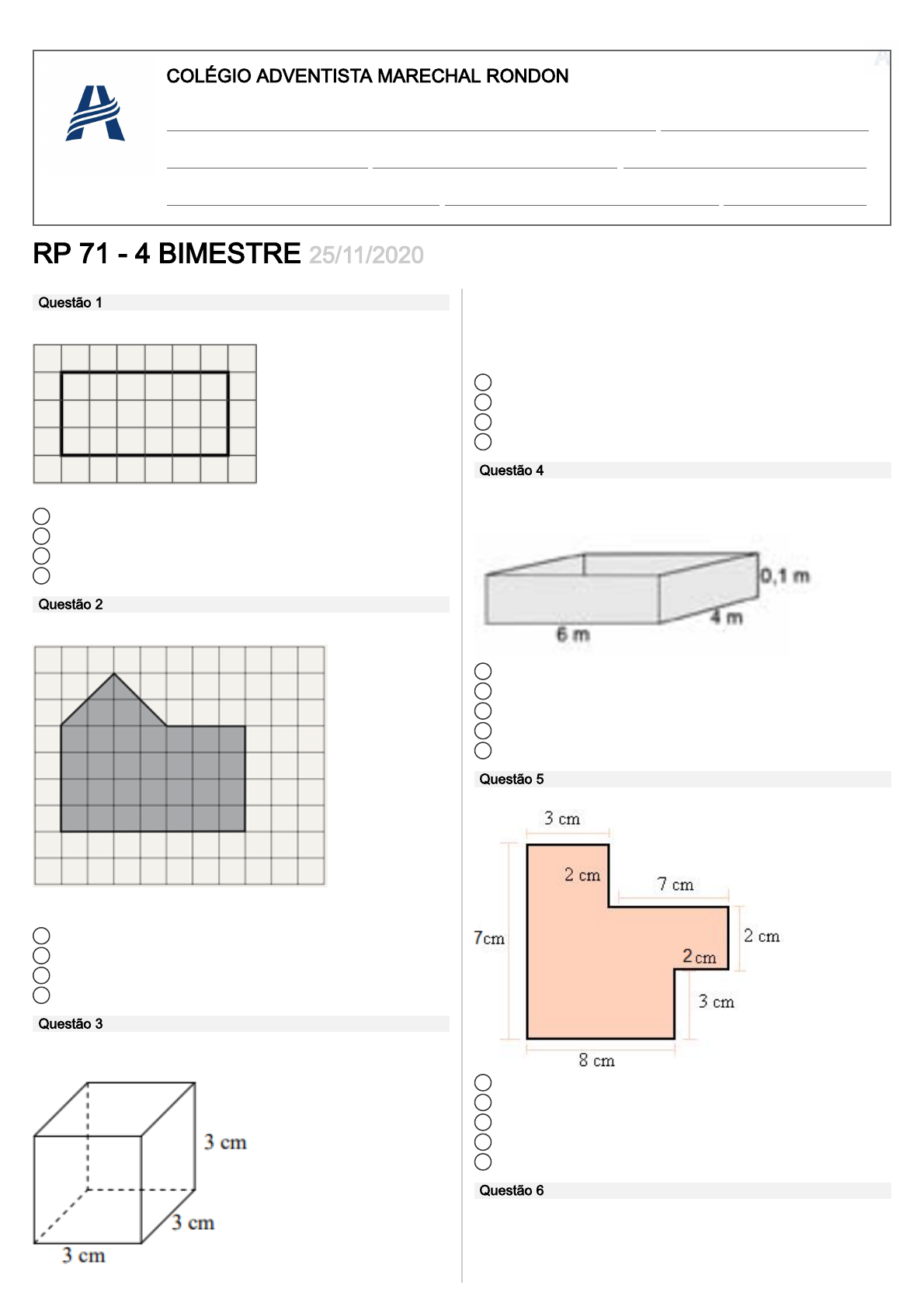 25/11/2020 https://cpbprova.com.br/empresas_provas_imprimir / COLÉGIO ADVENTISTA MARECHAL RONDON Aluno(a): Matrícula: Data: Turma: Bimestre: Professor(a): Disciplina: Nota: RP 71 - 4 BIMESTRE 25/11/2020 a b c d a b c d a b c d a b c d e a b c d e Questão 1 Observe o retângulo destacado na malha quadriculada abaixo. Cada lado do quadradinho dessa malha equivale a 1 cm. Qual é a medida do perímetro desse retângulo? 18 cm 12 cm 6 cm 3 cm Questão 2 Observe a figura que Regina desenhou na malha quadriculada abaixo, em que cada quadradinho tem 1 cm² de área. Com estas informações, descubra qual a área total da figura desenhada. 22 30 32 34 Questão 3 O cubo abaixo possui arestas com 3cm de comprimento. Levando em consideração o cálculo de volume de sólidos geométricos, descubra qual o volume da figura abaixo. . 27 cm² 2,7 cm 0,27 cm³ 27 cm³ Questão 4 Um pedreiro precisa concretar uma laje de formato retangular, com dimensões 4 m por 6 m, e espessura igual a 0,1 m. O volume de concreto necessário, em m3, é: 24 6,2 2,4 8.2 10,1 Questão 5 A área da figura abaixo em cm2, é: 50 64 58 42 48 Questão 6 A área da figura abaixo, em cm2, é: 25/11/2020 https://cpbprova.com.br/empresas_provas_imprimir / a b c d e a b c d e a b c d a b c d e a b c d 22,5 18 25.5 29.5 31 Questão 7 Maria acorda e vai preparar uma vitamina de leite com banana. Ela precisa de 250 mililitros de leite e uma banana para fazer um copo de vitamina. Para que Maria prepare 8 copos de vitamina, ela precisará de quantos litros de leite? 1 litro 2 litros 4 litros 5 litros 0,2 litros Questão 8 Se 30 livros de matemática do sétimo ano pesam 20kg, quantos quilos pesam 88 livros de matemática? 60,87 57,66 58,67 32 Questão 9 D1 D2 E1 D5 Nenhuma das alternativas acima Questão 10 Considerando o quadrado abaixo, assinale a alternativa que responda respectivamente seu perímetro e sua área 25,6 m e 40,96 m² 25,6 m² e 40,96 m² 6,4 m e 40,96 m² 25,6 m e 25,6 m²