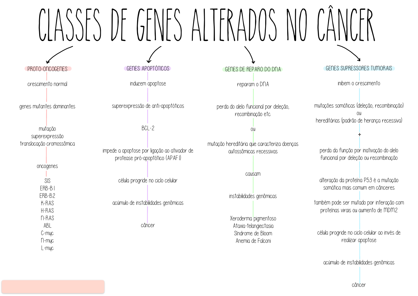classes de genes alterados no cancer PROTO-ONCOGENES crescimento normal genes mutantes dominantes mutação superexpressão translocação cromossômica oncogenes SIS ERB-B1 ERB-B2 K-RAS H-RAS N-RAS ABL C-myc N-myc L-myc GENES APOPTÓTICOS induzem apoptose superexpressão de anti-apoptóticos BCL-2 impede a apoptose por ligação ao ativador de protease pró-apoptótico (APAF1) célula progride no ciclo celular acúmulo de instabilidades genômicas câncer GENES DE REPARO DO DNA reparam o DNA perda do alelo funcional por deleção, recombinação etc. ou mutação hereditária que caracteriza doenças autossômicas recessivas causam instabilidades genômicas Xeroderma pigmentoso Ataxia-telangiectasia Síndrome de Bloom Anemia de Falconi GENES SUPRESSORES TUMORAIS inibem o crescimento mutações somáticas (deleção, recombinação) ou hereditárias (padrão de herança recessiva) perda da função por inativação do alelo funcional por deleção ou recombinação alteração da proteína P53 é a mutação somática mais comum em cânceres também pode ser mutado por interação com proteínas virais ou aumento de MDM2 célula progride no ciclo celular ao invés de realizar apoptose acúmulo de instabilidades genômicas câncerBEATRIZ NOGUEIRA - Medicina UFSM, turma 110 IIII:
