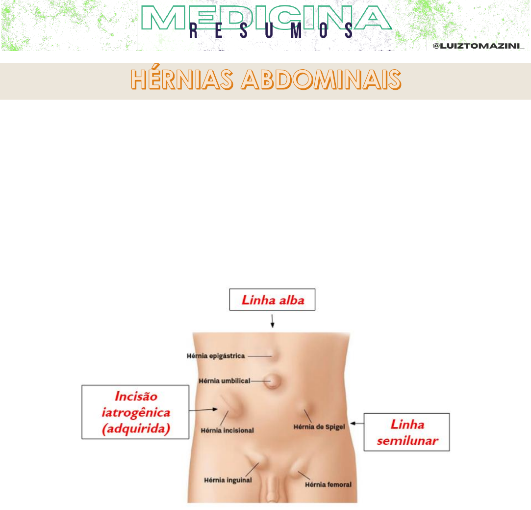 Qualquer fraqueza ou defeito na parede abdominal pode permitir a protrusão de uma bolsa de peritônio revestida por serosa chamada de saco herniário. Hérnias adquiridas tipicamente ocorrem anteriormente, através dos canais inguinal e femoral, umbigo ou em locais onde há cicatrizes cirúrgicas, e são comuns, ocorrendo em até 5% da população. Elas são a causa mais frequente de obstrução intestinal em todo o mundo, e são a terceira maior causa de obstrução nos Estados Unidos. A obstrução geralmente ocorre devido à protrusão visceral (herniação externa) e está mais frequentemente associada a hérnias inguinais, as quais tendem a apresentar orifícios estreitos e sacos largos. As alças do intestino delgado estão tipicamente envolvidas, mas o omento ou o intestino grosso também se projetam, e qualquer um desses pode ficar aprisionado. A pressão no colo da bolsa pode prejudicar a drenagem venosa da víscera aprisionada. A estase e edema resultantes aumentam o volume da alça herniada, levando a um aprisionamento permanente (encarceramento) e, ao longo do tempo, comprometimento arterial e venoso (estrangulamento) e infarto DEFINIÇÕES Hérnia: Passagem do conteúdo abdominal através de orifícios abdominais, naturais ou adquiridos, pela parede abdominal; interna ou externa Saco herniário: É o peritônio protruso, juntamente com o conteúdo abdominal, ao passar pelo anel herniário Anel herniário: Defeito adquirido ou orifício natural por onde se insinua o conteúdo abdominal CONTEÚDO DO SACO HERNIÁRIO Redutibilidade: Redutível; encarcerado Viabilidade: Não-complicado; Estrangulado (sofrimento isquêmico) SINAIS E SINTOMAS GERAIS − Abaulamento que se acentua na manobra de Valsalva − desconforto leve ou assintomática − Episódios de redução e encarceramento − Hérnia Encarcerada: não pode ser reduzida e pode ser a causa de obstrução intestinal; causa dor progressivamente mais intensa, tipicamente acompanhada de náuseas e vômitos. REDUÇÃO MANUAL DA HÉRNIA A maioria das hérnias, até mesmo as maiores, pode ser reduzida manualmente com pressão leve e persistente; colocar o paciente na posição de Trendelenburg pode ajudar. FATORES PREDISPONENTES: − Persistência de estruturas embriológicas − Fraqueza textural das fáscias − Variantes anatômicas − Tabagismo − Obstipação − Prostatismo − Atividade Física DIAGNÓSTICO Avaliação clínica: Por ser a hérnia aparente somente quando a pressão abdominal se eleva, o paciente deve ser examinado em pé. Caso a hérnia não seja palpável, o paciente deve tossir ou realizar manobra de Valsalva com o examinador palpando a parede abdominal. O exame deve focar-se no umbigo, na região inguinal (com um dedo no canal inguinal em homens), no triângulo femoral e em qualquer incisão presente. PROGNÓSTICO Hérnias umbilicais congênitas raramente estrangulam e não são tratadas; a maioria desaparece espontaneamente em alguns anos. Defeitos muito grandes podem ser reparados eletivamente depois dos 2 anos de idade. As hérnias umbilicais nos adultos causam preocupações estéticas e seu reparo pode ser eletivo; o estrangulamento e o encarceramento são incomuns, mas podem acontecer e costumam ocorrer com o omento em vez do intestino. TRATAMENTO Correção cirúrgica Obs: Uma hérnia encarcerada ou estrangula- da de qualquer tipo requer o reparo cirúrgico de urgência. CLASSIFICAÇÃO DAS HÉRNIAS ABDOMINAIS − Hérnias na parede abdominal − Hérnias inguinais − Cerca de 75% de todas as hérnias abdominais são hérnias inguinais. Hérnias incisionais correspondem a outros 10 a 15%. Hérnias femorais e outras não usuais representam os 10 a 15% restantes. HÉRNIAS NA PAREDE ABDOMINAL Hérnia abdominal pode ocorrer através de qualquer fraqueza ou defeito na parede da cavidade peritoneal, incluindo canal inguinal e femoral, umbigo e locais de cicatriz cirúrgica (incisional): − Hérnias umbilicais: em sua maioria são congênitas, mas algumas podem ser adquiridas na idade adulta secundárias a obesidade, ascite, gestação ou diálise peritoneal crônica − Hérnias epigástricas: ocorrem através da linha alba. − Hérnias de Spiegel: ocorrem secundariamente a defeitos no músculo transverso do abdome lateralmente à capa do reto abdominal, geralmente abaixo do nível do umbigo − Hérnias incisionais: ocorrem através de incisão de cirurgia anterior. HÉRNIAS INGUINAIS A hérnia inguinal é a protrusão do conteúdo abdominal através de uma região de maior fraqueza ou defeito na parede abdominal, adquiridos ou congênitos, logo acima do ligamento inguinal. Indireta: Insinua-se pelo anel inguinal interno, lateralmente aos vasos epigástricos profundos, e o saco herniário acompanha o canal inguinal, podendo descer até o anel inguinal externo e chegar ao escroto Direta: Exterioriza-se medialmente aos vasos epigástricos profundos através de uma fraqueza da fáscia transversalis Hérnias inguinais: ocorrem acima do ligamento inguinal. Hérnias inguinais indiretas atravessam o anel inguinal interno para o canal inguinal e hérnias inguinais diretas se estendem diretamente para frente e não passam através do canal inguinal. Hérnias femorais: ocorrem abaixo do ligamento inguinal e vão para o canal femoral. TRIÂNGULO DE HASSELBACH O triângulo de Hasselbach, ou trígono inguinal, é uma região na porção inferior da parede abdominal delimitada pelas seguintes estruturas: − margem lateral do músculo reto abdominal (medialmente), − ligamento inguinal (inferiormente) − e vasos epigástricos inferiores (superolateralmente). Essencial para a classificação das hérnias inguinais, que consistem na protrusão do conteúdo abdominal pela região inguinal. Essas hérnias podem ser classificadas em indiretas, quando surgem fora do triângulo (lateralmente aos vasos epigástricos inferiores) e em diretas, quando surgem dentro da região demarcada pelo triângulo (medialmente ao
