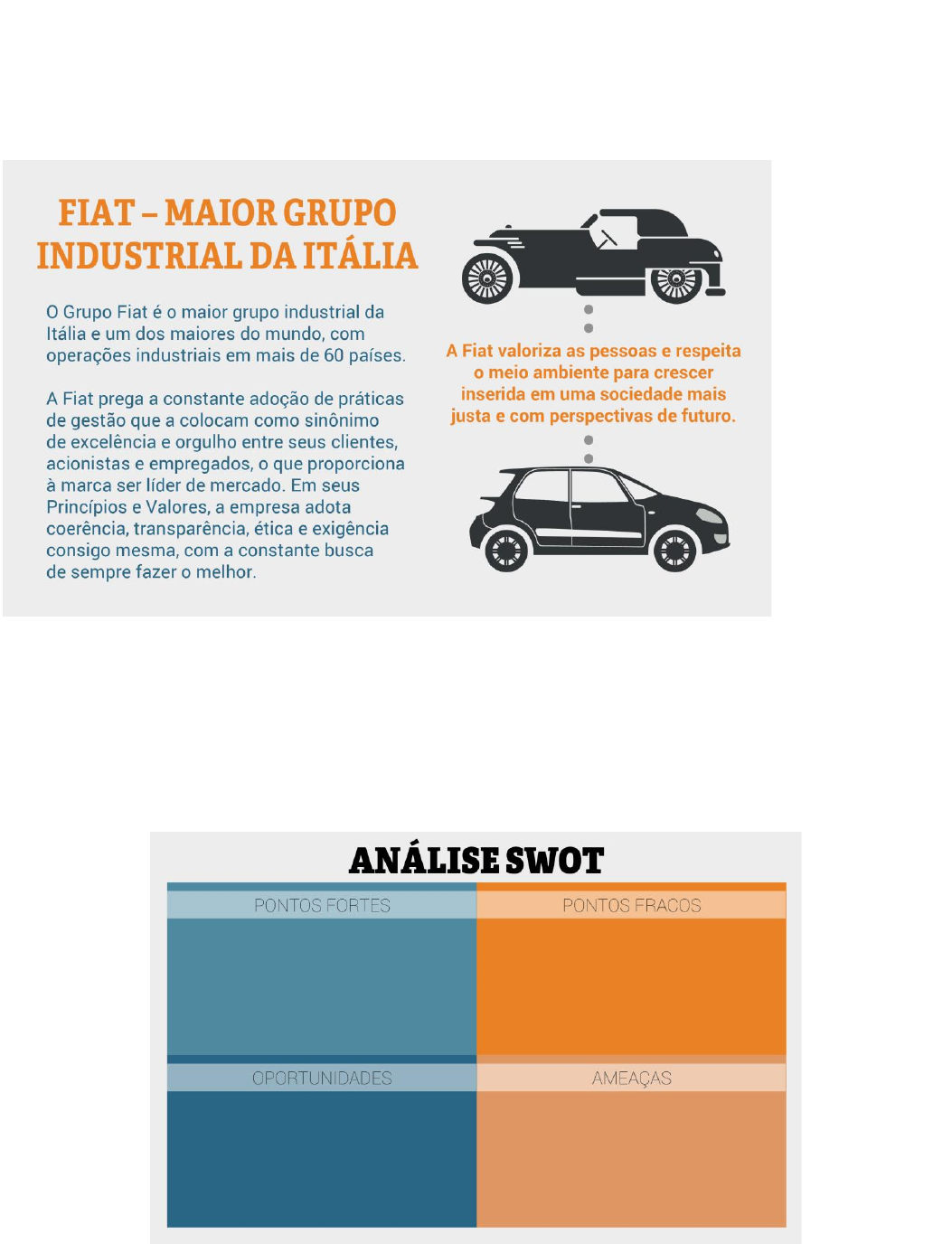 Desafio : Planejamento Estratégico Nesse Desafio, você vai relacionar o planejamento estratégico e o mercado automobilístico. O mercado automotivo movimenta-se em função de muitos fatores, por exemplo, inflação, competitividade e incentivos fiscais. Dessa forma, o planejamento estratégico é de extrema importância para as empresas automobilísticas terem assertividade quanto a resultados futuros. Você foi convocado para participar do planejamento estratégico da empresa FIAT e ficará responsável pela elaboração da ferramenta de análise SWOT. Pesquise sobre a empresa e identifique seus pontos fracos e fortes (análise interna), além das ameaças e oportunidades (análise externa). Em seguida, preencha o quadro a seguir. Padrão de resposta esperado A resposta do desafio está baseada no contexto atual do mercado automobilístico. O SWOT acompanhará as mudanças econômicas, sociais e políticas ocorridas no país.