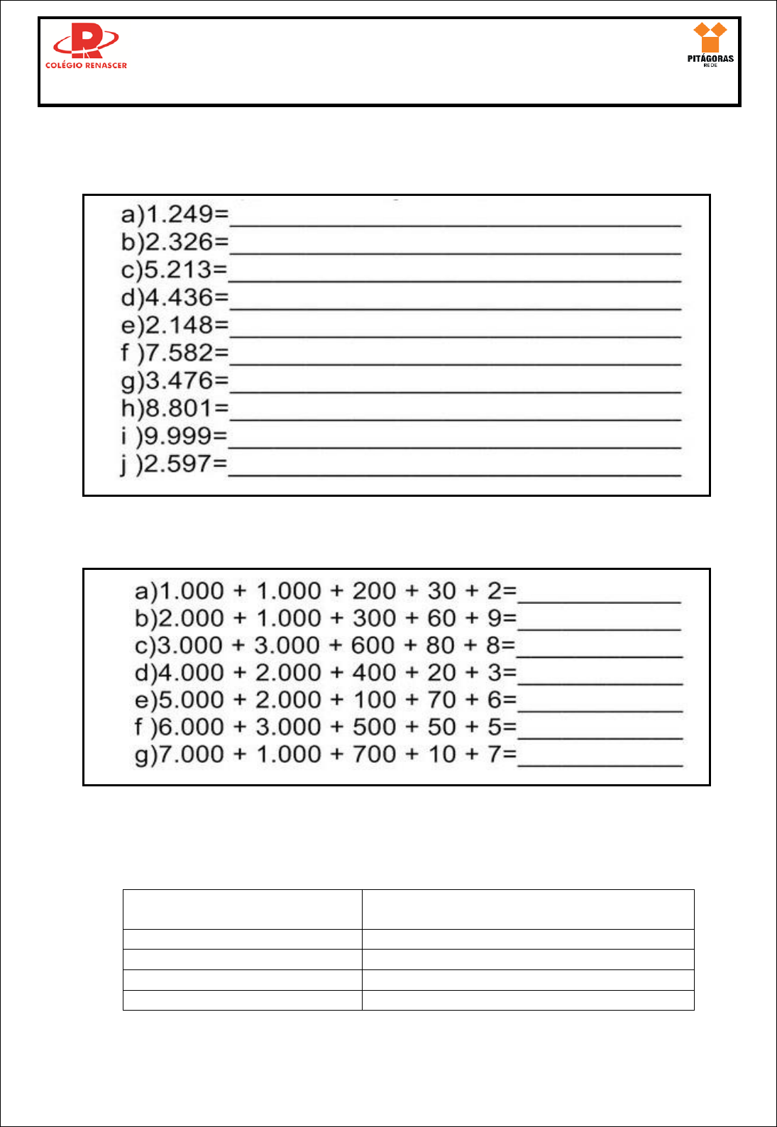 Colégio Renascer - “Construindo com você”. Atividade Avaliativa de Matemática – 3º Ano do Ensino Fundamental Aluno(a): __________________________________________________Data: / /2020 Professor: Rafael ATIVIDADE AVALIATIVA DE MATEMÁTICA 1- Decomponha os seguintes números: 2- Componha os números abaixo: 3- Os alunos da escola estão juntando latinhas para reciclar. Observe a tabela e responda: TURMA NÚMERO DE LATAS 1º ano 1000 2º ano 1150 3º ano 1375 4º ano 982 a) Quantas latas as turmas já conseguiram trazer? ( ) 4307 ( )4507 ( ) 4417 b) Qual a turma juntou mais latinha? ( ) 1ºano ( ) 2ºano ( ) 3ºano ( ) 4ºano c) Qual turma juntou menos latinha? ( ) 1ºano ( ) 2ºano ( ) 3ºano ( ) 4ºano 4- Observe abaixo a quantidade de pontos que cada criança marcou em uma brincadeira. Quem marcou mais pontos? a) Artur. b) Igor. c) Jonas. d) Renata 5- Observe abaixo as moedas que Luana possui. Ela trocou essas moedas por uma nota de mesmo valor. Por qual nota Luana trocou essas moedas? 6 - Escreva com algarismos os seguintes números: a) Três mil quatrocentos e vinte e três __________________ b) Cinco mil trezentos e dezoito ______________________ c) Mil cento e um __________________________ d) Quatro mil setecentos e oitenta e quatro___________ e) Nove mil oitocentos e quarenta e nove_______________ 7- Marque a alternativa correta: a) Qual é a decomposição do número 5218? ( ) 5000+200+18 ( ) 5000+20+1+8 ( ) 5000+200+10+8 ( ) 500+218 b) Qual alternativa o número 6353 está escrito corretamente: ( ) Seis mil trecentos e cincoenta e trez ( ) Seis mil tresentos e cinquenta e treis ( ) Seis mil trecentos e cinquenta e três ( ) Seis mil trezentos e cinquenta e três c) Qual número é formado por 9000+ 400+ 20+ 4? ( ) 9424 ( ) 9024 ( ) 9044 ( ) 9420 d) Qual é o antecessor do número 1257? ( ) 1253 ( ) 1258 ( ) 1256 ( ) 1259 8- Observe os desenhos dos ábacos abaixo e registre os números representados neles: 9- Escreva por extenso: a) 3621_______________________________________________________ b) 5598_______________________________________________________ c)1296_______________________________________________________ d) 9714______________________________________________________ e)8023______________________________________________________ 10- Resolva e marque a resposta certa: 11-Observe a fila do cinema, depois faça o que se pede: a) Pinte de verde a camiseta da 5ª criança da fila. b) Pinte de vermelho a camiseta da 2ª menina da fila. c) Pinte de azul a camiseta da 10ª criança. d) Pinte de amarelo a blusa da 12ª criança. 12- Resolva os problemas: a) Um trem saiu da estação A com 520 pessoas. Ao chegar na estação B entraram mais 389 pessoas. Quantas pessoas há no trem agora? b) Num parque de diversões, a montanha russa tem 1124 carrinhos. Foram usados 1103 lugares. Quantos lugares sobraram? Cálculo Cálculo c) Jonas, o jornaleiro, entrega jornais todos os dias. Seus 1278 fregueses recebem o jornal. A partir da próxima semana ele entregará para mais 1137 fregueses. Quantos fregueses Jonas terá no total? Deus te abençoe! Cálculo