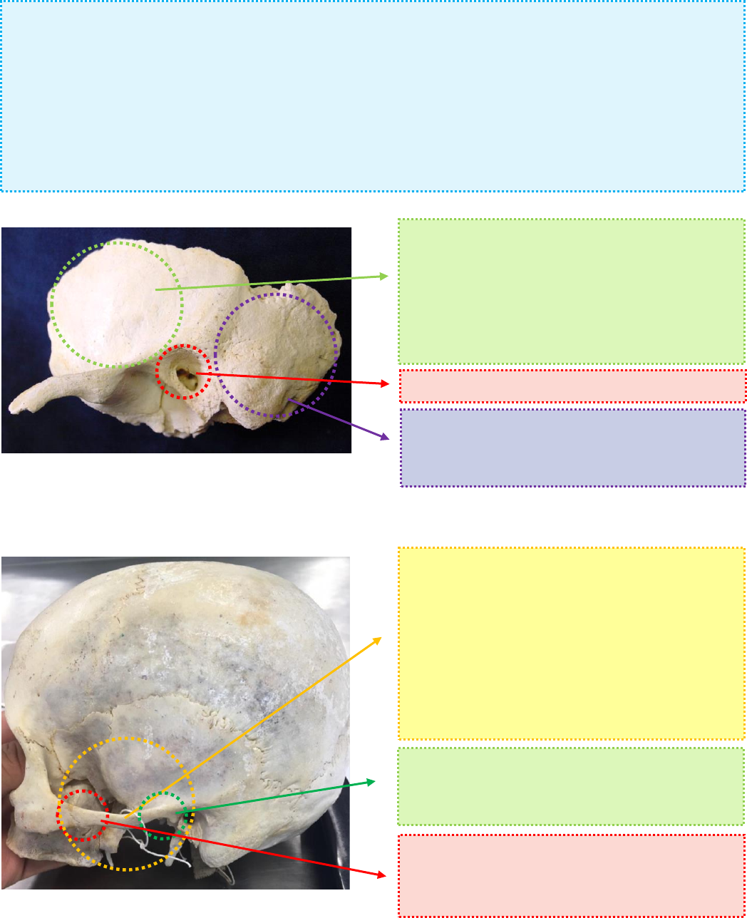 29/07/2019 ANATOMIA DO OSSO TEMPORAL E ORELHA EXTERNA OSSO TEMPORAL ACIDENTES ÓSSEOS DO OSSO TEMPORAL - Osso par e irregular que forma as laterais do crânio (têmporas). - É dividido em três partes, tomando como referência o Meato Acústico Externo (M.A.E): 1. Escama: parte acima do M.A.E 2. Porção Timpânica: ao redor do M.A.E 3. Porção Petrosa ou Rochedo: para trás (posterior) e para o meio Algumas bibliografias apontam ainda uma quarta porção (Porção Mastoidea), aqui a incluímos com a terceira porção (Petrosa) Porção Escamosa (Escama): - Lembra uma escama de peixe - Recebe esse nome devido a sutura escamosa, articulada com o osso parietal (A. fibrosa sutura escamosa – parietotemporal) Porção Timpânica Porção Petrosa ou Rochedo: - É a parte mais grossa, parecendo um pedaço de rocha Arco Zigomático: Ponte unindo os ossos zigomático e temporal - É formado por: 1. Processo Zigomático do Temporal 2. Processo Temporal do Zigomático Em anatomia chama-se “Processo” as saliências ou protuberâncias naturais dos órgãos. Processo Zigomático do Temporal: - Processo que sai do temporal em direção ao Zigomático (parte temporal do Arco Zigomático) Processo Temporal do Zigomático: - Processo que sai do Zigomático em direção ao temporal (parte zigomática do Arco Zigomático) Processo Mastoide: - Projeção cônica na parte posterior do osso temporal (Ponta arredondada na parte inferior do temporal) Em cirurgia de implante coclear geralmente o acesso é realizado pelo Processo Mastoideo Processo Estiloide: - Projeção pontuda na parte posterior do osso temporal - Ajuda a fixar o Osso Hioide, através do ligamento estilo-hioideo - É mais fino e fica próximo ao Processo Mastoideo Processo Mastoide (vista inferior) Processo Estiloide (vista inferior) Forame Estilomastoide: - Forame (buraco) localizado entre os Processos Mastoide e Estiloide - Através dele o Nervo VII sai da caixa craniana Observação: - Imagem está em vista inferior (do crânio) Meato Acústico Interno: - Localizado na parte petrosa do osso temporal - Por ele passam os nervos VII (ramo intermédio) e VIII e a artéria auditiva interna - Fica na parte interna (vista superior) acima do forame Jugular Forame Jugular: - Localizado entre os ossos Temporal e Occipital - Por ele passam a veia Jugular e nervos IX, X e XI ORELHA EXTERNA - É composta pelo Pavilhão auricular e pelo Meato Acústico Externo - Acaba na Membrana Timpânica (onde começa a orelha media) Pavilhão Auricular: - Parte projetada na cabeça - Composto de cartilagem hialina e coberto por pele, com exceção do Lóbulo que é constituído de tecido fibroso, gordura e vasos - Auxilia na captura do som Meato Acústico Externo: - Canal localizado no osso Temporal - Conduz o estímulo sonoro até a membrana timpânica - Começa na parte mais profunda da concha (parte do pavilhão) e se estende até a membrana timpânica - Coberto por pele com pelos e glândulas sebáceas, que produzem o cerume* - Inervação: V3 (ramo mandibular do trigêmeo), VII e X * Cerume: Proteção. Tem função antimicrobiana devido pH levemente ácido, eliminando bactérias aeróbicas Observação: - Imagem consta apenas a “entrada” do M.A.E, uma vez que o mesmo é um canal dentro do osso Temporal Hélice: - Borda externa do pavilhão auricular Antélice: - Borda paralela a hélice Trago: - Proeminência triangular que se projeta para frente e por fora do orifício (entrada) do M.A.E Observação: - Para localização das demais partes do pavilhão, tomamos como referência as três estruturas citadas. Lóbulo: - Parte inferior - Não possui cartilagem hialina Concha: - Toda a região entre trago e antélice é chamada de concha - Tem esse nome por lembrar uma concha do mar Antitrago: - Proeminência paralela ao Trago (em frente) Incisura Intertrágica: - Espaço entre Trago e Antitrago - Inferior a Concha Formato de letra U Ramo Superior da Antélice: - Bifurcação da Antélice na parte superior Ramo Inferior da Antélice: - Bifurcação da Antélice na parte inferior Fossa Triangular: - Depressão em forma de triângulo - Entre ramos superior e inferior da Antélice Tubérculo da Hélice: - Região mais espessa da Hélice Fossa Escafoide ou Escafa: - Depressão em formato de canoa entre ramo superior da Antélice e a Hélice *Em anatomia chamamos de Escafoide tudo que possui formato de canoa MÚSCULOS AURICULARES INERVAÇÃO DA ORELHA EXTERNA IRRIGAÇÃO E DRANAGEM DA ORELHA EXTERNA - Fazem parte dos músculos da mímica (expressão facial) - Movimentam o pavilhão auricular - Todos os músculos da mímica são inervados pelo nervo VII - O nervo VII é acompanhado do nervo VIII, logo, infecções de orelha, geralmente, são acompanhadas de paralisia facial Auricular Superior Auricular Posterior Auricular Anterior NERVOS CRANIANOS - Trigêmeo (V): Inerva principalmente a Região do Trago - Facial (VII): Inerva principalmente a região da concha - Glossofaríngeo (IX): Também inerva parte do M.A.E - Nervo Vago (X) PLEXO CERVICAL Nervos que se conectam a Medula Espinal Plexo: junção de vários nervos Plexo Cervical: união ou entrelaçamento entre os nervos C1, C2, C3 e C4. Esse plexo possui quatro ramos sensitivos e dois deles inervam o pavilhão auricular, são: Occipital menor e auricular magno IRRIGAÇÃO: É realizada por ramos da Carótida externa DRENAGEM VENOSA: Realizada para as veias Jugulares interna e externa DRENAGEM LINFÁTICA: é realizada para os linfonodos Mastoides e Parotídeos (números 2 e 3) MEMBRANA TIMPÂNICA - Separa o M.A.E da orelha média - Inclina-se medialmente - Constituída de tecido conjuntivo revestido por pele no exterior e mucosa no interior - Possui um anel fibrocartilagíneo em sua periferia - Inervação Externa: nervos V, VII e X - Inervação Interna: nervo IX Anel Fibrocartilagíneo: - Localizado ao redor da membrana timpânica - Fixa a membrana timpânica a porção timpânica do osso temporal Parte 