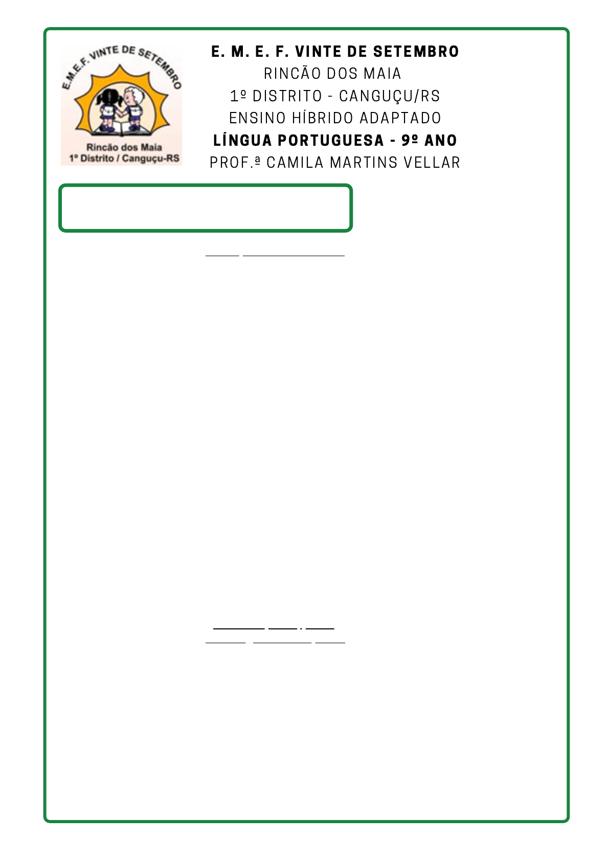 LEITURA Tamo junto (Não desista) Não abandone o seu futuro Dê duro, lute por ele (Você não tá sozinho) Não abandone o seu destino Só o ensino te leva lá (Você não tá sozinho) Não abandone você mesmo Recarregue pra recomeçar (Você não tá sozinho) Agora tá difícil, irmão, Aprender com escola de mão Mas vai passar, vai passar Quem não parar vai chegar lá Não desista, resista sim Não desista, desista não Não desista do seu futuro Não desista da Educação Se não dá pra ir pra escola agora Não deixe a escola ficar longe de você Ligue, clique, se conecte Não desista do direito... seu direito de aprender O mundo parou, parou, Mas ninguém vai te parar Tá chato, tá - tá - tá - tá Tá dureza, tá - tá- tá - tá Mas uma certeza, tem - tem - tem - tem Quem não parar vai chegar lá, meu bem Não desista, resista sim Não desista, desista não Não desista do seu futuro Não desista da Educação (Carlinhos Brown e Sérgio Valente) E . M . E . F . V I N T E D E S E T E M B R O R I N CÃO D O S M A I A 1º D I S T R I T O - C A N G UÇU / R S E N S I N O H ÍB R I D O A D A P T A D O L ÍN G U A P O R T U G U E S A - 9º A N O P R O F . ª C A M I L A M A R T I N S V E L L A R ATIVIDADES 01) Justifique o título dado à música. 02) Quem é o interlocutor? Que palavra traz essa informação? 03) Transcreva da música uma passagem que faz menção à pandemia. 04) Copie da música todos os verbos que expressam ordens ou pedidos,. 05) Que versos se referem diretamente à modalidade do ensino remoto? 06) Encontre marcas de oralidade nos versos, explicando qual a intencionalidade dessa escolha. 07) Na terceira estrofe, há palavras que se repetem. O que essa repetição representa? 08) Localize os versos que fazem referência aos meios de comunicação por meio da tecnologia. 09) Explique os versos destacados na quinta estrofe da canção, dizendo qual é o propósito de tudo isso. 10) Copie da música um par de antítese (palavras ou sentimentos de sentido contrário). 11) O texto fez uso da linguagem culta ou coloquial? Por quê? 12) Circule no texto os vocativos (quando há um chamamento) presentes. 13) Explique o duplo sentido presente na passagem "Recarregue pra recomeçar". 14) Quando se afirma que "você não tá sozinho", quem está com você quando diz que "tamo junto"? 15) Que crítica social é feita na música? Justifique sua resposta: 16) Com a pandemia, a evasão escolar se tornou um assunto urgente. Por quê? 17) Independente de pandemia, a evasão escolar já era um problema frequente? Justifique sua resposta. 18) O verso "ligue, clique, se conecte" denuncia uma dificuldade enfrentada por muitos estudantes brasileiros. Que dificuldade é esta? Justifique. 19) Em "Só o ensino te leva lá", a que corresponde a palavra destacada? Onde se pode chegar por meio da Educação? 20) A gente se alimenta de esperança. Que versos comprovam isso? 21) Você acredita que o mundo e as pessoas serão as mesmas depois de tudo isso passar? Justifique. 22) "Resistir" e "desistir" podem ser considerados antônimos? Por quê? 23) Que mensagem a canção transmite? Comente. 24) De acordo com a letra da música, qual a importância do estudo na vida das pessoas? O que você pensa a respeito disso? 25) A Educação é um direito fundamental de todo indivíduo. Como você pode fazer valer esse direito? 26) Desistir é abrir mão voluntariamente de algo. Você sentiu vontade de desistir da escola este ano? Em que momento? Por quê? 27) O que contribui para a desmotivação dos alunos? 28) Quais são os recursos que deveriam ser mais explorados nesse período de isolamento? 29) A música convoca os estudantes a estudar mesmo remotamente. Você tem conseguido acompanhar as aulas remotas? Como tem sido essa experiência? 30) Que sentimento a música despertou em você? Justifique sua resposta. 31) A canção motivou você a prosseguir mesmo diante das dificuldades do ensino remoto? Por quê? 32) Indiscutivelmente, o saber adquirido na escola pode transformar a sociedade. Você concorda com essa afirmação? Justifique. 33) Você acha que a letra de música atingiu o objetivo desejado? De que forma ela pode influenciar os alunos? 34) Elabore cinco frases motivadoras relacionadas ao ensino remoto, a exemplo de "Não desista do seu futuro". VÍDEO NÍVEIS DE LINGUAGEM Na Língua Portuguesa existem alguns níveis de linguagem que, de acordo com o contexto, são mais ou menos adequados? Há duas variantes da língua podem ser classificadas em linguagem formal, chamada de linguagem culta, e linguagem informal, também denominada de linguagem coloquial. Assim, enquanto a linguagem formal é utilizada através das normas gramaticais, utilizada, por exemplo, numa entrevista de emprego, a linguagem informal é aquela espontânea e despreocupada com as regras, utilizada, por exemplo, numa conversa entre amigos. Além da linguagem formal e informal, temos outros tipos de linguagem? Temos a linguagem verbal e a não-verbal: quando assistimos a uma aula, o professor se expressa por meio do uso da palavra. No entanto, quando alguém se expressa por mímicas, gestos ou imagens e não emite nenhuma palavra, temos a linguagem não- verbal. Temos muitos níveis de linguagem? Quais são eles? Linguagem regional Linguagem culta Linguagem popular Linguagem vulgar Gíria Refere-se aos falares locais, variações na fala que ocorrem de acordo com o local geográfico, então temos, a nordestina, a fluminense, a mineira, a gaúcha, a baiana... É aquela ensinada nas escolas, muitas vezes, é a usada nos telejornais. É mais comum usar esse tipo de linguagem na escrita. Ela reflete prestígio social e cultural, mas não é só isso que deve definir um indivíduo. Trata-se daquela que é usada de forma espontânea e fluente pelas pessoas. Raramente segue as regras da gramática normativa e é carregada de vícios de linguagem. É extremamente fora do padrão gramatical e faz parte da fala dos analfabeto