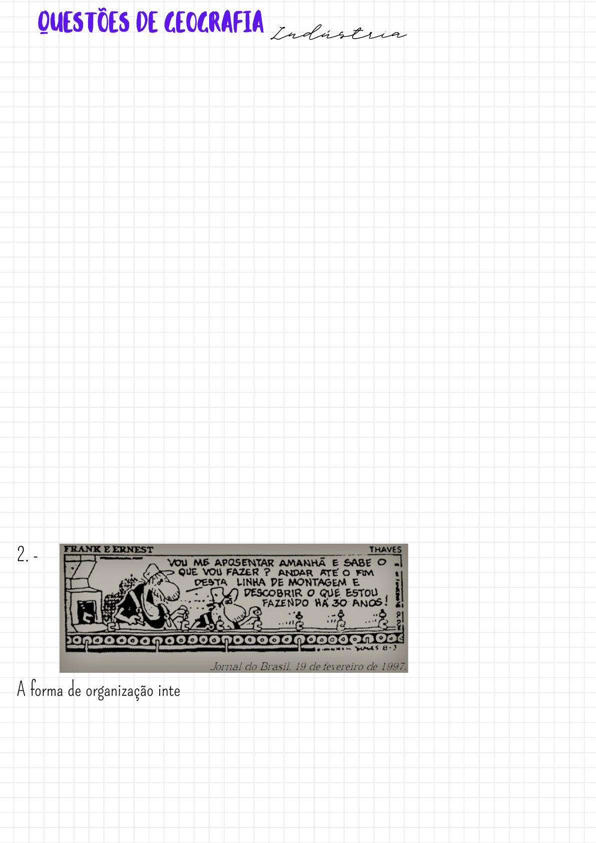 - Existe uma concorrência global, forçando redefinições constantes de produtos, processos, mercados e insumos econômicos, inclusive capital e informação. 1. CASTELLS, M. A sociedade em rede. São Paulo: Paz e Terra, 2011. Nos últimos anos do século XX, o sistema industrial experimentou muitas modificações na forma de produzir, que implicaram transformações em diferentes campos da vida social e econômica. A redefinição produtiva e seu respectivo impacto territorial ocorrem no uso da a) técnica fordista, com treinamento em altas tecnologias e difusão do capital pelo território. b) linha de montagem, com capacitação da mão de obra em países centrais e aumento das discrepâncias regionais. c) robotização, com melhorias nas condições de trabalho e remuneração em empresas no Sudeste asiático. d) produção just in time, com territorialização das indústrias em países periféricos e manutenção das bases de gestão nos países centrais. e) fabricação em grandes lotes, com transferências financeiras de países centrais para países periféricos e diminuição das diferenças territoriais. Questões de geografia Indústria 2. - A forma de organização interna da indústria citada gera a seguinte consequência para a mão de obra nela inserida: a) Ampliação da jornada diária. b) Melhoria da qualidade do trabalho. c) Instabilidade nos cargos ocupados. d) Eficiência na prevenção de acidentes. e) Desconhecimento das etapas produtivas. 4.Indústria brasileira de brinquedos estuda polo produtivo no Nordeste “A indústria brasileira de brinquedos estuda a criação de um polo produtivo na região Nordeste do país. Entre os locais em estudo estão Ceará, Pernambuco e Bahia. De acordo com o presidente da Associação Brasileira dos Fabricantes de Brinquedos (Abrinq), Synesio Batista da Costa, o objetivo é buscar vantagem competitiva para concorrer de igual para igual com os produtos importados da China. – Cerca de 80% da produção da indústria está em São Paulo, mas em três anos os principais fabricantes devem puxar os demais para o Nordeste. Quem não migrar vai morrer pelo caminho – disse o presidente da Abrinq”. Fonte: Adaptado de RIBEIRO, Erica. Extra, 22 abr. 2008. Disponível em: https://extra.globo.com/noticias/economia/industria�brasileira-de-brinquedos-estuda-polo-produtivo-no- nordeste�498997.html. Acesso em 19 set. 2017. Um fator que contribui para a desconcentração industrial no Brasil e que, atualmente, é encontrado em tradicionais centros fabris, como os de São Paulo, é: a) esgotamento dos recursos naturais. b) deficiência na infraestrutura de energia. c) elevado custo com mão de obra e impostos. d) aumento da população economicamente ativa. 3.Um carro esportivo é financiado pelo Japão, projetado na Itália e montado em Indiana, México e França, usando os mais avançados componentes eletrônicos, que foram inventados em Nova Jérsei e fabricados na Coreia. A campanha publicitária é desenvolvida na Inglaterra, filmada no Canadá, a edição e as cópias, feitas em Nova Iorque para serem veiculadas no mundo todo. Teias globais disfarçam-se com o uniforme nacional que lhes for mais conveniente. A viabilidade do processo de produção ilustrado pelo texto pressupõe o uso de a) linhas de montagem e formação de estoques. b) empresas burocráticas e mão de obra barata. c) controle estatal e infraestrutura consolidada. d) organização em rede e tecnologia da informação. e) gestão centralizada e protecionismo econômico. 1. D 2. E 3. D 4.C gabarito
