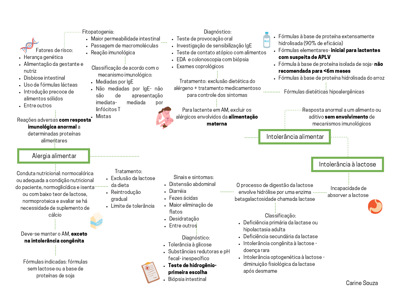 Intolerância e alergia alimentar Intolerância alimentar Alergia alimentar Reações adversas com resposta imunológica anormal a determinadas proteínas alimentares Intolerância à lactose Incapacidade de absorver a lactose O processo de digestão da lactose envolve hidrólise por uma enzima betagalactosidade chamada lactase Distensão abdominal Diarréia Fezes ácidas Maior eliminação de flatos Desidratação Entre outros Sinais e sintomas: Herança genética Alimentação da gestante e nutriz Disbiose intestinal Uso de fórmulas lácteas Introdução precoce de alimentos sólidos Entre outros Fatores de risco: Maior permeabilidade intestinal Passagem de macromoléculas Reação imunológica Fitopatogenia: Tratamento: exclusão dietética do alérgeno + tratamento medicamentoso para controle dos sintomas Fórmulas dietéticas hipoalergênicas Exclusão da lactose da dieta Reintrodução gradual Limite de tolerância Tratamento: Tolerância à glicose Substâncias redutoras e pH fecal- inespecífico Teste de hidrogênio- primeira escolha Biópsia intestinal Diagnóstico: Deficiência primária da lactase ou hipolactasia adulta Deficiência secundária da lactase Intolerância congênita à lactose - doença rara Intolerância optogenética à lactose - diminuição fisiológica da lactase após desmame Classificação: Fórmulas à base de proteína extensamente hidrolisada (90% de eficácia) Fórmulas elementares- inicial para lactentes com suspeita de APLV Fórmula à base de proteína isolada de soja- não recomendada para <6m meses Fórmulas à base de proteína hidrolisada do arroz Resposta anormal a um alimento ou aditivo sem envolvimento de mecanismos imunológicos Conduta nutricional: normocalórica ou adequada a condição nutricional do paciente, normoglicídica e isenta ou com baixo teor de lactose, normoproteica e avaliar se há necessidade de suplemento de cálcio Deve-se manter o AM, exceto na intolerância congênita Fórmulas indicadas: fórmulas sem lactose ou a base de proteínas de soja Mediadas por IgE Não mediadas por IgE- não são de apresentação imediata- mediada por linfócitos T Mistas Classificação de acordo com o mecanismo imunológico: Teste de provocação oral Investigação de sensibilização IgE Teste de contato atópico com alimentos EDA e colonoscopia com biópsia Exames coprológicos Diagnóstico: Para lactente em AM, excluir os alérgicos envolvidos da alimentação materna Carine Souza