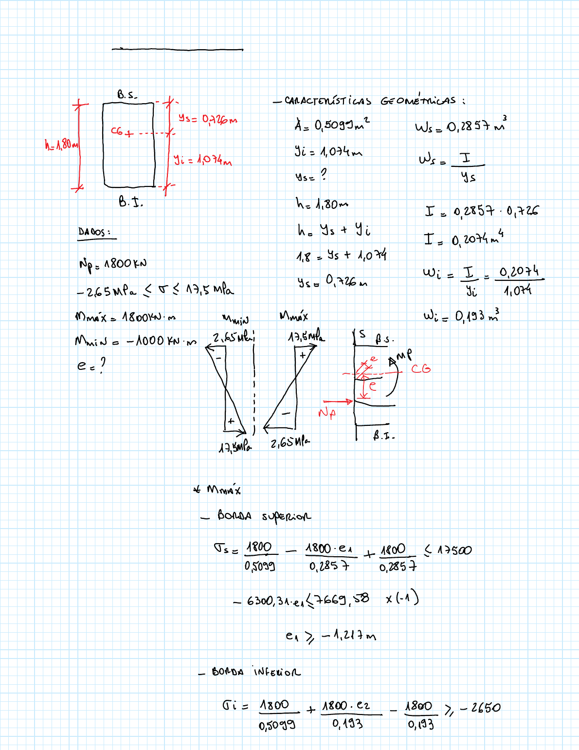 Determinar o intervalo possível de excentricidades para a força de protensão Np = 1800kN de maneira que a tensão normal no concreto em uma seção transversal dada fique entre o intervalo de -2,65 a 17,5MPa. Considerar para os valores das características geométricas da seção: A = 0,5099m²; yi = 1,074m; h = 1,80m; Ws = 0,2857m³; usar para os valores de momentos máximo e mínimo, os valores de 1800kNm e -1000kNm, respectivamente. Ex5 terça-feira, 24 de agosto de 2021 21:04 Página 1 de CP_AN_NOT Página 2 de CP_AN_NOT