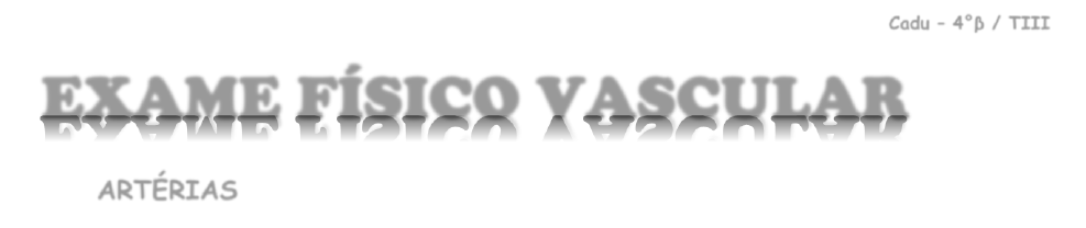Cadu – 4°β / TIII ARTÉRIAS EXAME CLÍNICO - ALTERAÇÕES DA COR DA PELE • Fatores que influenciam - Fluxo sanguíneo. - Grau de oxigenação da hemoglobina. - Presença de melanina. • Nas doenças arteriais, as alterações da pele compreendem palidez, cianose, eritrocianose, rubor e o fenômeno de Raynaud. - A palidez aparece quando há diminuição acentuada do fluxo sanguíneo no leito cutâneo, como ocorre na oclusão e no espasmo arterial. - Surge cianose quando o fluxo de sangue no leito capilar se toma muito lento, provocando consumo de quase todo o oxigênio, com consequente aumento da hemoglobina reduzida. - A eritrocianose, coloração vermelho-arroxeada que ocorre nas extremidades dos membros com isquemia intensa, aparece no estágio de pré-gangrena, sendo consequência da formação de circulação colateral com dilatação de capilares arteriais e venosos, última tentativa do organismo para suprir as necessidades de oxigênio dos tecidos. - O rubor ocorre principalmente nas doenças vasculares funcionais e se deve à vasodilatação arteriolocapilar. - O livedo reticular é uma alteração da coloração da pele caracterizada por uma cianose em modo de rede, circundando áreas de palidez. - ALTERAÇÃO DA TEMPERATURA DA PELE • Fator que influencia - Fluxo sanguíneo. - ALTERAÇÕES TRÓFICAS • São elas - Atrofia da pele. - Diminuição do tecido subcutâneo. - Queda de pelos. - Alterações ungueais (atrofia, unhas quebradiças ou hiperqueratósicas). - Calosidades. - Lesões ulceradas de difícil cicatrização. - Edema. - Sufusões hemorrágicas. - Bolhas. - Gangrena. • Lesões bolhosas na pele e trombose capilar, reconhecível à digito compressão, influenciam fortemente os critérios para indicação de amputação de membros. • Gangrena é a morte de tecidos em consequência de isquemia intensa, aguda ou crônica. - A gangrena úmida tem limites imprecisos, é dolorosa e se acompanha de edema e sinais inflamatórios. Surge no diabetes, na tromboangiite obliterante, na trombose venosa profunda - A gangrena seca ocorre principalmente na arteriosclerose obliterante periférica, podendo ser vista também na evolução tardia das oclusões arteriais agudas. - Na gangrena gasosa há aporte de oxigênio, mas as células não conseguem aproveitá-lo devido às endotoxinas bacterianas. • Edema precisa avaliar a localização, a duração e a evolução. EXAME FÍSICO - ETAPAS • Inspeção. • Palpação. • Ausculta. • Medida da PA nos 4 membros. • Manobras especiais. - INSPEÇÃO - Paciente de pé ou deitado. EXAME FÍSICO VASCULAR Cadu – 4°β / TIII - Observar eventuais batimentos arteriais que podem sugerir hipertensão arterial, arteriosclerose, aneurisma ou fístula arteriovenosa. • Alterações de coloração. • Assimetria de membros. • Assimetria de grupos musculares. • Alterações ungueais. • Ulcerações. • Calosidades. • Gangrenas. • Micoses interdigitais. - PALPAÇÃO • Fatores avaliados - Temperatura. - Elasticidade. - Umidade. - Tumorações. - Infiltração da derme e do tecido subcutâneo. - Manifestação de frêmito nos trajetos arteriais ou sobre tumoração. - Pulsatilidade das artérias e endurecimento de suas paredes. • Temperatura - Comparar áreas homólogas. - Usar dorso da mão ou os dedos. • Elasticidade da pele - Pinçar uma dobra da pele com a polpa dos dedos indicador e polegar, avalia-se sua consistência e a mobilidade sobre os planos profundos. • Umidade da pele - Com o dorso das mãos ou com as polpas digitais. • Frêmito - Varia de acordo com o grau de estenose ou dilatação e com a velocidade do fluxo sanguíneo. - Pode ficar mais nítido ao solicitar que o paciente faça algum exercício com o membro afetado. - Frêmito sistólico ocorre nas estenoses e nos aneurismas. - Frêmito contínuo ocorre nas fístulas arteriovenosas. • Pulso - Detectar diminuição ou ausência de pulso, viabilizando o diagnóstico de estenose ou oclusão. - Artérias acessíveis: carótida comum, temporal superficial, facial e nasal, subclávia, braquial, radial, cubital, aorta abdominal, ilíaca externa, femoral comum, poplítea, tibial anterior, dorsal do pé, tibial posterior e digitais das mãos e dos pés. Cadu – 4°β / TIII • Pulso radial - Em condições normais, a parede do vaso não apresenta tortuosidades e é facilmente depressível. - Manobra de Osler: palpação da artéria radial após insuflação do manguito acima da pressão sistólica. É positiva quando a artéria permanece palpável, mas sem pulsações. Frequentemente positiva em idosos. Classicamente, é considerada uma indicação de pseudo-hipertensão arterial. - Frequência: contar sempre o número de pulsações durante um minuto inteiro, comparando-se este valor com o número de batimentos cardíacos. 60 – 100. - Déficit de pulso: número de batimentos cardíacos é maior que o número das pulsações da artéria radial. - Ritmo: dado pela sequência das pulsações. Se elas ocorrem em intervalos iguais, diz-se que o ritmo é regular. Se os intervalos são variáveis, trata-se de ritmo irregular. - Amplitude ou magnitude: é avaliada pela sensação captada em cada pulsação e está diretamente relacionada com o grau de enchimento da artéria durante a sístole e seu esvaziamento durante a diástole. Classifica-se o pulso em amplo ou magnus, mediano e pequeno ou parvus. - Tensão ou dureza: pela compressão progressiva da artéria. Se for pequena a pressão necessária para interromper as pulsações, caracteriza-se pulso mole. Ao contrário, se a interrupção da onda sanguínea exigir forte pressão, trata-se de pulso duro. Denomina- se a situação intermediária de tensão mediana. - Tipos de onda. - Comparação com a artéria homóloga: igualdade ou desigualdade dos pulsos radiais, palpando simultaneamente as 2 artérias radiais. Deste modo, procura-se comparar a amplitude das pulsações. - AUSCULTA - Perceber 
