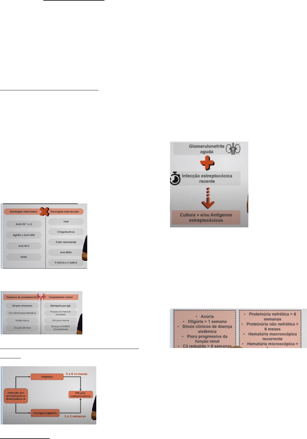 SINDROME NEFRITICA Síndrome nefrítica é um conjunto de sinais e sintomas que surgem quando há evidência de “inflamação” dos glomérulos Infiltrado de células, exsudato , alças capilares cheias de infiltrados inflamatórios QUADRO CLINICO TRIADE: EDEMA,HAS e HEMATURIA Hematuria dismorficaehemacia se “deforma”pra passar pelo glomerulo .Proteinuria,Azotemia,Oliguria,Cilindros Hematicos DIAGNOSTICO Urina 1,Proteinuria de 24 horas ( > 3,5 g/dia), Funcao Renal, Proteinas Totais e frações ( Albumina ) Sorologias Virais, Sorologias Auto imunes, Paraproteinemia, Complementos ETIOLOGIAS GLOMERULONEFRITE POS ESTREPTOCICA/DIFUSA AGUDA Reacao cruzadaantigenos da bactéria podem parecer com antígenos do glomérulo, corpo combate a bactéria mas depois de algumas semanas ataca o rim do paciente, causando glomerulonefrite pos estreptocócica QUADRO CLINICO Sintomas de síndrome nefritica, alterações urinarias assintomáticas, podem ter glomerulonefrite rapidamente progresiva ( se não tratada rapidamente o paciente vira DRC após lesao aguda ), emergências hipertensivas DIAGNOSTICO Realizar ASLO ( cultura não adianta pois o corpor provavelmente já eliminou a bactéria causadora ) Queda do complemento ( C3 e CH 50 ) *Doença é auto limitada ( ficar atento a duração de sinais e sintomas do paciente BIOPSIA RENAL A biópsia renal está indicada quando existe uma manifestação clínica não clássica e que deixa dúvidas no diagnóstico Microscopia optica infiltrado exsudativo endocapilar Microscopia eletrônica achado patognomonico – Depositos subepiteliais ( corcovas/humps ) TRATAMENTO ATB PENICILINAS ( não trata GNPE, eliminar sepa nefritogenica ,pra não passar pra outras pessoas ) Tratamento é de suporte restringir Sodio, Diuretico de Alca se paciente hipertenso ou com edema ( furosemida ), anti hipertensivos se pacientes continuar hipertenso com as outras medidas NEFROPATIA POR IgA / Glomerulonefrite Sinfaringitica Glomerulopatia mais comum IgA se deposita no mesangio e desenvolve o processo inflamatório paciente tem faringite /ivas e faz a nefropatia por IgA ( CONCOMITANTE A INFECCAO ) QUADRO CLINICO Hematuria macroscópica intermitente( bom prognostico ),hematuria microscópica persistente ( prognostico pior, já perde um pouco mais de função renal ), forma severa paciente se apresenta com síndrome nefrotica ou GNRP DIAGNOSTICO Biopsia renal encontra IgA no mesangio ( já faz o diagnostico ), não faz biopsia em todo mundo , realizar apenas quando tem marcador de mau prognósticos ( proteinuria > 1g/dia, creatinina elevada, HAS ) TRATAMENTO Hematuria isolada acompanhamento semestral Hematuria +Proteinuria <1g/dia IECA ou BRA Hematuria + Proteinuria >1g/dia Prednisona + IECA/BRA SIndrome nefrotica ou creatinina elevada ou sinais de gravidade na biopsia renal Pulsoterapia com metilprednisolona+ciclofosfamida