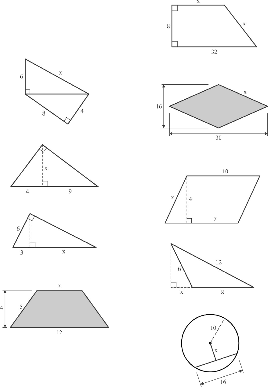 MA092 – Geometria plana e analítica Segundo semestre de 2016 Quinta lista de exercícios. Triângulos retângulos. Polígonos regulares. Áreas de superfícies planas. 1. Qual deve ser o comprimento de uma escada para que, quando encostada a uma parede, seu topo atinja 2,4 m de altura quando sua base está a 0,7 m da parede? 2. (Dolce/Pompeo) Determine x. 3. (Dolce/Pompeo) Determine x. 4. (Dolce/Pompeo) Determine x. 5. (Dolce/Pompeo) Sabendo que o trapézio abaixo é isósceles, determine x. 6. (Dolce/Pompeo) Determine x 7. (Dolce/Pompeo) Determine x no losango abaixo. 8. (Dolce/Pompeo) Determine x no paralelogramo abaixo. 9. (Dolce/Pompeo) Determine x 10. (Dolce/Pompeo) Determine x 11. (Dolce/Pompeo) Determine x 12. (Dolce/Pompeo) Determine a diagonal de um quadrado de perímetro 20 m. 13. (Dolce/Pompeo) O perímetro de um losango é 52 m e uma diagonal mede 10 m. Determine a outra diagonal. 14. (Dolce/Pompeo) Determine a altura de um triângulo equilátero de perímetro 24 m. 15. (Dolce/Pompeo) O perímetro de um triângulo isósceles é 18 m e a altura relativa à base mede 3 m. Determine a base. 16. (Dolce/Pompeo) As bases de um trapézio retângulo medem 3 m e 9 m e o seu perímetro é igual a 30 m. Calcule a altura. 17. (Dolce/Pompeo) Dois ciclistas partem da praça de uma mesma cidade em direção reta. Um segue na direção leste e o outro vai para o norte. Determine a distância que os separa depois de duas horas, sabendo que o primeiro viajou a uma velocidade de 30 km/h, enquanto o segundo pedalou a 45 km/h. 18. Adaptado de Dolce/Pompeo) Considere os dois círculos tangentes mostrados na figura. Sabendo que o quadrado tem lado de 2 cm, determine o raio do círculo menor. 19. Dado o triângulo, determine a, m, n e h. 20. Determine a altura h de um triângulo equilátero de lado x. 21. A base de um triângulo isósceles mede 10 cm e sua altura mede 12 cm. Quanto medem os outros lados do triângulo? 22. Em um triângulo isósceles, a altura (referente ao lado diferente dos demais) mede 1 cm e o perímetro é igual a 4 cm. Determine as medidas dos lados. Dica: faça um desenho que ilustre a situação. 23. Dado o triângulo abaixo, determine a altura relativa ao lado cuja medida é 4. Dica: aplique duas vezes o teorema de Pitágoras. 24. Dois navios partem ao mesmo tempo, de um mesmo porto, em direções perpendiculares, a velocidades constantes. O primeiro barco viaja a 18 km/h e o segundo a 24 km/h. Qual a distância entre os barcos depois de decorridos trinta minutos da partida? 25. Um dos catetos de um triângulo retângulo mede 8 cm. Sabendo que o perímetro do triângulo é igual a 24 cm, determine o raio da circunferência que o circunscreve. 26. Um carpinteiro foi contratado para construir uma cerca formada por ripas de madeira. A figura abaixo apresenta uma vista parcial da cerca. Quantos metros de ripa são necessários para construir uma cerca com 300 m de comprimento? 27. Determinar o diâmetro da circunferência mostrada na figura abaixo, sabendo que 𝐴𝐴𝐴𝐴���� = 16, 𝐴𝐴𝐵𝐵���� = 30 e 𝐵𝐵𝐶𝐶���� = 15. 28. A planta de um cômodo que tem 2,7 m de altura é mostrada abaixo. Um eletricista deseja instalar um fio para conectar uma lâmpada, localizada no centro do teto do cômodo, ao interruptor, situado a 1,0 m do chão, e a 1,0 m do canto do cômodo, como está indicado na figura. Supondo que o fio subirá verticalmente pela parede, e desprezando a espessura da parede e do teto, determine o comprimento mínimo de fio necessário para conectar o interruptor à lâmpada. 29. (Ivan) Na figura abaixo, os quadrados são iguais e têm lado correspondente a 100 km. Um avião sai da cidade A, faz escala em C, e chega na cidade B. Supondo que o avião voe em linha reta em cada trecho, determine a distância percorrida de A até B, passando por C. 30. Dado o triângulo abaixo, determine b, m, n e h. 31. (OBMEP) O hexágono regular ABCDEF tem 1 cm2 de área. Os prolongamentos de seus lados determinam seis novos pontos A’, B’, C’, D’, E’ e F’, conforme mostra a figura. a) Determine a área do triângulo BCC’, destacado em cinza. b) Determine a área do hexágono A’B’C’D’E’F’. 32. (OBMEP) Uma caixa retangular tem dimensões 60 cm × 24 cm × 24 cm. Uma aranha e uma mosca estão, respectivamen- te, nos pontos A e B da caixa. A aranha está a uma distância de 2 cm da base, enquanto a mosca está a uma distância de 2 cm do topo, mas ambas estão à mesma distância das outras duas faces laterais. Andando sobre a superfície da caixa, a aranha pode percorrer vários caminhos para chegar à mosca. Determine a distância que a aranha irá percorre seguindo cada um dos caminhos abaixo. a) b) c) 33. (Dolce/Pompeo) Determine as medidas dos ângulos x, y e z indicados na figura, sabendo que o hexágono é regular. 34. (Dolce/Pompeo) Determine as medidas dos ângulos x, y e z indicados na figura, sabendo que o pentágono é regular. 35. A figura abaixo mostra um octógono regular. Determine 𝜶𝜶 e 𝜷𝜷. 36. Determine o polígono regular cujos ângulos internos medem 140°. 37. Calcule o ângulo interno do polígono regular que tem 90 diagonais. 38. Dado um círculo de raio R, calcule a razão entre o lado do quadrado inscrito e o lado do quadrado circunscrito ao círculo. (Dica: faça um desenho que ilustre a situação.) 39. Determine o perímetro de um hexágono regular circunscrito a uma circunferência de raio igual a 3√3 cm. 40. A distância entre dois lados paralelos de um hexágono regular é 2√3 cm. Determine a medida do lado do hexágono. 41. Determine o raio da circunferência circunscrita ao triângulo equilátero de lado 15 cm. 42. Determine o lado do triângulo equilátero cuja circunferência inscrita tem raio 6 cm. 43. A circunferência inscrita em um hexágono tem raio 9 cm. Determine o raio da circunferência circunscrita ao hexágono. 44. O raio da circunferência circunscrita a um 