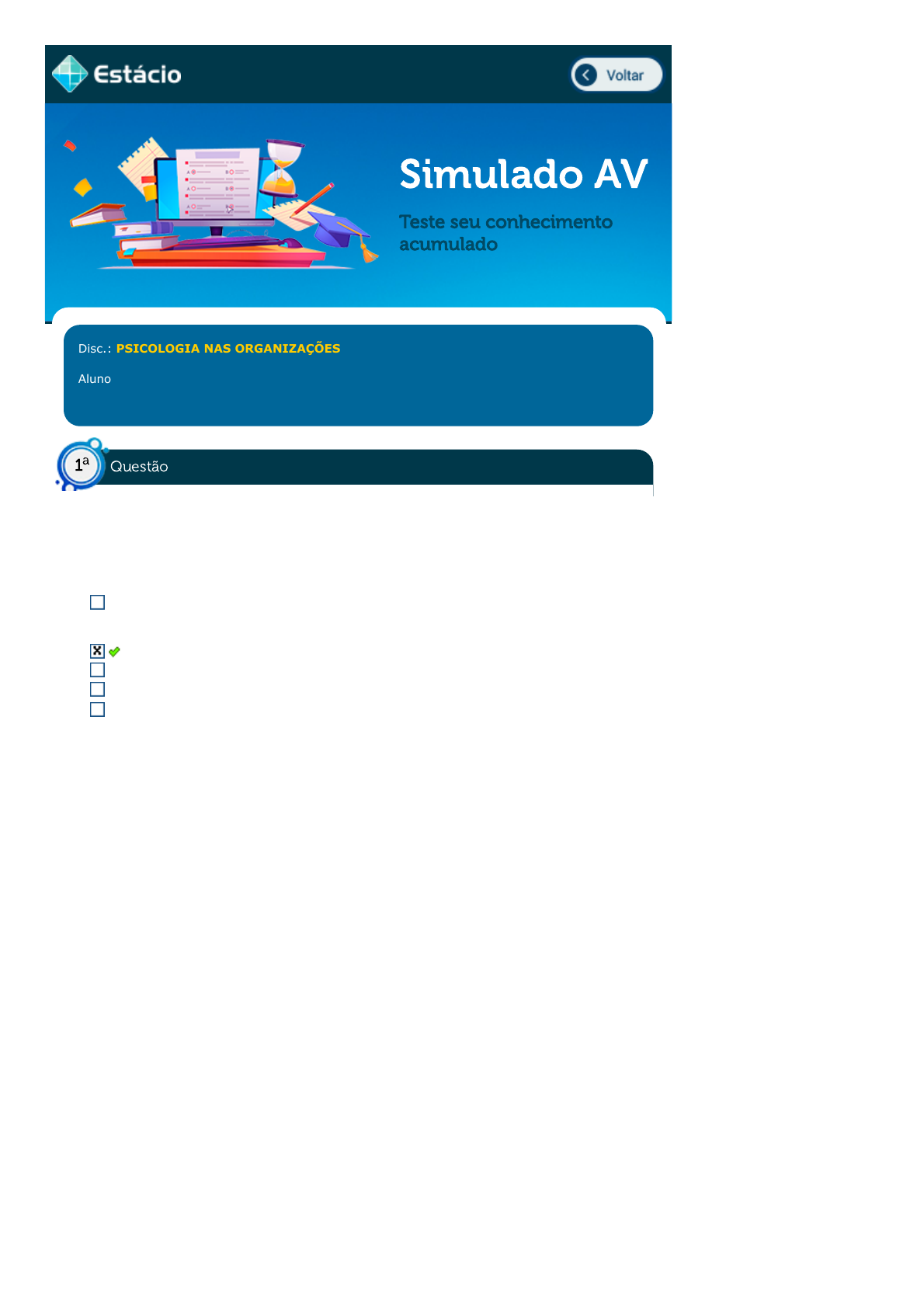 02/11/2021 13:36 Estácio: Alunos https://simulado.estacio.br/alunos/ 1/1 Simulado AV Teste seu conhecimento acumulado Disc.: PSICOLOGIA NAS ORGANIZAÇÕES Aluno(a): LETÍCIA ALINE LEITE RIBEIRO 201903391271 Acertos: 8,0 de 10,0 02/11/2021 Acerto: 1,0 / 1,0 O senso comum tem sua forte influência nos estudos sobre o comportamento humano. Deve-se considerar que algumas variáveis que afetam o comportamento humano são: I- Personalidade; II- Percepção; III- Fatores Ambientais; IV Opinião alheia. Assinale a alternativa que aponta os fatores que afetam o comportamento humano. II e III I, II, III I, II e IV II, III e IV I e II Respondido em 02/11/2021 12:58:32 Questão1 a https://simulado.estacio.br/alunos/inicio.asp javascript:voltar();