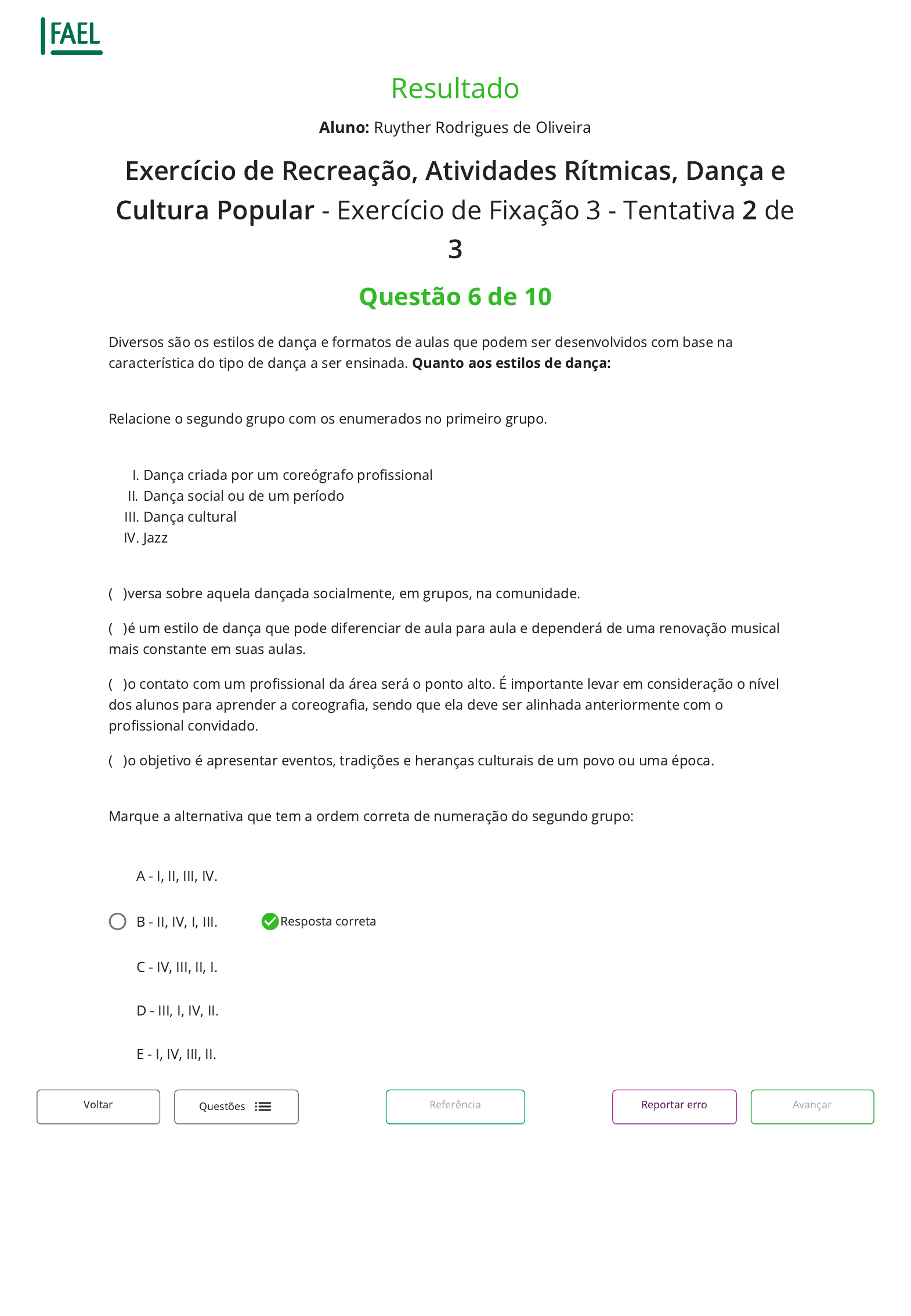 Resultado Aluno: Ruyther Rodrigues de Oliveira Exercício de Recreação, Atividades Rítmicas, Dança e Cultura Popular - Exercício de Fixação 3 - Tentativa 2 de 3 Questão 6 de 10 Diversos são os estilos de dança e formatos de aulas que podem ser desenvolvidos com base na característica do tipo de dança a ser ensinada. Quanto aos estilos de dança: Relacione o segundo grupo com os enumerados no primeiro grupo. I. Dança criada por um coreógrafo pro�ssional II. Dança social ou de um período III. Dança cultural IV. Jazz ( )versa sobre aquela dançada socialmente, em grupos, na comunidade. ( )é um estilo de dança que pode diferenciar de aula para aula e dependerá de uma renovação musical mais constante em suas aulas. ( )o contato com um pro�ssional da área será o ponto alto. É importante levar em consideração o nível dos alunos para aprender a coreogra�a, sendo que ela deve ser alinhada anteriormente com o pro�ssional convidado. ( )o objetivo é apresentar eventos, tradições e heranças culturais de um povo ou uma época. Marque a alternativa que tem a ordem correta de numeração do segundo grupo: A - I, II, III, IV. B - II, IV, I, III. Resposta correta C - IV, III, II, I. D - III, I, IV, II. E - I, IV, III, II. Voltar Questões Referência Reportar erro Avançar http://firequiz.fael.edu.br/prova?question_number=5 http://firequiz.fael.edu.br/prova/questoes