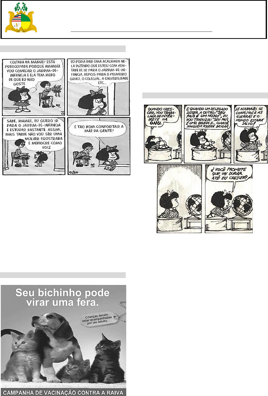 QUESTÃO 01 Leia o texto e, a seguir, responda. Disponível em:<http://tirasdemafalda. tumblr.com/image/1168871 55>. Acesso em: 06 ago. 2016 No texto ao associar a linguagem verbal e não verbal conclui-se que (A) a mãe da menina ficou desconsolada ao ouvir os motivos de a menina querer estudar bastante. (B) a menina demonstrou-se insensível diante da preocupação da mãe que tinha medo de ela não gostar de estudar. (C) a menina confortou sua mãe ao dizer suas pretensões de estudar bastante. (D) a mãe da menina estava com pena de a filha começar a estudar. (E) a menina desconhecia a importância de estudar. QUESTÃO 02 Leia o texto abaixo e responda. Disponível em: <http://www.novaserrana.mg.gov.br/imagens/371/ imagens_2720091816350.jpg>. Acesso em: 15 jan. 2011. De acordo com esse texto, cães e gatos (A) devem ser cuidados por um adulto. (B) devem ser vacinados. (C) podem transmitir doenças às crianças. (D) precisam conviver juntos. (E) são animais perigosos. QUESTÃO 03 Leia o texto e, a seguir, responda. Disponível em: <http://raizasas.blogspot.com.br/2011/09/ mafalda-completa-47-anos.html>. Acesso em: 03 fev. 2016. A leitura do último quadrinho permite afirmar que Mafalda (A) pretende trabalhar de intérprete na ONU. (B) quer propor um acordo de paz para o mundo. (C) deseja amenizar os conflitos e as guerras do mundo. (D) teme que o mundo acabe antes de ela se tornar adulta. (E) quer tornar-se adulta em um mundo sem conflitos e guerras. CENTRO DE ENSINO JOÃO PAULO I ÁREA DO CONHECIMENTO: LINGUAGENS E SUAS TECNOLOGIAS COMPONENTE CURRICULAR: LÍNGUA PORTUGUESA SÉRIE: 2º ANO; TURMAS: 201; VESPERTINO PROFESSOR: THIAGO SABINO ALUNO (A): http://tirasdemafalda/ http://www.novaserrana.mg.gov.br/imagens/371/ http://www.novaserrana.mg.gov.br/imagens/371/ http://raizasas.blogspot.com.br/2011/09/ QUESTÃO 04 Leia o texto abaixo e, a seguir, responda. Disponível em:<http://essaseoutras.xpg.uol.com.br/melhores- charges-engraçadas-de-2011-criticas-a-politica-violencia/charge- critica-2011>. Acesso em: 24 nov. 2015. Nessa charge, o que é criticado? (A) A preocupação com o aquecimento global. (B) Os problemas ambientais causados pelo homem. (C) O vandalismo praticado contra um bem comum. (D) O descaso das autoridades contra a violência urbana. (E) O desrespeito às leis de preservação do meio ambiente. QUESTÃO 05 Leia o texto abaixo. Esse texto é direcionado, principalmente, aos (A) jovens indecisos na escolha da profissão a seguir. (B) profissionais que atuam no direcionamento profissional. (C) pais que querem decidir a profissão dos filhos. (D) professores comprometidos com o futuro profissional dos alunos. (E) profissionais que buscam recolocação no mercado. QUESTÃO 06 Leia a charge para responder à questão. (www.a charge.com.br) Considerando-se o contexto apresentado na charge, é correto afirmar que (A) se mostra a tecnologia estendida a todos os grupos da sociedade, que a utilizam bem, já que os usuários não subestimam seu potencial. (B) se define o avanço tecnológico do país levando em consideração, principalmente, a política pública para o acesso a esse tipo de bem. (C) se estabelece uma relação paradoxal entre os avanços obtidos na área tecnológica e as condições de vida a que está sujeita expressiva parcela da população. (D) se pode entender como positiva a nova relação do homem com as máquinas, já que elas tiram expressiva parcela da população de condições aviltantes de vida. (E) se veem a criticidade e o bom senso de grande parte da população menos favorecida para o uso adequado das novas tecnologias no cotidiano. http://essaseoutras.xpg.uol.com.br/melhores- http://essaseoutras.xpg.uol.com.br/melhores- QUESTÃO 01 No texto ao associar a linguagem verbal e não verbal conclui-se que QUESTÃO 02 QUESTÃO 03 A leitura do último quadrinho permite afirmar que Mafalda QUESTÃO 04 Nessa charge, o que é criticado? QUESTÃO 05 QUESTÃO 06