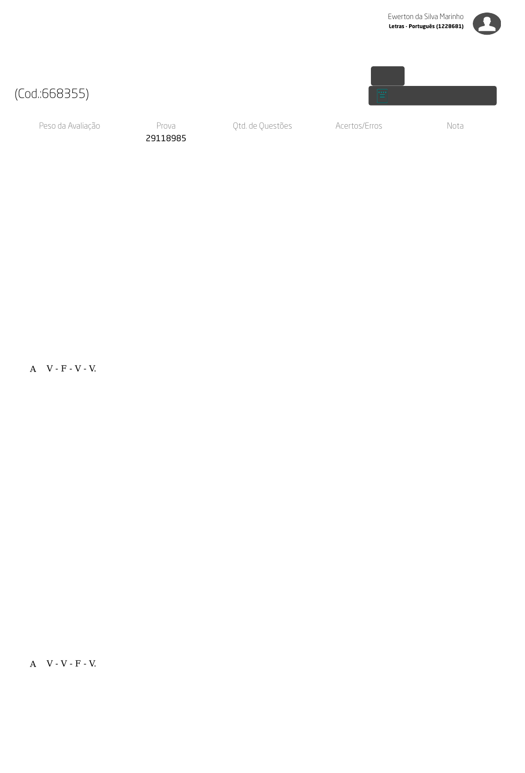 GABARITO | Avaliação Final (Objetiva) - Individual Semipresencial (Cod.:668355) Peso da Avaliação 3,00 Prova 29118985 Qtd. de Questões 12 Acertos/Erros 12/0 Nota 10,00 A filosofia possui um papel importante na formação do profissional contemporâneo. No cotidiano e no encontro com as pessoas, realizamos diversas atividades, entre elas, trabalhamos, estudamos, desfrutamos de lazer e compras e construímos cidades. Muitas vezes, não nos atentamos a todas as essas realizações, pois agimos de forma mecânica, sem consciência diante dos afazeres do dia a dia. Sobre as dimensões em que a filosofia poderá contribuir na formação do profissional contemporâneo, classifique V para as sentenças verdadeiras e F para as falsas: ( ) Ampliar os conhecimentos inerentes das disciplinas. ( ) Criar padrões para consumo, lazer, trabalho, educação, avaliação e características culturais. ( ) As condições da técnica e da tecnologia inerentes à formação profissional. ( ) Construir caminhos de ligação entre conhecimentos antes isolados ou fragmentados, como ética, ciência, política, pesquisa, sociedade e história. Assinale a alternativa que apresenta a sequência CORRETA: A V - F - V - V. B F - V - V - F. C F - F - V - V. D V - V - F - V. A perspectiva intercultural surge da necessidade de dar um novo rumo ao que propõe o monoculturalismo, que defende a ideia do compartilhamento dos povos em uma mesma cultura. A perspectiva intercultural emerge da complexidade de atuar nos conflitos entre o monoculturalismo. Sobre o exposto, classifique V para as sentenças verdadeiras e F para as falsas: ( ) A cultura e o contexto oferecem os símbolos que se conectam com o sistema nervoso do indivíduo no momento da aprendizagem. ( ) A cultura e o contexto de diferentes sistemas simbólicos se conectam com o sistema nervoso do indivíduo no momento da aprendizagem. ( ) A cultura e o contexto não oferecem os símbolos que se conectam com o sistema nervoso do indivíduo no momento da aprendizagem. ( ) A perspectiva intercultural emerge da complexidade de atuar nos conflitos entre o monoculturalismo. Assinale a alternativa que apresenta a sequência CORRETA: A V - V - F - V. B V - F - V - F. C F - F - V - V. D F - V - V - F. VOLTAR A+ Alterar modo de visualização 1 2 Ewerton da Silva Marinho Letras - Português (1228681) AVA https://ava2.uniasselvi.com.br/subject/grades-and-tests... 1 of 5 04/11/2021 05:59 secinfor Highlight secinfor Highlight secinfor Highlight secinfor Highlight secinfor Highlight secinfor Highlight povos. As sociedades "tribais" (ou "primitivas") seriam, para eles, "sociedades tradicionais" - não só as regras de conduta eram pautadas rigidamente pelo costume, como esse costume era transmitido, oralmente e de forma imutável, de geração a geração, desde o princípio dos tempos. Os europeus não admitiam que os africanos pudessem refletir criticamente sobre a sua própria cultura. Sobre as relações étnicas no Brasil, classifique V para as sentenças verdadeiras e F para as falsas: ( ) O resultado sociopolítico dessa visão estereotipada ainda hoje pode ser observado com relação à população afro-brasileira. ( ) Os conflitos raciais resultam de esteriótipos sociais, e não de fatos científicos. ( ) Um indivíduo etnocêntrico não tem capacidade de observar outras culturas nas próprias condições em que elas se mostram. ( ) O consenso absoluto não existe em diferentes culturas. Assinale a alternativa que apresenta a sequência CORRETA: A V - F - F - F. B V - V - V - F. C F - F - V - V. D F - V - F - V. As políticas públicas podem ser definidas como um conjunto de ações do governo destinadas a atender determinada demanda ou problemática. Uma das problemáticas existentes em nosso contexto vem sendo garantida na Lei nº 10.436/02. Sobre o que diz a Lei, analise as afirmativas a seguir: I- Estabelece que a Língua Brasileira de Sinais é um meio legal de comunicação e expressão. II- Determina que seja institucionalizada e difundida a Língua Brasileira de Sinais, como também sua inclusão como disciplina nos cursos de formação de professores e de fonoaudiologia. III- Torna obrigatório o ensino de disciplina de Libras, em todas as modalidades de ensino. Assinale a alternativa CORRETA: FONTE: Disponível em: . Acesso em: 3 maio 2018. A Somente a afirmativa I está correta. B As afirmativas I e III estão corretas. C Somente a afirmativa III está correta. D As afirmativas I e II estão corretas. Trata-se de um programa com intuito de resgatar a cultura, pois é considerado um patrimônio da história mundial. A valorização desta cultura é uma questão de inclusão, de ética e compromisso com gerações castigadas pela discriminação. Por conta disso, tais programas desenvolvidos pelo governo tentam suprir essa "deficiência" nas escolas. Sobre esse programa, assinale a alternativa CORRETA: A Programa de desenvolvimento do cidadão. B O pacto contra desigualdades sociais. C O Programa Ética e Cidadania. D O programa da etnicidade e orientação. 4 5 Ewerton da Silva Marinho Letras - Português (1228681) AVA https://ava2.uniasselvi.com.br/subject/grades-and-tests... 2 of 5 04/11/2021 05:59 secinfor Highlight secinfor Highlight secinfor Highlight secinfor Highlight secinfor Highlight elas. Temos um grande número de informações sem precedência que causam grandes problemas de interpretação. Para tanto, o professor precisa ser preparado para interagir e dialogar com seus alunos em situações fora dos muros da escola, em realidades externas e em mundos virtuais, como as redes sociais. Sobre os desafios do professor frente às demandas atuais, classifique V para as sentenças verdadeiras e F para as falsas: ( ) Estimular constantemente os alunos a se envolverem em equipes de trabalho, pesquisa e a ressignificar seu conhecimento. ( ) Atualizar-se e reconstruir-se sempre. ( ) Oferecer um caminho para o estudante superar os desafios de sua existên