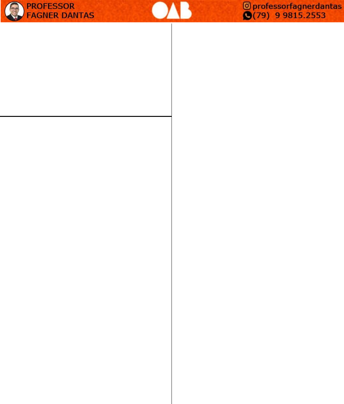 AULA 03 – PEÇA PROCESSUAL + QUESTÕES CASO PRÁTICO 01: Clodovil da Silva, brasileiro, foi contratado pela empresa Globo Ltda no dia 01/04/14 na função de motociclista. Trabalhava de segunda à sexta, das 13 às 22hs, com 1 hora de intervalo e aos sábados das 8 às 13horas, com intervalo da lei, sendo que o descanso semanal remunerado era sempre aos domingos e não havia labor aos feriados. Frise-se que Clodovil era deficiente e recebia somente seu salário mensal. Em 01/08/2016, ao se recusar a cumprir uma ordem manifestamente ilegal do empregador, Clodovil foi xingado de viado, boiola, baitola, bicha e frutinha na frente dos demais funcionários, situação que caracteriza ofensa grave. No mesmo dia, sem aguentar o constrangimento, Clodovil que mora de favor em um quartinho nos fundos da casa de um amigo, procurou você para, na qualidade de advogado adorar a medida processual cabível. QUESTÕES SUBJETIVAS (PARTE 01) 1) OAB XXI - Marcília e Jonas foram contratados como aprendizes de marceneiro na sociedade empresária Madeira de Ouro S.A., pelo período de 2 anos, sendo cumpridas todas as formalidades legais. Ambos revelaram bom desempenho nas tarefas e aprenderam a técnica necessária para serem futuros marceneiros. Porém, por diversas vezes e de forma injustificada, Jonas não compareceu à escola e, em função disso, acabou reprovado. Já Marcília, nos 30 dias anteriores ao término do seu contrato de prendizagem, engravidou e deu ciência disso ao empregador. Com base na situação retratada, na previsão legal e no entendimento do TST, responda aos itens a seguir. (A) Ao término do contrato de aprendizagem, Marcília poderá ser afastada? (Valor: 0,65) (B) Como repercute, no contrato de Jonas, a perda do ano letivo na escola em razão das faltas injustificadas? (Valor: 0,60) 2) OAB XX exame - Um determinado empregado sofreu um acidente fora do local de trabalho, recebeu auxílio doença comum (B-31), e permaneceu afastado da empresa por 6 meses. Três meses após o seu retorno, o empregado foi dispensado e, em razão disso, ajuizou reclamação trabalhista com pedido de reintegração, afirmando que a sua garantia no emprego foi violada. De acordo com os dados apresentados e com a legislação em vigor, responda aos itens a seguir. A) Informe que tese você, contratado como advogado da empresa, sustentaria contrariamente ao pedido de reintegração. (Valor: 0,65) B) Caso o empregado tivesse alguma deficiência por conta do acidente sofrido, analise se ele poderia usar o FGTS para compra de uma prótese que permitisse maior acessibilidade. (Valor: 0,60) 3) OAB XVIII - Plínio foi empregado da sociedade empresária Marca Alimentos S/A. Ele prestou serviços nos estados do Rio de Janeiro, São Paulo e Minas Gerais, residindo hoje neste último. Ao ser dispensado, ajuizou reclamação trabalhista em face da sociedade empresária, a qual foi distribuída a 99ª Vara do Trabalho de Belo Horizonte / MG. A sociedade empresária apresentou exceção de incompetência, alegando que a ação deveria ter sido ajuizada em São Paulo, local da contratação e sede da ré. Diante disso, responda aos itens a seguir. A) Observadas as regras de competência territorial,onde Plínio deveria ajuizar a ação? (Valor: 0,60) B) No caso de acolhida a exceção pelo juiz, como advogado de Plínio, que medida você adotaria? (Valor: 0,65) 4) OAB XVIII - Bruno é casado com Amanda, e ambos são empregados da empresa Pequenas Reformas Ltda., como engenheiros– os únicos que a empresa possui para gerenciar as 12 obras de reforma em andamento, sendo que o cronograma de metade delas está em atraso. O casal possui um filho, Rogério, estudante, de 16 anos. Bruno e Amanda foram admitidos na mesma data (10/01/2013), e comunicados por escrito, em 1º de março de 2014, que terão as férias do período 2013/2014 concedidas nos meses de maio (para Bruno) e junho (para Amanda). Cientificados, ambos procuram, no mesmo dia, o setor de Recursos Humanos da empresa alegando que, pela Lei, têm direito ao aproveitamento das férias em conjunto e que desejam transformar 1/3 das férias em dinheiro. O gerente do setor diz que, se saírem juntos, as obras ficarão prejudicadas. Diante do caso apresentado, responda aos itens a seguir. A) Analise se, no caso concreto, é direito de Bruno e Amanda aproveitar as férias em conjunto, uma vez que têm filho estudante menor de 18 anos. Justifique. (Valor: 0,65) B) Analise, no caso apresentado, se haveria um direito potestativo do casal em impor ao empregador a transformação de 1/3 das férias em dinheiro. Justifique. (Valor: 0,60)