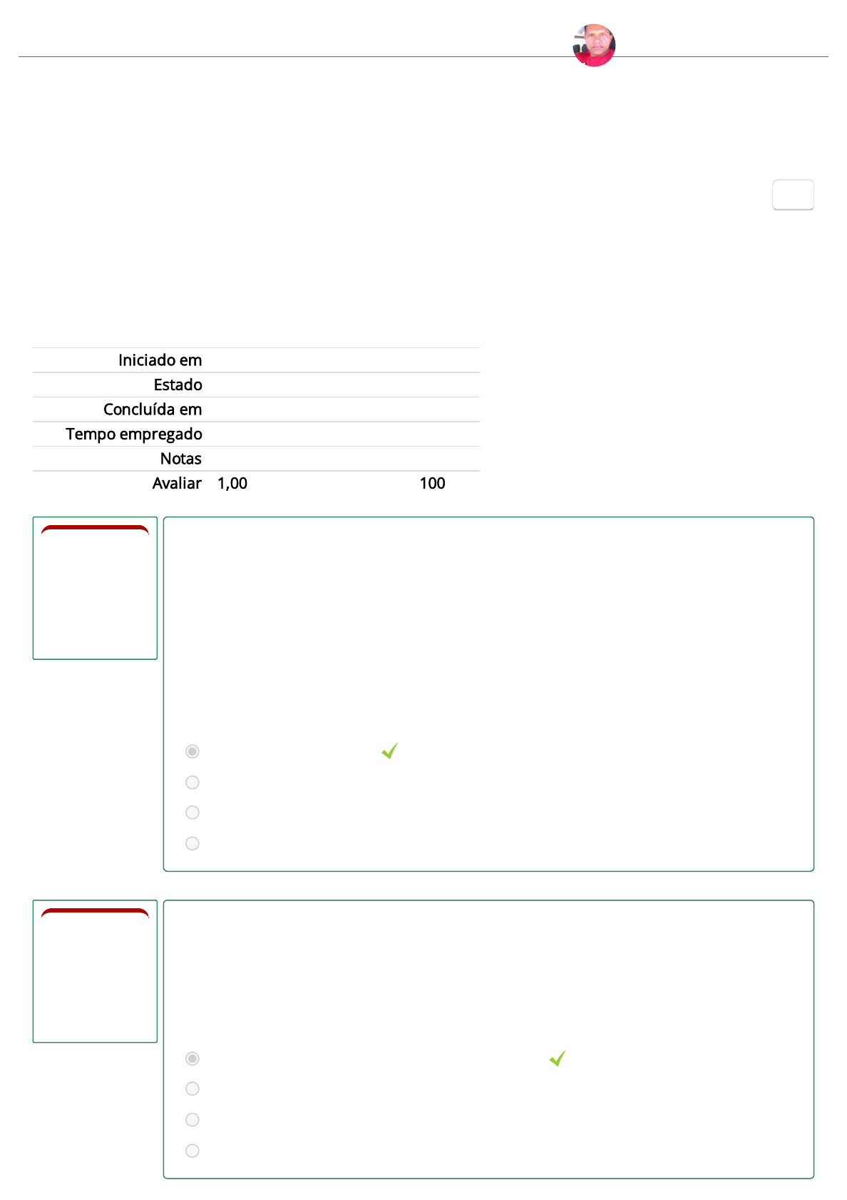 Questão 1 Correto Atingiu 1,00 de 1,00 Questão 2 Correto Atingiu 1,00 de 1,00 Meus cursos Cursos Técnicos Técnico em Serviços Públicos TSP turma 2020 Módulo 03 TSP 2020 Noções de Cont. Pública TSP2020 Semana 5 e 6 Questionário aula 3 Iniciado em quarta, 3 nov 2021, 10:42 Estado Finalizada Concluída em quarta, 3 nov 2021, 11:27 Tempo empregado 44 minutos 49 segundos Notas 8,00/8,00 Avaliar 1,00 de um máximo de 1,00(100%) Demonstração que apresenta, entre outras informações, a despesa orçamentária executada, mostrando, também a destinação de recursos, os recebimentos e pagamentos extraorçamentários, as transferências financeiras decorrentes, ou não, da execução orçamentária e o saldo inicial e final em espécie(valor 0,125): Escolha uma opção: a. Balanço �nanceiro. b. Demonstração dos �uxos de caixa. c. Balanço orçamentário. d. Balanço patrimonial. Demonstração que indicará o resultado patrimonial devido às alterações nele ocorridos durante o exercício financeiro: Escolha uma opção: a. Demonstração das Variações Patrimoniais. b. Balanço Financeiro. c. Balanço Orçamentário. d. Balanço Patrimonial. Francisco Da Silva Sousa https://pas.ava.ifsuldeminas.edu.br/ https://pas.ava.ifsuldeminas.edu.br/course/index.php?categoryid=3 https://pas.ava.ifsuldeminas.edu.br/course/index.php?categoryid=6 https://pas.ava.ifsuldeminas.edu.br/course/index.php?categoryid=122 https://pas.ava.ifsuldeminas.edu.br/course/index.php?categoryid=125 https://pas.ava.ifsuldeminas.edu.br/course/view.php?id=354 https://pas.ava.ifsuldeminas.edu.br/course/view.php?id=354§ion=4 https://pas.ava.ifsuldeminas.edu.br/mod/quiz/view.php?id=20830 Questão 3 Correto Atingiu 1,00 de 1,00 Questão 4 Correto Atingiu 1,00 de 1,00 Questão 5 Correto Atingiu 1,00 de 1,00 Demonstração contábil não citada nominalmente na Lei 4.320/64 como obrigatória ao setor público: Escolha uma opção: a. Balanço �nanceiro. b. Demonstração do resultado do exercício. c. Balanço orçamentário. d. Balanço patrimonial. Demonstração contábil aplicável ao setor público na qual se apresentam as receitas previstas e as despesas fixadas em confronto com as realizadas (valor 0,125): Escolha uma opção: a. Demonstração do resultado econômico. b. Demonstração das mutações do Patrimônio Líquido. c. Balanço orçamentário. d. Balanço patrimonial. Característica adicional que as demonstrações contábeis conferem à informação no serviço público, não necessariamente obrigatória à todas as empresas privadas (valor 0,125): Escolha uma opção: a. transparência. b. conhecimento da situação das entidades. c. condução do gerenciamento das entidades. d. auxílio no processo decisório. Questão 6 Correto Atingiu 1,00 de 1,00 Questão 7 Correto Atingiu 1,00 de 1,00 Questão 8 Correto Atingiu 1,00 de 1,00 Demonstração contábil aplicável ao setor público que deverá demonstrar os ingressos (entradas) e dispêndios (saídas, gastos) de recursos financeiros a título de receitas e despesas orçamentárias, bem como os recebimentos e pagamentos de natureza extraorçamentária, conjugados com os saldos de disponibilidade do exercício e aqueles que passarão para o exercício seguinte (valor 0,125): Escolha uma opção: a. Demonstração das variações patrimoniais. b. Balanço �nanceiro. c. Demonstração de lucros ou prejuízos acumulados. d. Demonstração dos �uxos de caixa. Demonstração que corresponde, por analogia, à Demonstração do Resultado do Exercício da contabilidade comercial, onde se tem lucro ou prejuízo, que equivalem ao déficit ou superávit apresentados na demonstração aplicável ao setor público (valor 0,125): Escolha uma opção: a. Demonstração do Valor Adicionado. b. Demonstração das Variações Patrimoniais. c. Demonstração dos Lucros ou Prejuízos acumulados. d. Demonstração dos �uxos de caixa. Demonstração na qual se tem os anexos chamados de demonstrativo de execução dos restos a pagar não processados e dos restos a pagar processados (valor 0,125): Escolha uma opção: a. Balanço orçamentário. b. Demonstração das variações patrimoniais. c. Balanço �nanceiro. d. Balanço patrimonial.