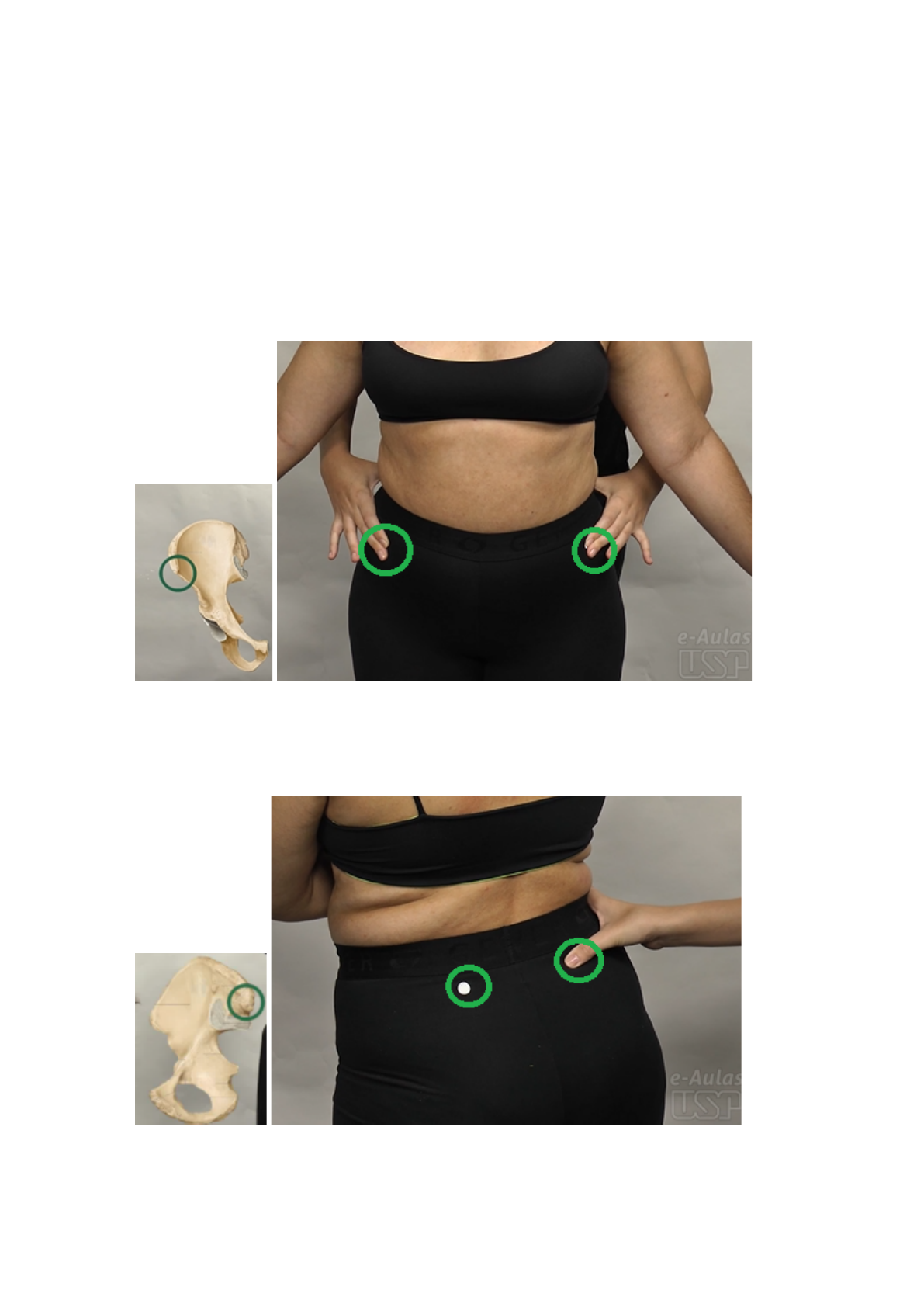 DISCIPLINA DE AVALIAÇÃO FÍSICO-FUNCIONAL II Roteiro de Aula Prática QUADRIL PALPAÇÃO ● EIAS (espinha ilíaca ântero-superior) ● EIPS (espinha ilíaca póstero-superior) ● Crista Ilíaca ● Trocânter maior (bursa trocantérica) Caso tenha dificuldade para localizar o trocânter peça para que o paciente rode o quadril lateralmente/medialmente. ● Tuberosidad (túber) Isquiática (bursa isquiática) ● Sínfise Púbica ● Trígono Femoral ● MÚSCULOS: M. Glúteo máximo M. Glúteo médio - Em caso de dificuldade para localizar o músculo, solicitar ao paciente (DL) realize um abdução. M. Glúteo mínimo Não é possível palpar esse músculo, pois, o mesmo está recoberto pelo m. glúteo médio e m. glúteo máximo. M. Tensor da Fáscia Lata M. Sartório A parte proximal do músculo é a mais fácil de sentir/apalpar. M. ILIOPSOAS Paciente em DD, terapêuta ao lado maca, paciente realiza flexão de quadril e joelhos. Lateralmente ao M. reto abdominal (parte distal), de forma oblíqua ( / ), o terapeuta vai afundando os dedos até sentir o músculo. GONIOMETRIA (ADM) ● Extensão (plano sagital / eixo transversal) – paciente em DV Fulcro: Trocânter maior Haste fixa: em direção ao tronco Haste móvel: em direção ao epicôndilo lateral do fêmur Interpretação: 0-20° ● Flexão (plano sagital / eixo transversal) – paciente em DD Fulcro: Trocânter maior Haste fixa: em direção ao tronco Haste móvel: em direção ao epicôndilo lateral do fêmur Interpretação: 0-120° ● Abdução (plano frontal / eixo sagital) – paciente em DD Fulcro: centro da articulação – cruzamento das linhas EIAS/centro da patela - Sínfise Púbica/Trocânter maior Haste fixa: em direção ao tronco – goniômetro aberto em 180° ou em 90° em direção à Sínfise Púbica Haste móvel: em direção ao centro da patela Interpretação: 0-45° ● Adução (plano frontal / eixo sagital) – paciente em DD Fulcro: centro da articulação – cruzamento das linhas EIAS/centro da patela - Sínfise Púbica/Trocânter maior Haste fixa: em direção ao tronco – goniômetro aberto em 180° ou em 90° apontando para Sínfise Púbica Haste móvel: em direção ao centro da patela Interpretação: 0-30° Obs.: afastar a outra perna para realizar a adução ● Rotação Medial (plano transversal / eixo longitudinal) – paciente em DV ou sentado Fulcro: com o joelho flexionado em 90°, no centro da patela Haste fixa: goniômetro aberto em 90°, apoiado na maca (para realização em DV) Haste móvel: em direção a tuberosidade anterior da Tíbia (centro da tíbia) Interpretação: 0-35° ● Rotação Lateral (plano transversal / eixo longitudinal) – paciente em DV ou sentado Fulcro: com o joelho flexionado em 90°, no centro da patela Haste fixa: goniômetro aberto em 90°, apoiado na maca (para realização em DV) Haste móvel: em direção a tuberosidade anterior da Tíbia (centro da tíbia) Interpretação: 0-45° Atividades Funcionais: ADM necessária Andar: ADM Extensão = 10° / ADM Flexão = 40° Subir Degraus médios: = 70° de flexão Sentar / levantar: 115°