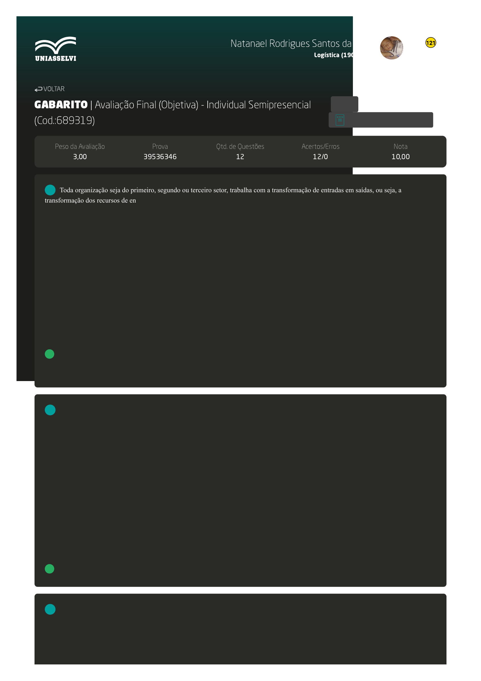 05/11/21, 17:45 AVA https://ava2.uniasselvi.com.br/subject/grades-and-tests/answer-book/eyJ0ZXN0Ijp7InRlc3RDb2RlIjoiNjg5MzE5IiwiZGVzY3JpcHRpb24iOiJBdmFsaWHDp8OjbyBGaW5hbCAoT2JqZXRpdmEpIC0gSW5kaXZpZHVhb… 1/5 GABARITO | Avaliação Final (Objetiva) - Individual Semipresencial (Cod.:689319) Peso da Avaliação 3,00 Prova 39536346 Qtd. de Questões 12 Acertos/Erros 12/0 Nota 10,00 Toda organização seja do primeiro, segundo ou terceiro setor, trabalha com a transformação de entradas em saídas, ou seja, a transformação dos recursos de entradas (recursos de input) no produto (saída/output) que será disponibilizado ao mercado/clientes. Para alcançar mercado as corporações buscam se diferenciar de seus concorrentes inovando em seus processos de transformação, como foi o caso da Toyota. Considerando esse contexto, avalie as asserções a seguir e a relação proposta entre elas: I- A função da produção é implementar a estratégia da organização. PORQUE II- A função da produção consiste em agregar valor aos bens e serviços durante o processo de transformação. Assinale a alternativa CORRETA: A A asserção I é uma proposição verdadeira, e a II é uma proposição falsa. B A asserção I é uma proposição falsa, e a II é uma proposição verdadeira. C As asserções I e II são proposições verdadeiras, e a II é uma justificativa da I. D As asserções I e II são proposições verdadeiras, mas a II não é uma justificativa da I. O ciclo PDCA (Plan, Do, Check e Action) é uma metodologia da administração da qualidade que, apesar de ter sido criada por Walter A. Shewart na década de 1920, foi amplamente divulgada por William Edward Deming a partir da década de 1950. Esta ferramenta é composta por quatro estágios. Sobre os estágios do ciclo PDCA analise as sentenças a seguir. I- Execução: é a primeira etapa do ciclo PDCA, visto que é nesta etapa que o plano é implementado. II- Análise: esta corresponde à terceira etapa do ciclo PDCA, em que ocorre a identificação da efetividade do plano. III- Realização: esta corresponde à segunda etapa do ciclo PDCA, em que ocorre a implementação do plano estabelecido. IV- Planejamento: é a primeira etapa do ciclo PDCA; esta fase é estabelecida com base nas diretrizes da organização. Assinale a alternativa CORRETA: A As sentenças I e IV estão corretas. B As sentenças I e II estão corretas. C As sentenças I e III estão corretas. D As sentença II, III e IV estão corretas. Considerando que as organizações são um agrupamento de atividades, que estão inseridas em diversos subprocessos e que estes, ao final, compõem o macroprocesso da organização, é crítico entender que estes processos se modificam ao longo do tempo, sobretudo com o avanço tecnológico, sendo comum que alguns processos deixem de existir e outros surjam. Sobre a gestão por processos - BPM, classifique V para as sentenças verdadeiras e F para as falsas: VOLTAR A+ Alterar modo de visualização 1 2 3 Natanael Rodrigues Santos da Silva Logística (1908593) 121 05/11/21, 17:45 AVA https://ava2.uniasselvi.com.br/subject/grades-and-tests/answer-book/eyJ0ZXN0Ijp7InRlc3RDb2RlIjoiNjg5MzE5IiwiZGVzY3JpcHRpb24iOiJBdmFsaWHDp8OjbyBGaW5hbCAoT2JqZXRpdmEpIC0gSW5kaXZpZHVhb… 2/5 ( ) A gestão por processos fundamenta-se na constatação de que a produção de bens e serviços por uma organização ocorre em forma de processos e não em "caixinhas" isoladas. ( ) A abordagem por processos implica a definição clara de responsáveis, a otimização dos agrupamentos das atividades relacionadas e a diminuição dos desperdícios da organização. ( ) Entre os impactos que o gerenciamento dos processos causa nas organizações, destaca-se o autoconhecimento, no qual a empresa conhece como e por que os processos são executados de determinada forma, conseguindo trabalhar para a sua melhoria. ( ) A gestão por processos é um fator crítico para o desenvolvimento de competências diferenciadas, visto que a produção de bens e serviços por uma organização ocorre em forma de "caixinhas" isoladas e não em processos. Assinale a alternativa que apresenta a sequência CORRETA: A F - V - F - V. B V - F - V - F. C V - V - V - F. D F - F - V - V. Podemos dizer que os estoques são os materiais mantidos na organização com o objetivo de abastecer uma demanda futura. Contudo, manter estoque em uma empresa implica investimento e riscos de obsolescência. Em poucas palavras, estoque é dinheiro parado. Existem vários tipos de estoque nas empresas, cada qual com a sua função e suas características. Associe os itens, utilizando o código a seguir: I- Estoque de ciclo ou por tamanho de lote. II- Estoque de segurança (mínimo). III- Estoque de proteção (hedge). IV- Estoque de antecipação. V- Estoque de movimentação. ( ) Ocorre sempre que um ou mais estágios da operação não fornecem todos os itens que produzem simultaneamente. ( ) Cujo objetivo é compensar as incertezas inerentes a fornecimento e demanda. Quantidade mantida em estoque para suprir nas ocasiões em que a demanda é maior do que a esperada e/ou quando a oferta para repor estoque ou de matéria-prima para fabricá-la é menor do que a esperada e/ou quando o tempo de ressuprimento é maior que o esperado e/ou quando houver erros de controle de estoque que levam o sistema de controle a indicar mais material do que a existência efetiva. ( ) Estoque formado para nivelar as flutuações previsíveis na demanda, entrega ou produção de um item específico. ( ) É feito quando excepcionalmente está previsto um acontecimento que pode colocar em risco o abastecimento normal de estoque e gerar uma quebra na produção e/ou vendas. Normalmente são greves, problemas de novas legislações, período de negociação de nova tabela de preços etc. ( ) Tipo de estoque em processo que surge devido ao tempo necessário para mover os produtos de um lugar para outro. Agora, assinale a alternativa 