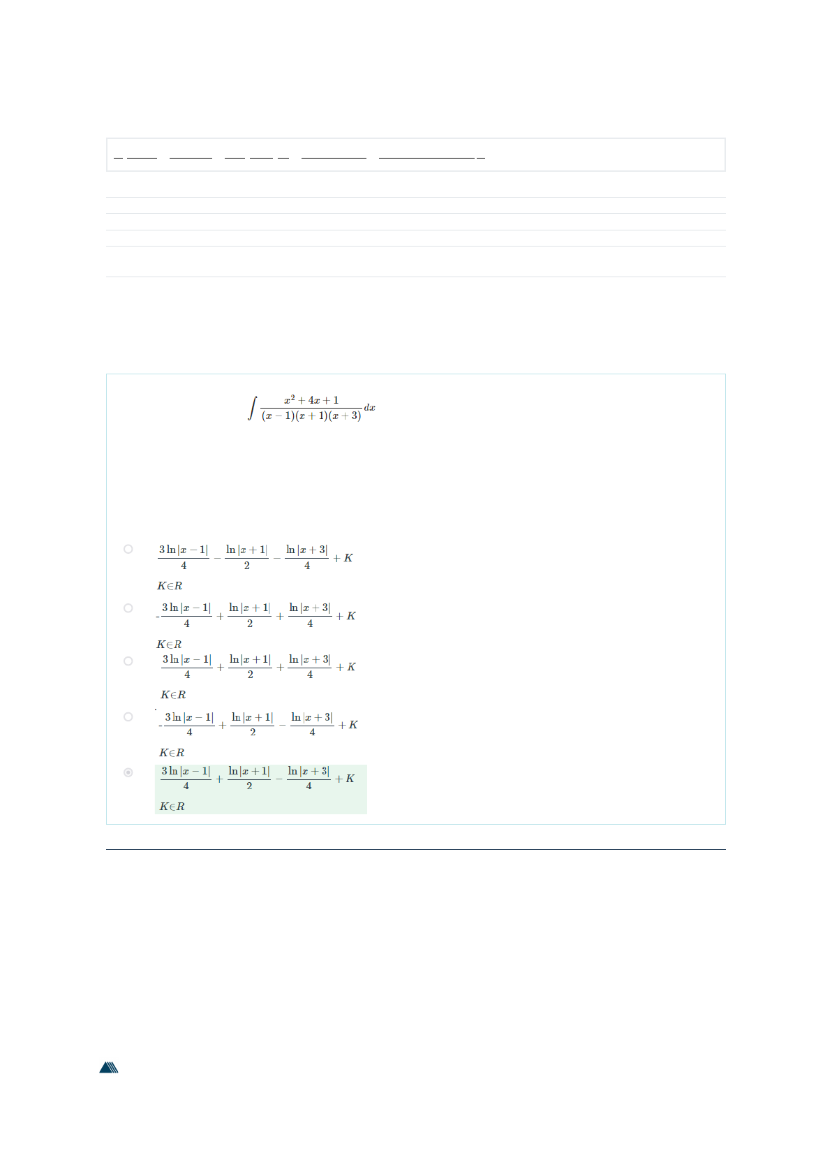 Página inicial / Meus Cursos / ENIAC_20212F_708 / Materiais de Estudo / Unidade 4 - Exercícios de �xação Iniciado em sexta, 29 out 2021, 20:11 Estado Finalizada Concluída em sexta, 29 out 2021, 20:40 Tempo empregado 28 minutos 27 segundos Avaliar 9,00 de um máximo de 10,00(90%) Questão 1 Correto Atingiu 1,00 de 1,00 Analisando a integral pode-se concluir que seu cálculo não é de fácil resolução. Uma forma de simpli�car o cálculo integral de funções desse tipo é realizando a decomposição em frações parciais. Resolva a integral utilizando a decomposição mencionada. a. b. c. d. e. Unidade 4 - Exercícios de fixação: Revisão da tentativa https://portalacademico.eniac.edu.br/mod/quiz/review.php?attempt=14... 1 of 8 29/10/2021 20:41 https://portalacademico.eniac.edu.br/ https://portalacademico.eniac.edu.br/ https://portalacademico.eniac.edu.br/mod/quiz/review.php?attempt=1478283&cmid=300740# https://portalacademico.eniac.edu.br/mod/quiz/review.php?attempt=1478283&cmid=300740# https://portalacademico.eniac.edu.br/course/view.php?id=12353 https://portalacademico.eniac.edu.br/course/view.php?id=12353 https://portalacademico.eniac.edu.br/course/view.php?id=12353#section-1 https://portalacademico.eniac.edu.br/course/view.php?id=12353#section-1 https://portalacademico.eniac.edu.br/mod/quiz/view.php?id=300740 https://portalacademico.eniac.edu.br/mod/quiz/view.php?id=300740 https://atendimento.eniac.edu.br/ https://atendimento.eniac.edu.br/ Questão 2 Correto Atingiu 1,00 de 1,00 Uma pessoa percorre um caminho em formato parabólico, segundo a curva y=x^2, ilustrada abaixo. Determine a distância percorrida pela pessoa do ponto (0,0) ao ponto (1,1), sabendo que o comprimento do arco dessa parábola nesses pontos é dada por: Escolha uma opção: a. b. c. d. e. Unidade 4 - Exercícios de fixação: Revisão da tentativa https://portalacademico.eniac.edu.br/mod/quiz/review.php?attempt=14... 2 of 8 29/10/2021 20:41 https://atendimento.eniac.edu.br/ https://atendimento.eniac.edu.br/ Questão 3 Correto Atingiu 1,00 de 1,00 Um campo elétrico E no ponto P(a, b), a > 0 eb > 0, em uma barra de comprimento L, é dado por: em que ε0 é uma constante. Determine o campo elétrico no ponto (3, 2) de uma barra de comprimento 5. a. b. c. d. e. Unidade 4 - Exercícios de fixação: Revisão da tentativa https://portalacademico.eniac.edu.br/mod/quiz/review.php?attempt=14... 3 of 8 29/10/2021 20:41 https://atendimento.eniac.edu.br/ https://atendimento.eniac.edu.br/ Questão 4 Correto Atingiu 1,00 de 1,00 Deseja-se construir um reservatório obtido pela rotação da função em torno do eixo x. Para determinar a quantidade de material necessário para a construção do reservatório, é preciso encontrar a área de sua superfície, que é dada por Calcule a área da superfície do reservatório e assinale a resposta correta. Escolha uma opção: a. b. c. d. e. Unidade 4 - Exercícios de fixação: Revisão da tentativa https://portalacademico.eniac.edu.br/mod/quiz/review.php?attempt=14... 4 of 8 29/10/2021 20:41 https://atendimento.eniac.edu.br/ https://atendimento.eniac.edu.br/ Questão 5 Correto Atingiu 1,00 de 1,00 Questão 6 Correto Atingiu 1,00 de 1,00 Para determinar o volume de um sólido obtido pela rotação da função f(x) em torno do eixo x, para a≤ x≤b, resolve-se a integral Determine o volume do sólido obtido pela rotação da função em torno do eixo x, para Escolha uma opção: a. b. c. d. e. Para resolver integrais envolvendo potências das funções seno e cosseno, é possível utilizar algumas estratégias próprias, de acordo com a potência de cada função. Resolva a integral aplicando a estratégia adequada. Escolha uma opção: a. b. c. d. e. Unidade 4 - Exercícios de fixação: Revisão da tentativa https://portalacademico.eniac.edu.br/mod/quiz/review.php?attempt=14... 5 of 8 29/10/2021 20:41 https://atendimento.eniac.edu.br/ https://atendimento.eniac.edu.br/ Questão 7 Incorreto Atingiu 0,00 de 1,00 Um campo elétrico E no ponto P (a, b) em uma barra carregada de comprimento L é dado por Onde é uma constante. Determine o campo elétrico no ponto (3, 2) de uma barra de comprimento 5. Escolha uma opção: a. b. c. d. e. Unidade 4 - Exercícios de fixação: Revisão da tentativa https://portalacademico.eniac.edu.br/mod/quiz/review.php?attempt=14... 6 of 8 29/10/2021 20:41 https://atendimento.eniac.edu.br/ https://atendimento.eniac.edu.br/ Questão 8 Correto Atingiu 1,00 de 1,00 Questão 9 Correto Atingiu 1,00 de 1,00 Use frações parciais para calcular: a. b. c. d. e. Para determinar o volume de um sólido obtido pela rotação da função f(x) em torno do eixo x, para a ≤ x ≤ b, resolve-se a integral Determine o volume do sólido obtido pela rotação da função em torno do eixo x, para 0 ≤ x ≤ 2. a. ln 3π. b. π ln 3. c. π (4 – ln 3). d. 4π. e. π (4 + ln 3). Unidade 4 - Exercícios de fixação: Revisão da tentativa https://portalacademico.eniac.edu.br/mod/quiz/review.php?attempt=14... 7 of 8 29/10/2021 20:41 https://atendimento.eniac.edu.br/ https://atendimento.eniac.edu.br/ Questão 10 Correto Atingiu 1,00 de 1,00 Para resolver integrais envolvendo divisão entre polinômios, utiliza-se o método da decomposição em frações parciais para simpli�car o cálculo da integral. Sendo assim, utilize tal método para resolver a integral: a. b. c. d. e. ◄ Assunto 08 - Método das frações parciais Seguir para... Como usar o Khan Academy no celular ► Unidade 4 - Exercícios de fixação: Revisão da tentativa https://portalacademico.eniac.edu.br/mod/quiz/review.php?attempt=14... 8 of 8 29/10/2021 20:41 https://portalacademico.eniac.edu.br/mod/lti/view.php?id=300739&forceview=1 https://portalacademico.eniac.edu.br/mod/lti/view.php?id=300739&forceview=1 https://portalacademico.eniac.edu.br/mod/resource/view.php?id=300742&forceview=1 https://portalacademico.eniac.edu.br/mod/resource/view.php?id=300742&forceview=1 https://atendimento.eniac.