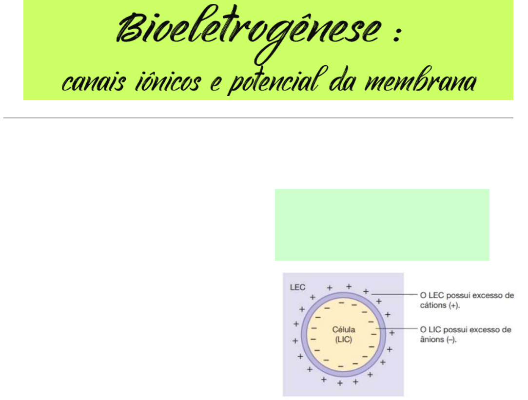 Kerolyn Cibelle- Medicina- Unit Potencial da membrana ou Potencial de Repouso: Em geral, o corpo é eletricamente neutro: para todos os cátions, há ânions correspondentes. Porém, os íons não estão distribuídos de maneira uniforme entre o LIC e o LEC. LIC: » Principal cátion → K+ » Principal ânion→ PO4- e proteínas negativamente carregadas. LEC: » Principal cátion → Na+ » Principal ânion→ Cl- O compartimento intracelular contém alguns ânions que não possuem cátions correspondentes, o que confere às células uma carga líquida negativa. Ao mesmo tempo, o compartimento ex- tracelular apresenta uma carga líquida positiva: alguns cátions do LEC não possuem ânions correspondentes. Uma consequência desta distribuição desigual de íons é que os compartimentos intracelular e extracelular não estão em equilíbrio elétrico. Em vez disso, os dois compartimentos existem em um estado de desequilíbrio elétrico. Esse desequilíbrio elétrico que existe entre o meio intracelular e o extracelular é chamado de Diferença de Potencial de Membrana (Vm), ou Potencial de Membrana. Tanto a célula como a solução são eletricamente neutras, e o sistema elétrico está em equilíbrio. Contudo, ele não está em equilíbrio químico. Existem gradientes de concentração para todos os quatro tipos de íons no sistema, e todos se difundiriam a favor dos seus respectivos gradientes de concentração se eles pudessem atravessar a membrana celular. Um canal de vazamento para K+ inserido na membrana. Agora, a célula é permeável ao K+, mas apenas ao K+. Devido ao gradiente de concentração de K+, o K+move- se para fora da célula. Os íons negativos na célula tentam seguir o K+ por causa da atração de cargas positivas e negativas. Todavia, porque a membrana é Etapa 1- Módulo 2- Aula 3// Fisiologia Humana- Silverthorn A bicamada de fosfolipídeos da membrana celular é um meio isolante, porque impede que cargas separadas se movam através dela. Kerolyn Cibelle- Medicina- Unit impermeável a íons negativos, os ânions permanecem presos na célula. O equilíbrio elétrico entre o LIC e o LEC é interrompido: o interior da célula tem uma carga líquida -1. O movimento de K+ para fora da célula a favor do seu gradiente de concentração cria um gradiente elétrico, isto é, uma diferença elétrica na carga líquida entre duas regiões. Neste exemplo, o interior da célula tornou-se negativo em relação ao exterior. Se a única força que atua sobre o K fosse o gradiente de concentração, o K vazaria para fora da célula até que a concentração de K no interior da célula se igualasse à concentração fora dela. Contudo, a perda de íons positivos da célula cria um gradiente elétrico. A combinação de gradientes elétricos e de concentração é chamada de gradiente eletroquímico. Devido a cargas opostas se atraírem, as proteínas negativas no interior da célula tentam puxar o K de volta para dentro da célula. Em algum ponto do processo, a força de atração elétrica para dentro da célula torna-se igual em magnitude ao gradiente de concentração química que conduz o K para fora da célula. Nesse ponto, o movimento líquido de K através da membrana cessa. A taxa na qual os íons K se movem para fora da célula é exatamente igual à taxa na qual íons K se movem para dentro da célula. O sistema atingiu o equilíbrio eletroquímico. Para qualquer dado gradiente de concentração de um único íon, o potencial de membrana que se opõe exatamente ao gradiente de concentração é chamado de potencial de equilíbrio, ou Eíon. Fatores que justificam no repouso ser negativo dentro da célula: - canais vazantes, já que o K+ vaza mais (sai da célula). - proteínas com cargas negativas (aniônicas) que se mantêm no interior da célula. - a bomba de sódio e potássio, devido a desproporção 3 Na+ e 2 K+. Desequilíbrio elétrico O desequilíbrio elétrico, ou um gradiente elétrico entre os líquidos extracelular e intracelular, é chamado de diferença de potencial em repouso da membrana, ou, para abreviar, potencial de membrana. » Carga polarizada- célula em repouso. » Carga despolarizada- célula em ação. (a polarização ou não está relacionada à concentração de íon e não ao sódio e ao potássio necessariamente). Dois fatores influenciam um potencial de membrana celular: (1) os gradientes de concentração de diferentes íons através da membrana (2) a permeabilidade da membrana para estes íons. Se a permeabilidade da célula para um íon muda, o potencial de membrana da célula muda. Kerolyn Cibelle- Medicina- Unit O potencial de membrana (Vm) começa com um valor de repouso de 70 mV constante. Quando o traço se move para cima (torna-se menos negativo), a diferença de potencial entre o interior e o exterior da célula (0 mV) é menor, e a célula é dita despolarizada. O retorno ao potencial de repouso da membrana é denominado repolarização. Se o potencial de repouso se torna mais negativo, dizemos que a célula hiperpolarizou. O que muda o potencial da membrana é justamente uma resposta ao movimento dos íons existentes. Se uma célula se torna subitamente mais permeável para qualquer um desses íons, em seguida, os íons se moverão a favor do seu gradiente eletroquímico para dentro da célula.