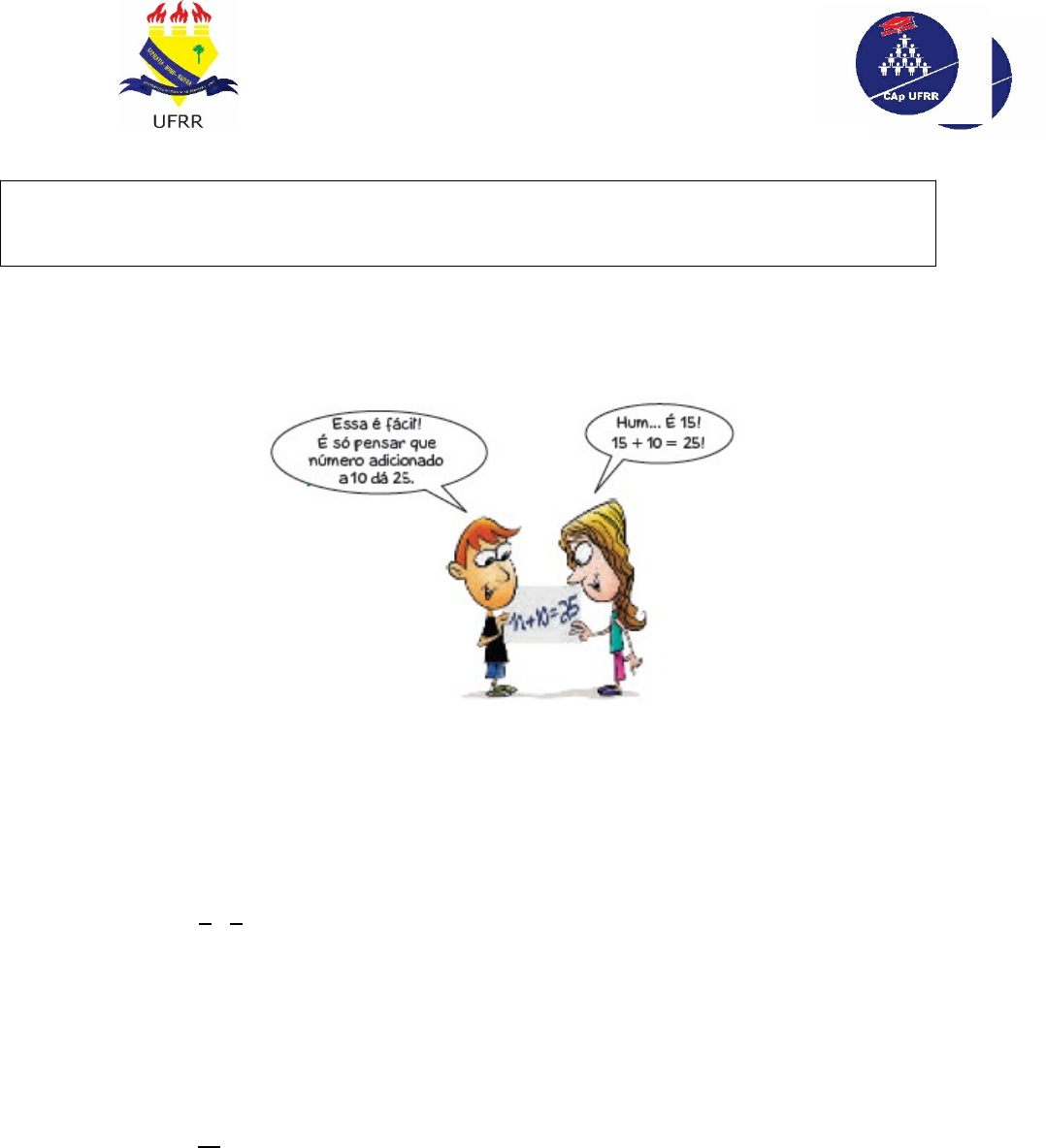 MINISTÉRIO DA EDUCAÇÃO - MEC UNIVERSIDADE FEDERAL DE RORAIMA - UFRR CENTRO DE EDUCAÇÃO - CEDUC COLÉGIO DE APLICAÇÃO – CAp Atividade: Equações do 1º grau – Equação e equações equivalentes Aluno(a): Turma: 01) Observe como Carla e Ricardo, calculando mentalmente, descobriram a raiz de uma equação. Agora, descubra a raiz de . Como você pensaria para descobrir esse? Resposta: 02) Encontre mentalmente a raiz de cada equação. a) Resposta: b) Resposta: c) Resposta: d) e) Resposta: 03) Caio foi a papelaria comprar um estojo e um caderno. Observe o diálogo que Caio teve com o vendedor: Qual é o preço total? Tudo dá R$12,00. a) Escreva a equação que representa o preço x, do estojo, adicionado ao preço y, do caderno. Resposta: b) Usando a equação encontrada no item a, responda: · Se o estojo custasse R$5,00, qual teria sido o valor pago pelo Caderno? Resposta: · Se o caderno custasse R$7,50, qual teria sido o valor pago pelo estojo? Resposta: · O estojo poderia ter custado R$6,50 e o caderno, R$6,00? Por quê? Resposta: 04) Leia e responda. a) Resposta: b) Resposta: 05) A balança a seguir está em equilíbrio. Descubra a massa x desconhecida, em quilograma. Resposta: 06) Verifique se o número 8 é raiz de cada uma das equações abaixo. a) Reposta: b) Resposta: c) Resposta: d) Resposta: 07) Associe cada equação da coluna da esquerda com a equação equivalente da coluna da direita. Exemplo: A – V. Respostas: 08) Escreva uma equação equivalente a cada equação abaixo. a) Resposta: b) Resposta: c) Resposta: 30 10 = x 3 1 3 1 . = x 8 ) 1 .( - = - x 1 15 1 . = x - - 20 12 . = + x 15 2 = x 24 . 3 = x 4 2 = x 20 12 . = + x 10 2 = x 12 . 4 = x 16 . 2 = x
