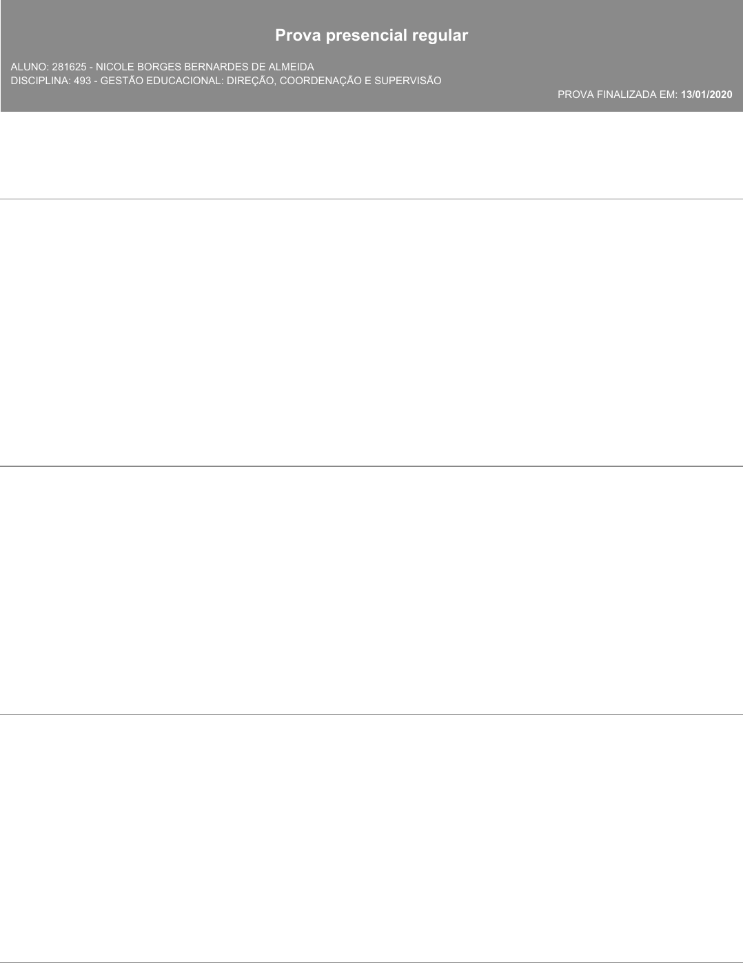 Prova presencial regular ALUNO: 281625 - NICOLE BORGES BERNARDES DE ALMEIDA DISCIPLINA: 493 - GESTÃO EDUCACIONAL: DIREÇÃO, COORDENAÇÃO E SUPERVISÃO PROVA FINALIZADA EM: 13/01/2020 Abaixo estão as questões e as alternativas escolhida pelo aluno: Questão 1 Existe um teórico da Psicologia que tem como característica notável da sua abordagem o estudo da dinâmicados grupos e a aplicação de conceitos relativos ao comportamento individual e grupal. Assim como o indivíduoe o seu ambiente formam um campo psicológico, assim também o grupo e seu ambiente compõemum campo social. Esse autor é a) Freud. b) Lewin c) Skinner. d) Bion. Questão 2 Quando estudamos a liderança, vimos que ela tem três conceitos correlatos: controle, poder e autoridade.Faça a correspondência de cada conceito com a sua significação, numerando a coluna da direita.Agora, assinale a alternativa correta, de acordo com o que foi associado acima. a) 3, 1, 2. b) 2, 1, 3. c) 1, 2, 3. d) 2, 3, 1. Questão 3 Philippe Perrenoud aplica a abordagem por competências à formação docente, relacionando o que é imprescindívelsaber para ensinar bem numa sociedade em que o conhecimento está cada vez mais acessível.Marque a alternativa que apresenta algumas dessas competências. a) Utilizar novas tecnologias e administrar a própria formação. b) Organizar e dirigir situações de aprendizagem e isolar-se da administração escolar. c) Ser competitivo, como demanda a modernidade, e enfrentar os deveres e os dilemas éticos da profissão. d) Informar e envolver os pais, e trabalhar bem individualmente. Questão 4 Segundo o artigo da Lei 9.394/96 (Lei de Diretrizes e Bases da Educação) os conteúdos curriculares daeducação básica observarão, como diretrizes, Stamp a) a consideração das condições de escolaridade dos alunos em cada estabelecimento, sempre comparando-as com as condições ideais ou ótimas. b) a colocação direta dos alunos no mercado de trabalho. c) a promoção do desporto educacional e apoio às práticas desportivas formais. d) a difusão de valores fundamentais ao interesse social, aos direitos e deveres dos cidadãos, de respeitoao bem comum e à ordem democrática. Questão 5 Gustavo Boog apresentou um modelo esquemático de mudança que se estratifica em três níveis. A definiçãoque melhor se aplica ao segundo nível (necessidade de aprender/vivência da instituição) é a) o diagnóstico atual dos recursos qualitativos da organização: como somos? Como queremos ser (oque queremos mudar)? b) aquele que traz a demanda de construção da definição de diretrizes, metas, objetivos e planos estratégicos(novos procedimentos e instrumentos participativos de avaliação). c) o nível que se refere ao diagnóstico atual dos recursos quantitativos da organização: onde nós estamos?Onde nós queremos estar? d) o nível em que ocorre o verdadeiro desenvolvimento da organização, por meio da aquisição de habilidadese capacidades. Questão 6 Na escola de Mariana, a diretora é uma pessoa muito querida. Ela participa de todas as festas promovidaspelos professores, que adoram conversar com ela e chegam a lhe fazer confidências. Esse tipo de podersocial é chamado de a) competência. b) referência. c) legítimo d) recompensa Questão 7 A responsabilidade pela implementação do Projeto Político Pedagógico da escola, pela consecução dos aspectos pedagógicos da missão institucional e pela realização das decisões de cunho pedagógico, tomadas pelo conselho da escola, compete a) à Secretaria de Educação do estado ou do município. b) ao gestor escolar. c) aos professores da escola. d) à equipe técnico-pedagógica da escola. Questão 8 Michel Foucault é um autor conhecido pelos seus estudos sobre poder e autoridade. Assinale, dos conceitosabaixo, o que pertence ao universo teórico desse autor. a) Importância do exercício do poder. b) Relação entre o exercício da crítica e a resistência. c) Distinção entre governo e governamento. d) Crise de autoridade historicamente estabelecida. Questão 9 Os nomes de Frederick Winslow Taylor e de Henri Fayol estão ligados, respectivamente, a) às teorias modernas de gestão e às teorias emergentes de gestão. b) à Escola de Administração Científica e à Teoria Sistêmica de Administração. c) à Escola Clássica de Administração e à Escola de Administração Científica. d) à Escola de Administração Científica e à Escola Clássica de Administração. Questão 10 * O Projeto Político Pedagógico é um importante instrumento para a gestão da autonomia da escola. Sobreele podemos dizer que a) é compreendido como o plano global da instituição ou o projeto educativo, ou seja, um instrumentoteórico- metodológico b) não é necessário que os atores institucionais pensem, com base na própria realidade, sobre a singularidadeque caracteriza a autonomia. c) a sua construção deve articular os partícipes da realidade escolar: corpo docente e corpo discente. d) pode provocar dois tipos de problema: a fragmentação do trabalho pedagógico e o aumento da rotinade tarefas improdutivas Questão 11 A mudança institucional que requer do gestor escolar competências técnicas organizativas, pessoais (sensibilidade,ponderação, equilíbrio emocional, sabedoria, intuição), sociais, conceituais e holísticas é aquelaque ocorre a) nas relações institucionais. b) nos processos desenvolvidos no interior da instituição. c) na identidade da instituição escolar. d) nos recursos da instituição. Questão 12 A influência da Teoria Sistêmica sobre a gestão escolar foi muito marcante no Brasil da década de 1970.Uma dessas influências é a a) utilização de planilhas para a elaboração dos planejamentos e a formulação de objetivos instrucionais. b) divisão do trabalho, em que cada tarefa deve ser dividida no maior número possível de subtarefas. c) ênfase nos grupos e relações informais no trabalho. d) explora