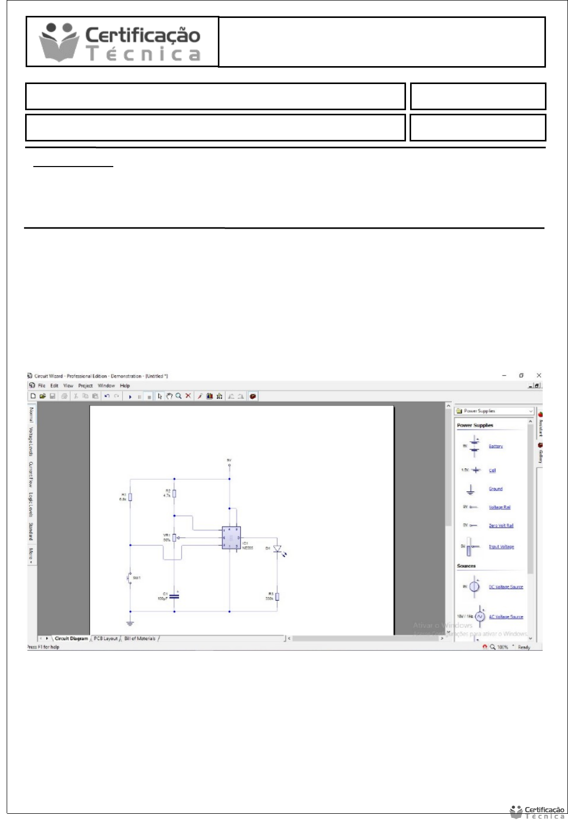 Leitura e Interpretação de Diagramas Eletrônicos - RD Data 12/08/ 2021 Aluno (a): SAYMON BARRETO SANTOS Atividade Prática Final NOTA: INSTRUÇÕES: · Esta Avaliação contém 1 (uma) questão, totalizando 10 (dez) pontos; · Envie o arquivo como solicitado pelo sistema no local indicado; · Em caso de dúvidas consulte o seu Tutor. AGORA CHEGOU O MOMENTO DE TREINAR SEUS CONHECIMENTOS! 1. Desenvolver os seguintes passos: a) De acordo com o diagrama mostrado abaixo, monte o circuito no simulador Circuit Wizard ou no EWB e utilize um soquete apropriado para o CI555. b) Após a montagem, teste o circuito e veja o seu funcionamento. c) Enviar o arquivo mostrando o circuito montado. Acionamentos Eletrônicos - ELT Acionamentos Eletrônicos - ELT