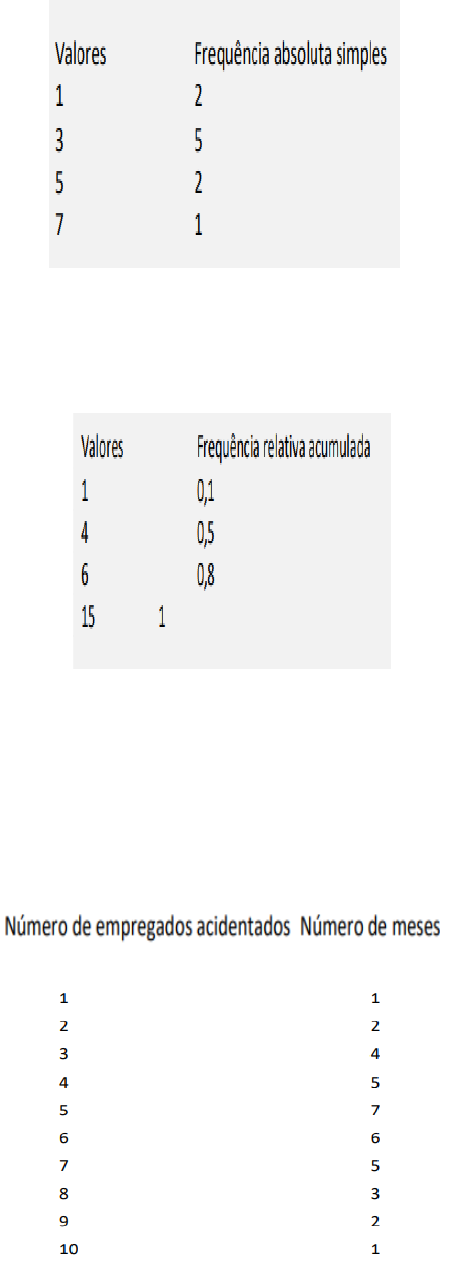 Lista de Revisão Pontuada AV1 1) Considere a seguinte tabela: Obtenha os valores de frequência relativa acumulada. 2) Considere a seguinte tabela: Sabendo que ao todo são 50 dados, obtenha os valores de frequência absoluta simples. 3) (Fundação Carlos Chagas) Uma empresa procurou estudar a ocorrência de acidentes com seus empregados e realizou um levantamento por um período de 36 meses. As informações apuradas estão na tabela a seguir: A porcentagem de meses em que houve menos de 5 empregados acidentados é: a) 50% b) 45% c) 35% d) 33% e) 30% 4) A evolução da dívida (em milhões de reais) de um estado ao longo do período 1990 – 2000 é apresentada no gráfico abaixo: O período de maior crescimento da dívida foi: a) 1990 – 1992. b) 1992 – 1994. c) 1994 – 1996. d) 1996 – 1998. e) 1998 – 2000. 5) Uma empresa procurou estudar a ocorrência de acidentes com seus empregados e realizou um levantamento por um período de 36 meses. As informações apuradas estão na tabela a seguir: A porcentagem de meses em que houve menos de 5 empregados acidentados é: a) 50%. b) 45%. c) 35%. d) 33%. e) 30%. 6) O gráfico de setores a seguir mostra a distribuição das quantidades de incêndios em determinada região, nos meses de abril a setembro de determinado ano. Sabendo-se que nesses meses ocorreram 1.548 incêndios nessa região, julgue o item que se segue em certo ou errado. Nos meses de maio e junho ocorreram mais de 400 incêndios nessa região. 7) A tabela apresenta a quantidade de detentos no sistema penitenciário brasileiro por região em 2013. Nesse ano, o déficit relativo de vagas – que se define pela razão entre o déficit de vagas no sistema penitenciário e a quantidade de detentos no sistema penitenciário – registrado em todo o Brasil foi superior a 38,7%, e, na média nacional, havia 277,5 detentos por 100 mil habitantes. Com base nessas informações e na tabela apresentada, julgue o item a seguir. Na análise exploratória, o histograma é um gráfico adequado para descrever a distribuição da quantidade de detentos por região em 2013. 8) Em um histograma representando os preços unitários de microcomputadores em estoque, observa-se que no eixo das abscissas (eixo horizontal) constam os intervalos de classe em R$ e no eixo das ordenadas (eixo vertical) as respectivas densidades de frequências em (R$) – 1. Densidade de frequência de um intervalo de classe é o resultado da divisão da respectiva frequência relativa pela correspondente amplitude do intervalo. Um determinado intervalo de classe com amplitude igual a R$ 2.500,00 apresenta uma densidade de frequência, em (R$) -1, igual a 12,8 X . Se o número de microcomputadores deste intervalo é igual a 48, então o número total de microcomputadores em estoque é igual a: a) 150. b) 120. c) 240. d) 160. e) 96.