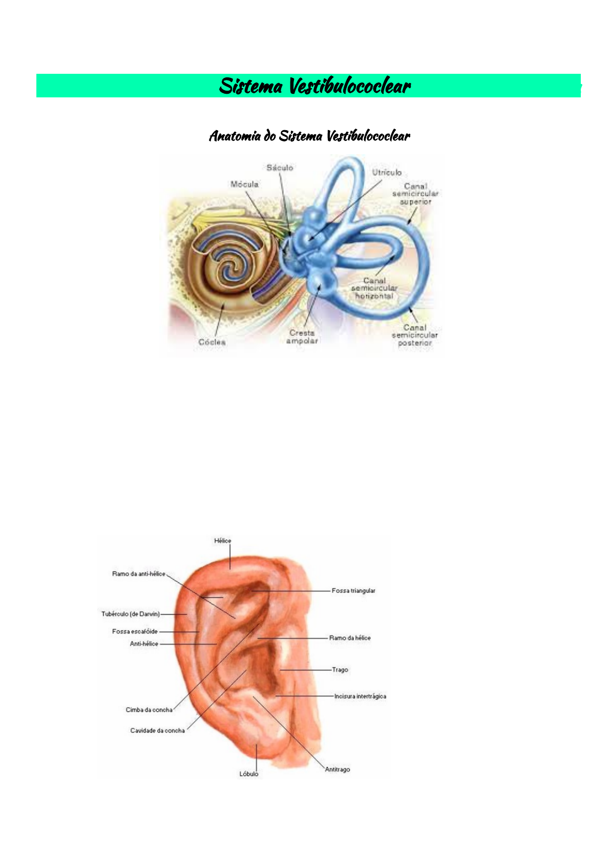 aaaaaaaaaaaaaaaaaaaaSistema Vestibulococlearaaaaaaaaaaaaaaaaaaa Anatomia do Sistema Vestibulococlear ➔ Órgão sensoriais do sistema do equilíbrio e o sistema coclear (auditivo) ➔ Sistema vestibular e coclear são independentes ➔ Labirinto vestibular do equilíbrio e labirinto coclear ➔ Orelha externa - Pavilhão auricular ou Pina ● Aural = orelha ● Inervação sensitiva: nervos trigêmeo, facial, glossofaríngeo, vago e ramo auricular magno do plexo cervical ● Cartilagem ● Os músculos auriculares são bem pequenos que viram ligamentos na maioria das pessoas e servem para fixar o pavilhão da orelha ● Orelha em abano: ausência de músculos e ligamentos ● Funções ❖ proteção ❖ absorção do som ❖ ressonância ❖ transmissão do som da orelha externa para orelha média ● Forma ❖ morfologia variável, que permite a identificação - Meato acústico externo ● revestido pela mesma pele da orelha -> presença de pelos (proteção) e glândulas ceruminosas ● possui 5 nervos de sensibilidade ● funções ❖ proteção ❖ absorção ❖ ressonância ❖ transmissão ● forma ❖ porção cartilaginosa ❖ porção óssea ➔ Orelha Média - Possui teto, assoalho, parede lateral, medial , anterior e posterior ● Parede lateral ou timpânica: membrana timpânica ● Parede medial ou labiríntica: janelas oval e redonda ● Parede anterior ou carótica: tuba auditiva ● Parede posterior ou mastóide: antro mastóideo ● Superior ou teto: tegmen timpani ● Inferior ou jugular: forame e veia jugular - Dividida em: ● anterosuperior ● posterosuperior ● anteroinferior ● posteroinferior ❖ onde é realizada punção para retirar pus - Martelo, bigorna e estribo ● articulação do tipo sinovial ❖ sindesmose tímpano - malear (entre membrana timpânica e o martelo) ❖ art. incudo-malear (entre bigorna e martelo) ❖ art. incudo-estapedial (entre bigorna e estribo) ❖ sindesmose tímpano-estapedial ● martelo - maleus ● bigorna - incus ● estribo - estapedius ● músculos: tensor do tímpano e do estribo (servem para proteção, quando contraem freiam a propagação do som) ● reflexo timpânico e reflexo estapedial ● ramo mandibular do nervo trigêmio inerva o tensor do tímpano e o nervo facial inerva o músculo do estribo - Amplificação do som: efeitos de áreas e alavancas -> transforma 1 dB em até 32 dB - Surdez de condução: lesão na membrana, ossículos e articulações (70% da população) - Surdez sensorial: problema na orelha interna - Surdez verbal: problema no cérebro - Tuba auditiva: função ventilatória e secretora ➔ Orelha interna - Labirintos ósseo e membranoso: ● ósseo: ❖ cóclea ❖ canais semicirculares ❖ vestíbulo ● membranoso ❖ ducto coclear ❖ ductos semicirculares ❖ utrículo e sáculo - Perilinfa é o líquor -> otites internas podem ocasionar meningite - Endolinfa é produzida pela estria vascular - Receptores ● ducto coclear - órgão de corti - audição ● ductos semicirculares - cristas ampulares - equilíbrio - aceleração angular ● utrículo e sáculo - máculas - equilíbrio - aceleração linear Via Auditiva