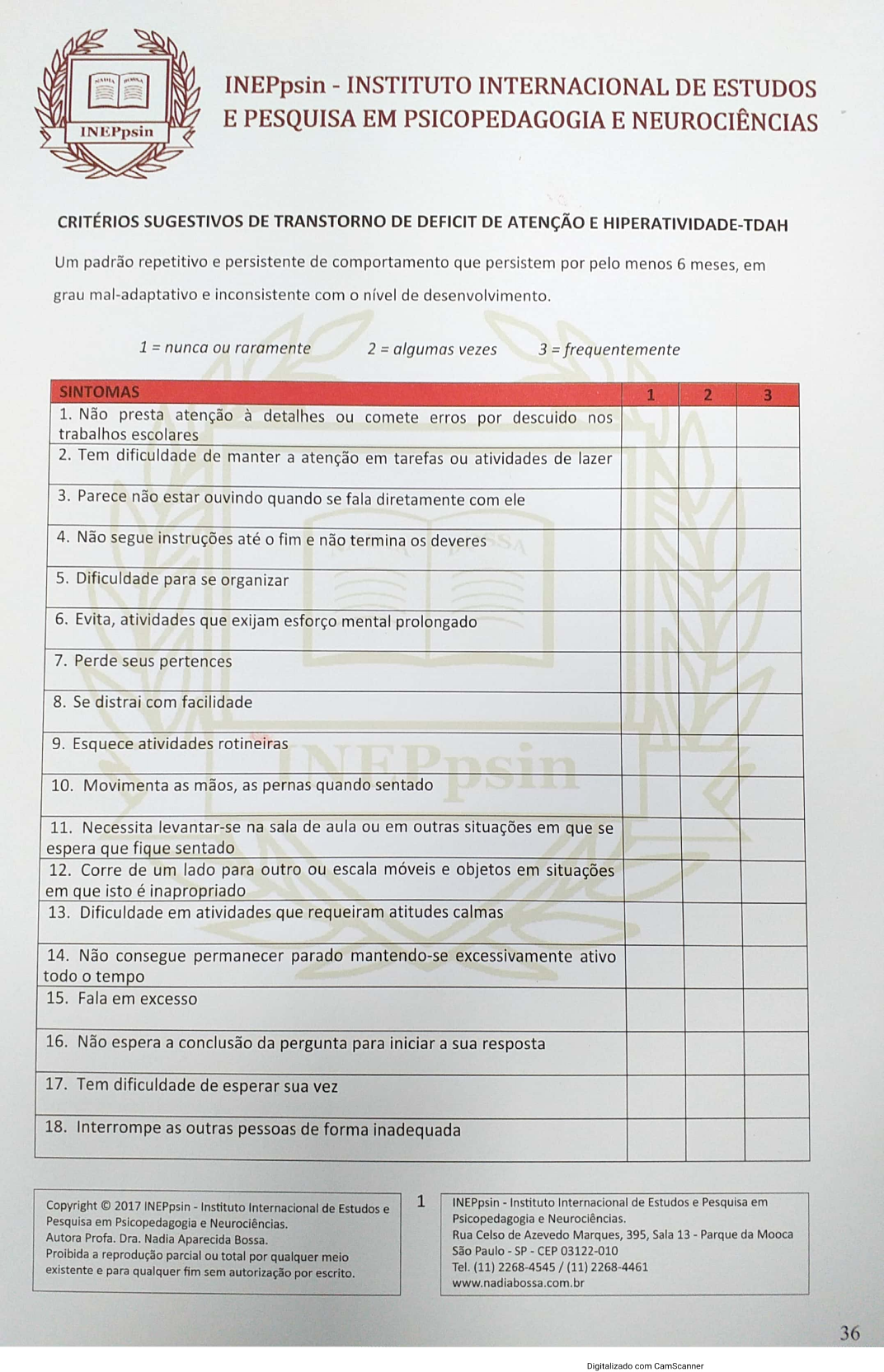 INEPpsin – INSTITUTO INTERNACIONAL DE ESTUDOS E PESQUISAS EM PSICOPEDAGOGIA E NEUROCIÊNCIAS PROFª DRA. NADIA APARECIDA BOSSA AVALIAÇÃO DOS CRITERIOS SUGESTIVOS DE TRANSTORNO DE DÉFICIT DE ATENÇÃO E HIPERATIVIDADE Os transtornos hipercinéticos, ditos transtornos de déficit de atenção e hiperatividade (TDAH), constituem um grupo de transtornos caracterizados por início precoce (habitualmente durante os cinco primeiros anos de vida), falta de perseverança nas atividades que exigem um envolvimento cognitivo, e uma tendência a passar de uma atividade a outra sem acabar nenhuma, associadas a uma atividade global desorganizada, incoordenada e excessiva. Os transtornos podem se acompanhar de outras anomalias. As crianças hipercinéticas são frequentemente imprudentes e impulsivas, sujeitas a acidentes e incorrem em problemas disciplinares mais por infrações não premeditadas de regras que por desafio deliberado. Suas relações com os adultos são freqüentemente marcadas por uma ausência de inibição social, com falta de cautela e reserva normais. São impopulares com as outras crianças e podem se tornar isoladas socialmente. Estes transtornos se acompanham freqüentemente de um déficit cognitivo e de um retardo específico do desenvolvimento da motricidade e da linguagem. As complicações secundárias incluem um comportamento dissocial e uma perda de autoestima. CLASSIFICAÇÃO NA CID 10 F90 E NO DSM V 314.00 No DSM V 314.00 Apresentação predominantemente desatenta 314.01 Apresentação combinada 314.01 Apresentação predominantemente Hiperativa/Impulsiva INEPpsin – INSTITUTO INTERNACIONAL DE ESTUDOS E PESQUISAS EM PSICOPEDAGOGIA E NEUROCIÊNCIAS PROFª DRA. NADIA APARECIDA BOSSA Especificar leve, moderada ou grave F90 Transtornos hipercinéticos Exclui: esquizofrenia (F20.-), transtornos ansiosos (F41.-), transtornos globais do desenvolvimento (F84.-), transtornos do humor [afetivos] (F30- F39). F90.0 Distúrbios da atividade e da atenção Síndrome de déficit da atenção com hiperatividade Transtorno de déficit da atenção com hiperatividade Transtorno de hiperatividade e déficit da atenção F90.1 Transtorno hipercinético de conduta Transtorno hipercinético associado a transtorno de conduta F98.8 Outros transtornos comportamentais e emocionais especificados com início habitualmente na infância ou adolescência Déficit de atenção sem hiperatividade DIAGNÓSTICO O diagnóstico é clínico, feito pela anamnese e pelo exame das funções psíquicas. Não há exames laboratoriais, de imagens cerebrais ou testes que possam definir se uma pessoa se enquadra ou não nos critérios da CID-10 ou do DSM-5 para os transtornos hipercinéticos e de atenção. Existem dois principais conjuntos de critérios diagnósticos de uso corrente para os transtornos infantis hipercinéticos, com hipoprosexia 1 INEPpsin – INSTITUTO INTERNACIONAL DE ESTUDOS E PESQUISAS EM PSICOPEDAGOGIA E NEUROCIÊNCIAS PROFª DRA. NADIA APARECIDA BOSSA ou com pseudoprosexia: um com base na 10ª revisão da Classificação Estatística Internacional de Doenças e Problemas Relacionados à Saúde (CID-10), da Organização Mundial da Saúde. 1 A hipoprosexia, também denominada distração ou labilidade da atenção é uma alteração frequente mas, como regra, pouco patológica. Representa uma constante flutuação da atenção, que passa de um objeto a outro sem que a pessoa se possa fixar especificamente em um deles. A pseudoprosexia consiste em um déficit aparente de atenção quando a pessoa está concentrada e focalizada em outro aspecto diferente do que supostamente deveria ser o foco. Na pseudoprosexia não deixa de existir, portanto, a capacidade de focalizar a atenção, mas o sujeito se concentra em um determinado tema e se desliga dos demais estímulos. De modo simplificado, o transtorno de déficit de atenção e hiperatividade do DSM é composto por três características básicas: a dificuldade de atenção, a hiperatividade e a impulsividade. O transtorno inclui, pois, três subtipos: a) um subtipo combinado em que todos os três sinais indispensáveis ao diagnóstico estão presentes (hiperatividade, desatenção e impulsividade); b) um subtipo com predominância de desatenção, com pouca hiperatividade ou impulsividade; c) um subtipo predominantemente hiperativo-impulsivo no qual a hiperatividade e a impulsividade existem, mas não a desatenção. Ao contato com uma criança ou um adolescente suspeito de ter sintomas do transtorno, a primeira questão a ser examinada pelo especialista é a da frequência dos sintomas. INEPpsin – INSTITUTO INTERNACIONAL DE ESTUDOS E PESQUISAS EM PSICOPEDAGOGIA E NEUROCIÊNCIAS PROFª DRA. NADIA APARECIDA BOSSA Os sistemas classificatórios modernos (DSM e CID) enfatizam a necessidade de que cada sintoma do TDAH ocorra frequentemente para que seja considerado positivo. Isso é de extrema importância tratando-se de um transtorno dimensional, já que boa parte da população apresentará os mesmos sintomas numa frequência mais baixa. Entretanto, os sistemas classificatórios não operacionalizam a definição de “frequentemente”. Dependendo de onde o clínico colocar o ponto de corte para definir o sintoma como frequente, ele terá mais ou menos indivíduos incluídos na categoria diagnóstica. Então, como operacionalizar essa definição de uma forma que as famílias possam entender? Embora não haja nem consenso, nem pesquisa empírica sobre a questão, utilizamos a definição de que o sintoma deve ocorrer mais vezes do que não ocorrer na situação pesquisada. Por exemplo, ao investigarmos com os pais se a criança erra por descuido nas tarefas escolares em casa, em primeiro lugar, definimos quantas vezes por semana a criança faz tarefas escolares em casa (por exemplo, cinco vezes por semana). Após isso, investigamos o número de vezes em que esses erros por descuido acontecem. No exemplo citado, se acontecerem mais vezes do 