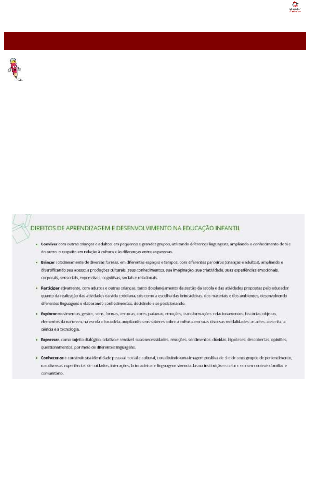 Prof.ª Ana Vital https://educadorsistemicobr.eadbox.com 1 BNCC – EDUCAÇÃO INFANTIL ESCREVA SEU NOME: _________________________________________________________________________________________________________________ A BASE NACIONAL COMUM CURRICULAR A Base Nacional Comum Curricular (BNCC) é um documento de caráter normativo que define o conjunto orgânico e progressivo de aprendizagens essenciais que todos os alunos devem desenvolver ao longo das etapas e modalidades da Educação Básica, de modo a que tenham assegurados seus direitos de aprendizagem e desenvolvimento, em conformidade com o que preceitua o Plano Nacional de Educação (PNE). Este documento normativo aplica-se exclusivamente à educação escolar, tal como a define o § 1º do Artigo 1º da Lei de Diretrizes e Bases da Educação Nacional (LDB, Lei nº 9.394/1996)1, e está orientado pelos princípios éticos, políticos e estéticos que visam à formação humana integral e à construção de uma sociedade justa, democrática e inclusiva, como fundamentado nas Diretrizes Curriculares Nacionais da Educação Básica (DCN)2. Essa concepção de criança como ser que observa, questiona, levanta hipóteses, conclui, faz julgamentos e assimila valores e que constrói conhecimentos e se apropria do conhecimento sistematizado por meio da ação e nas interações com o mundo físico e social não deve resultar no confinamento dessas aprendizagens a um processo de desenvolvimento natural ou espontâneo. Ao contrário, impõe a necessidade de imprimir intencionalidade educativa às práticas pedagógicas na Educação Infantil, tanto na creche quanto na pré-escola. Prof.ª Ana Vital https://educadorsistemicobr.eadbox.com 2 OS CAMPOS DE EXPERIÊNCIAS Considerando que, na Educação Infantil, as aprendizagens e o desenvolvimento das crianças têm como eixos estruturantes as interações e a brincadeira, assegurando-lhes os direitos de conviver, brincar, participar, explorar, expressar-se e conhecer-se, a organização curricular da Educação Infantil na BNCC está estruturada em cinco campos de experiências, no âmbito dos quais são definidos os objetivos de aprendizagem e desenvolvimento. Os campos de experiências constituem um arranjo curricular que acolhe as situações e as experiências concretas da vida cotidiana das crianças e seus saberes, entrelaçando-os aos conhecimentos que fazem parte do patrimônio cultural. A definição e a denominação dos campos de experiências também se baseiam no que dispõem as DCNEI em relação aos saberes e conhecimentos fundamentais a ser propiciados às crianças e associados às suas experiências. Considerando esses saberes e conhecimentos, os campos de experiências em que se organiza a BNCC são: OBJETIVOS DE APRENDIZAGEM E DESENVOLVIMENTO PARA A EDUCAÇÃO INFANTIL Na Educação Infantil, as aprendizagens essenciais compreendem tanto comportamentos, habilidades e conhecimentos quanto vivências que promovem aprendizagem e desenvolvimento nos diversos campos de experiências, sempre tomando as interações e a brincadeira como eixos estruturantes. Essas aprendizagens, portanto, constituem-se como objetivos de aprendizagem e desenvolvimento. Reconhecendo as especificidades dos diferentes grupos etários que constituem a etapa da Educação Infantil, os objetivos de aprendizagem e desenvolvimento estão sequencialmente organizados em três grupos por faixa etária, que correspondem, aproximadamente, às possibilidades de aprendizagem e às características do desenvolvimento das crianças, conforme indicado na figura a seguir. Todavia, esses grupos não podem ser considerados de forma rígida, já que há diferenças de ritmo na aprendizagem e no desenvolvimento das crianças que precisam ser consideradas na prática pedagógica. Prof.ª Ana Vital https://educadorsistemicobr.eadbox.com 3 Educação Infantil > Determina interações e brincadeiras como os eixos estruturantes das práticas pedagógicas > Define direitos de aprendizagem e desenvolvimento > Propõe objetivos de aprendizagem e desenvolvimento organizados por campos de experiência e faixas etárias > Ressalta a necessidade de imprimir intencionalidade educativa às práticas pedagógicas e de acompanhar a progressão das aprendizagens e desenvolvimento 1. A estrutura da BNCC na etapa da Educação A TRANSIÇÃO DA EDUCAÇÃO INFANTIL PARA O ENSINO FUNDAMENTAL A transição entre essas duas etapas da Educação Básica requer muita atenção, para que haja equilíbrio entre as mudanças introduzidas, garantindo integração e continuidade dos Prof.ª Ana Vital https://educadorsistemicobr.eadbox.com 4 processos de aprendizagens das crianças, respeitando suas singularidades e as diferentes relações que elas estabelecem com os conhecimentos, assim como a natureza das mediações de cada etapa. Torna-se necessário estabelecer estratégias de acolhimento e adaptação tanto para as crianças quanto para os docentes, de modo que a nova etapa se construa com base no que a criança sabe e é capaz de fazer, em uma perspectiva de continuidade de seu percurso educativo. Para isso, as informações contidas em relatórios, portfólios ou outros registros que evidenciem os processos vivenciados pelas crianças ao longo de sua trajetória na Educação Infantil podem contribuir para a compreensão da história de vida escolar de cada aluno do Ensino Fundamental. Conversas ou visitas e troca de materiais entre os professores das escolas de Educação Infantil e de Ensino Fundamental – Anos Iniciais também são importantes para facilitar a inserção das crianças nessa nova etapa da vida escolar. EXERCÍCIOS QUESTÃO 01 Ao que compete à Base Nacional Comum Curricular (BNCC), a atuação do MEC, além do apoio técnico e financeiro, deve incluir: I- Fomento a inovações e a disseminação de casos de sucesso. II- Incentivo e elaboração de currículos bilíngues. III- Criação de oportunidades de acesso a conhecime