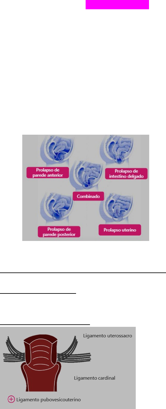 MEDNOTES DISTOPIAS GENITAIS Você sabe reproduzir o POP-Q? Definição · Distopia genital corresponde a qualquer tipo de descenso das estruturas pélvicas · Tipos de prolapso: · uterino · de intestino delgado · combinado · de parede anterior (cistocele) · de parede posterior (retocele) · de cúpula vaginal (pacientes histerectomizadas) · Aparelho de suspensão: · Ligamentos cardinais (de Mackenrodt) ou paramétrios: Faixa fibrosa que conecta as laterais do colo uterino aos ossos ilíacos => fixação lateral do útero · Ligamentos uterossacros: partem do colo uterino e se fixam ao sacro => fixam o útero para trás e para cima. As falhas deste ligamento aumentam a propensão a prolapso uterino · Ligamento pubovesicouterino Aparelho de sustentação: assoalho pélvico · Diafragma urogenital · Diafragma pélvico: é o grande componente do assoalho pélvico. Composto pelos músculos elevador do ânus e coccígeo, sendo que o elevador do ânus é formado por outros três músculos: · Puborretal · Pubococcígeo · Iliococcígeo · Fáscia endopélvica: recobre todas as estruturas do assoalho pélvico · fáscia pubocervical - entre bexiga e vagina; fáscia retovaginal Fatores de risco · Enfraquecimento do assoalho pélvico · Hipoestrogenismo - principal causa - pós menopausa · Estrogênio é responsável pelo tônus do assoalho pélvico · Fragilidade constitucional - redução dos níveis de colágeno · Gestação · Parto vaginal - 2 partos vaginais = 8x mais chance de distopia em relação a mulher sem parto vaginal · Obesidade, constipação e DPOC - o mecanismo é o aumento da pressão intra-abdominal Clínica · Queixa de “bola na vagina” · Sangramento genital - mucosa exteriorizada é friável · Sensação de peso na região genital · Flatulência vaginal · Dificuldade de esvaziamento retal e/ou vesical Exame físico · Objetivo de identificar a estrutura prolapsada Graduação · Classificação de Baden-Walker (1968) · Grau 1 - prolapso que ainda não atingiu o introito vaginal (anel himenal) · Grau 2 - prolapso ao nível do anel himenal · Grau 3 - prolapso que se exterioriza pelo introito vaginal · POP-Q (Pelvic organ prolapse quantification - 1996) · Estadiamento muito mais fidedigno do prolapso genital · Nível -3: 03 cm acima do introito vaginal · Nível -2: 02 cm acima · Nível -1: 01 cm acima · Nível 0: anel himenal (introito vaginal) · Nível 1: 01 cm abaixo · Nível 2: 02 cm abaixo · Nível 3: 03 cm abaixo · Pontos do POP-Q: · Parede anterior da vagina: · Aa: Junção uretrovesical - ponto fixo a 03 cm acima do anel himenal · Ba: Ponto móvel da parede anterior que está mais prolapsado · obs: se não tem prolapso, os pontos Aa e Ba estão no mesmo local, em -3 · Parede posterior da vagina: · Ap: Ponto fixo na parede posterior que está 03 cm acima do anel himenal · Bp: Ponto móvel da parede posterior que está mais prolapsado · obs: se não tem prolapso, os pontos Ap e Bp também coincidem, em -3 · Colo do útero: · C: Ponto mais distal do colo do útero · Se histerectomizada, C representa o ponto mais distal da cúpula vaginal · Fórnice vaginal superior · D: Ponto localizado no fundo de saco de Douglas (inserção dos ligamentos uterossacros) · Não pode ser mensurado se a paciente foi histerectomizada · Se a prova apresenta “D -”, significa que a paciente é histerectomizada · Se o ponto C ficar a 4cm do ponto D, temos o alongamento hipertrófico do colo uterino · Comprimento vaginal total: · CVT · Hiato genital · HG: medida da distância entre o meato uretral e a fúrcula vaginal · Corpo perineal · CP: medida da distância entre a fúrcula e a metade da abertura do ânus À direita: em branco, HG. Em rosa, CP. Ex: paciente sem prolapso Estadiamento POP-Q · Estágio 1: o compartimento mais prolapsado está localizado até -1 (intravaginal) · Estágio 2: o compartimento mais prolapsado está entre -1 e +1 · Estágio 3: o compartimento mais prolapsado está acima de +1, mas possui no máximo 2cm a menos que o comprimento vaginal total · Ex: numa paciente com comprimento vaginal de 9cm, o prolapso é estágio 3 se o ponto mais prolapsado se localiza até +7 · Estágio 4: ponto mais prolapsado está a uma distância maior que 2cm a menos que o comprimento vaginal · Ex: numa paciente com comprimento vaginal de 8cm, o ponto mais prolapsado está em +7 Tratamento · Conservador · Exercícios de Kegel · Estrogênio vaginal · Pessários · Cirúrgico: tratamento padrão · Prolapso uterino: histerectomia vaginal · se desejo reprodutivo: cirurgia de Manchester => amputação do colo do útero com manutenção do corpo uterino. Necessário cerclagem na gestação · Prolapso de parede anterior: colporrafia anterior - abre a parede anterior e dá pontos na fáscia pubocervical (tb chamado de colpoperineoplastia anterior) · Prolapso de parede posterior: colporrafia posterior - abre a parede posterior e dá pontos na fáscia retovaginal (tb chamado de colpoperineoplastia posterior) · Prolapso de cúpula: fixação sacra (fixação da cúpula no ligamento sacroespinhoso); OU promontofixação (fixação ao promontório) · Pacientes sem condições cirúrgicas · Tratamento conservador OU · Colpocleise ou cirurgia de Lefort (fechamento cirúrgico da vagina) · Mulheres acamadas, sem vida sexual e pouca expectativa de vida