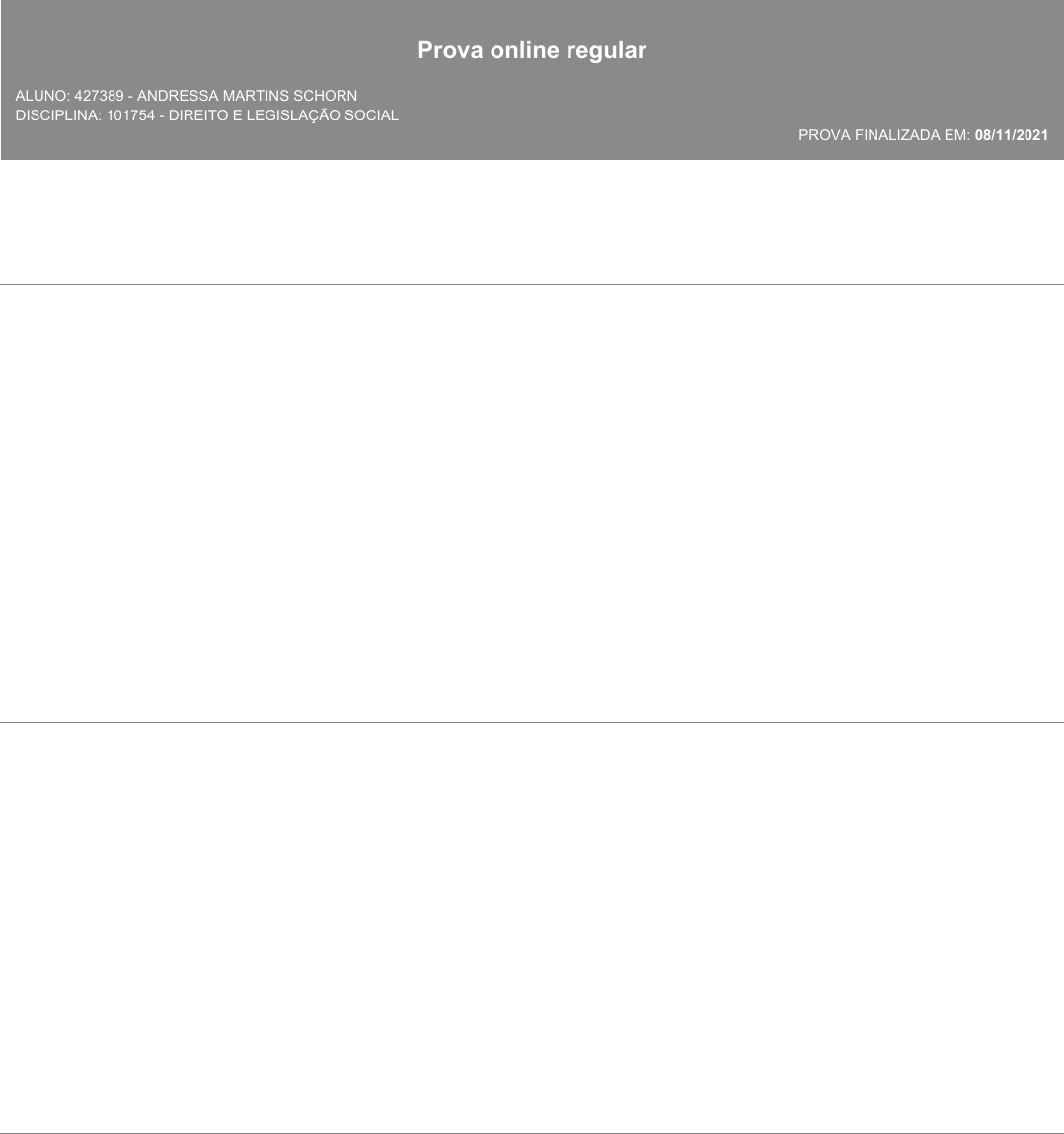 Prova online regular ALUNO: 427389 - ANDRESSA MARTINS SCHORN DISCIPLINA: 101754 - DIREITO E LEGISLAÇÃO SOCIAL PROVA FINALIZADA EM: 08/11/2021 Abaixo estão as questões e as alternativas escolhida pelo aluno: Questão 1 Com relação às políticas públicas e à efetivação do direito fundamental à seguridade social, assinale a alternativa correta. a) A efetivação do direito fundamental à seguridade social se esgota na realização das leis. b) Uma das formas de efetivação do direito fundamental à seguridade social é a realização de ações coordenadas e racionalizadas de longo prazo: as políticas públicas. c) A efetivação do direito fundamental à seguridade social ocorre por meio de políticas imediatas, não sendo possível a sua realização a longo prazo. d) Os direitos fundamentais à seguridade social são apenas recomendações ao Estado e possuem uma efetividade comprometida. e) A efetivação do direito fundamental à seguridade social ocorre por meio do recolhimento ao INSS. Questão 2 Qual é o objetivo do princípio da isonomia de tratamento urbano e rural no âmbito da seguridade social e qual é a sua relação com a compreensão constitucional da igualdade? Assinale a alternativa correta. a) Garantir que trabalhadores de áreas urbanas e rurais tenham a mesma remuneração. b) Garantir que trabalhadores de áreas urbanas e rurais sejam tratados de maneira igualitária, sendo possível a utilização de ações afirmativas para a materialização dessa igualdade. c) Garantir que trabalhadores de áreas urbanas e rurais sejam tratados de maneira igualitária, ou seja, jamais pode haver qualquer diferenciação entre eles. d) Garantir que trabalhadores de áreas urbanas e rurais tenham a mesma base de contribuição. e) Garantir que trabalhadores de áreas urbanas e rurais tenham as mesmas oportunidades de trabalho. Questão 3 Com relação ao conceito e à delimitação dos direitos sociais, segundo a Constituição Federal de 1988, assinale a alternativa correta. a) A Constituição Federal não delimita os direitos sociais, cabendo aos estados e municípios a escolha de quais direitos priorizar. b) O conceito de direitos sociais está relacionado à noção do "social", portanto, é vinculado somente a direitos que tenham algum impacto na sociedade como um todo. c) Os direitos sociais, em virtude de sua vinculação com a coletividade ou grupo homogêneo, não estão vinculados à dignidade humana, pois esta atinge somente os indivíduos considerados únicos. d) O conceito de direitos sociais está atrelado ao que está disposto na Constituição Federal, não sendo necessariamente associado a direitos da sociedade. Stamp e) O conceito de direitos sociais está atrelado ao disposto somente nos tratados internacionais e diz respeito a direitos coletivos. Questão 4 Assinale a alternativa que apresenta corretamente o conceito de terceiro setor. a) Conjunto de iniciativas pertencente ao Estado com objetivo assistencial. b) Conjunto de iniciativas da sociedade com o objetivo de produzir bens públicos; assim, pertence ao Estado, como os partidos políticos. c) Conjunto de iniciativas da sociedade com o objetivo de produzir bens públicos, assim, não pertencem ao Estado nem à iniciativa privada. d) Conjunto de iniciativas pertencente à iniciativa privada com o objetivo de produzir produtos. e) Conjunto de iniciativas da sociedade com o objetivo de produzir bens públicos; assim, pertence à iniciativa privada, como as empresas. Questão 5 Quanto aos modelos de seguridade social adotados atualmente, assinale a alternativa correta. a) A ampla maioria dos países utiliza o sistema originalmente construído no plano Beveridge; por exemplo, o Brasil, que se segue a lógica assistencial tanto na saúde e na previdência quanto na própria assistência social. b) A ampla maioria dos países não adotam nenhuma das raízes históricas, tanto de Beveridge quanto de Bismarck, construindo sistemas únicos, com o objetivo de não realizar reformas. c) A ampla maioria dos sistemas não se vincula às teorias puras e originais de Bismarck ou de Beveridge, adotando uma construção híbrida que adapta um pouco de cada sistema. d) A ampla maioria dos países não adota nenhuma das raízes históricas, tanto de Beveridge quanto de Bismarck, construindo sistemas únicos particulares, vinculados exclusivamente à iniciativa privada. e) A ampla maioria dos países utiliza o sistema originalmente construído por Bismarck; por exemplo, a França, que possui um sistema puro de seguro social. Questão 6 Quanto às contribuições sociais, assinale a alternativa que apresenta corretamente as características das contribuições diretas. a) Contribuições sociais, realizadas somente por empregadores. b) Benefícios previdenciários, pagos a todos os segurados. c) Contribuições sociais realizadas, por exemplo, por empresas, trabalhadores, receita de concurso de prognóstico, entre outros. d) Contribuições sociais, financiadas pelo aporte de recursos de União, estados, municípios e Distrito Federal. e) Contribuições sociais, realizadas somente por trabalhadores. Questão 7 Com relação ao financiamento da assistência social, assinale a alternativa correta. a) É feito somente por meio de recursos gerais da seguridade social, que são competência da União. b) É feito por meio de recursos gerais da seguridade social, que são competência da União, dos estados, do Distrito Federal e dos municípios, e pelo Fundo Nacional de Assistência Social (FNAS). c) É feito somente por meio de recursos do Fundo Nacional de Assistência Social (FNAS). d) É feito somente por meio de recursos gerais da seguridade social, que são competência da União, dos estados, do Distrito Federal e dos municípios. e) É feito somente por meio de recursos gerais da seguridade social, que são competência da União, e pelo Fundo Nacional de Assistência Social (FNAS). Questão 8 As propostas de