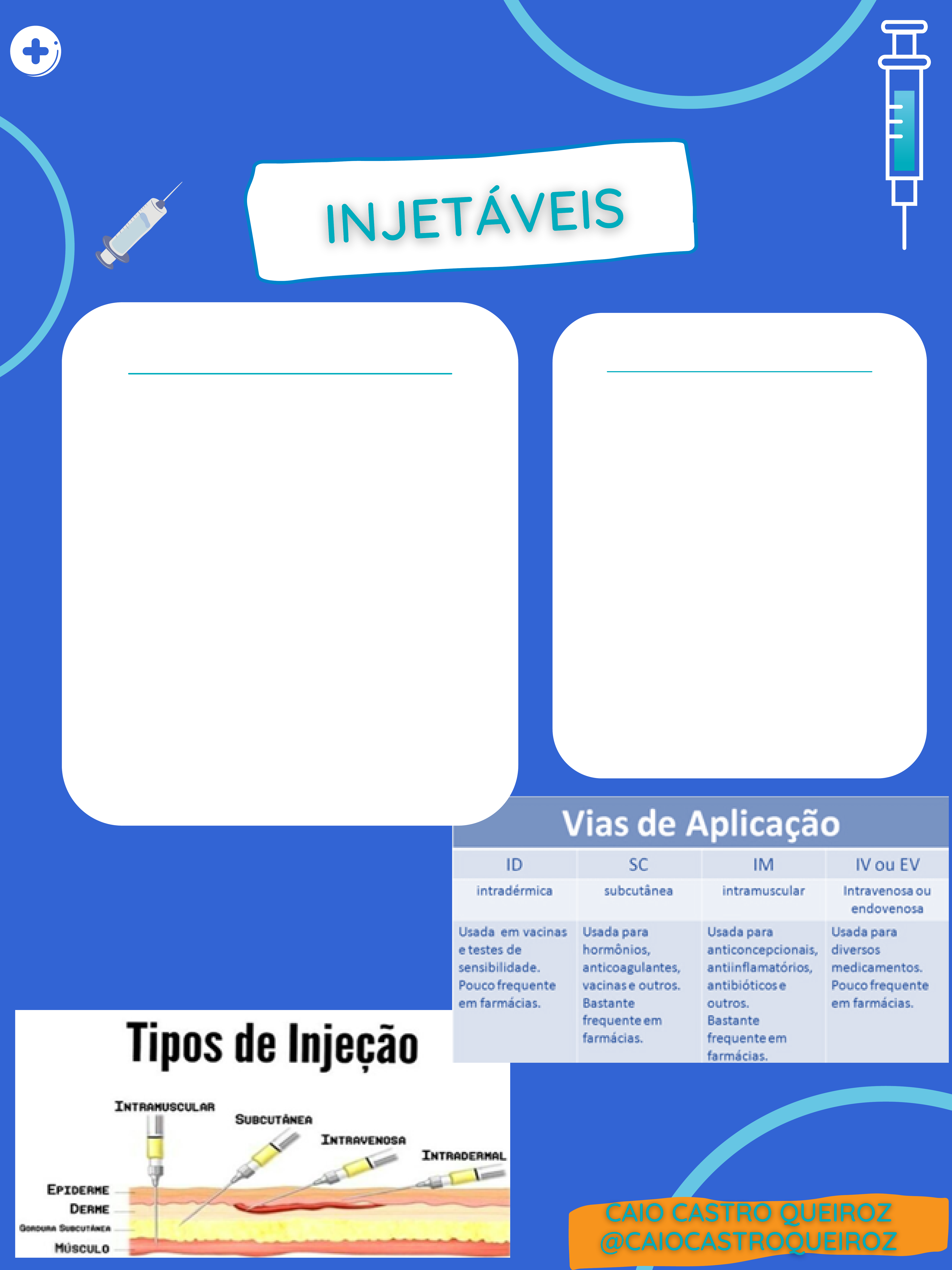 Interação Comunitária PRESCRIÇÃO MÉDICA A prescrição médica deve conter alguns itens que são imprescindíveis para minimizar o risco de eventos adversos visando à segurança do paciente: - Identificação do paciente (nome completo) - Identificação do médico (nome completo carimbo, rubrica, assinatura- e CRM) - Medicação a ser administrada - Dispositivos - Posologia - Dosagem (concentração do fármaco) - Dose (volume de administração) - Via de administração do medicamento - Duração da prescrição. VIAS DE ADMINISTRAÇÃO 1.Intradérmica (abaixo da derme da pele) – absorção lenta. Exemplos: vacinas BCG, Antirrábica. 2.Subcutânea (abaixo da pele) – absorção moderadamente lenta. 3.Intramuscular – absorção mais rápida que as vias subcutâneas e intradérmica. Necessita de aspiração (caso atinja o vaso, deve-se descartar o material). O bisel deve estar lateralizado. 4.Intravenosa - Rápida absorção. Necessita de aspiração (verificação de que atingiu o vaso sanguíneo). CARACTERÍSTICAS E COR DO CANHÃO Agulha mais calibrosa, utilizada para aspiração de medicamentos e acessos intraósseos. CARACTERÍSTICAS DO DISPOSITIVO Agulha utilizada para lactentes (até 2 anos), vasto lateral da coxa. Substâncias oleosas, indivíduos eutróficos. Agulhas de insulina, anticoagulantes, vacinas contra gripes, etc. Calibres pequenos. Pacientes com certo grau de sobrepeso (30x0,7) e pacientes eutróficos (25x07) substâncias aquosas. Agulhas de insulina, anticoagulantes, calibres pequenos. Substâncias oleosas. Absorção rápida, menor do que E.V Ângulo de aplicação: Em pacientes caquéticos (magros) pode-se fazer com 45°, pois o ângulo de 90° poderia atingir o osso. Local: Deltóide (BCG), face anterior do antebraço (recomendado), ventroglútea, vasto lateral da coxa (indicado para lactentes), reto femoral Seringas (1, 3 ou 5 mL) Volume: Agulhas para administrar medicação: 25x7, 25x8, 30x7, 30x8 Bisel: lateralizado Aplicação em ângulo de 90°. Bisel lateralizado (seguindo o sentido das fibras musculares). Geralmente, em indivíduos eutróficos, utiliza-se uma agulha 25x7. É necessário fazer aspiração para verificar se a agulha não está penetrada em um vaso sanguíneo. - Músculo deltoide: 2-3mL em adultos. Em crianças 0,5-1mL. -Músculo vasto lateral da coxa: local de escolha para lactentes (maior massa muscular). Volume de 3-4 mL em adultos e até 2 mL em crianças. - Dorsoglúteo: não deve ser utilizada em crianças menores de 3 anos de idade, pois deambulam a pouco tempo (músculo ainda não desenvolvido – aumento do risco de atingir o nervo ciático). Volume máximo de aplicação de 5 mL. -Ventroglúteo: Corresponde ao glúteo médio e situa-se em local profundo e afastado dos nervos e vasos importantes. Volume máximo de aplicação de até 4 mL. INTRAMUSCULAR Usada em: Absorção lenta Ângulo de aplicação: 10-15° Local: Deltóide (BCG), face anterior do antebraço. Seringas (1 mL) Volume de no máximo 1,5. Normalmente, de 0,5-1 mL Agulhas para administrar a medicação: 13x3, 13x4, 13x4.5. Caso seja utilizada agulhas de 25x7, o ângulo deve ser de 45°. Bisel: para cima - Reações de hipersensibilidade - Vacina BCG - Provas alérgicas - Reação à tuberculose (PPD) SUBCUTÂNEA ·Usada em Absorção: lenta Ângulo de aplicação: 90° (indivíduos eutróficos), 45°(indivíduos caquéticos) Local: Tecido adiposo Seringas (1 ou 3 mL) Volume de no máximo 1,5. Normalmente, de 0,5-1 mL Agulhas para administrar a medicação: 13x3, 13x4, 13x4.5. Caso seja utilizada agulhas de 25x7, o ângulo deve ser de 45°. Bisel lateralizado (protocolo). Aplicação em ângulo de 90° quando é realizada com agulha própria (13x4) em pacientes eutróficos. Quando se tem apenas agulhas de injeção intramuscular (25x7), faz-se no ângulo de 45°. Não é necessária aspiração. - Vacinas (rábica, influenza, sarampo) - Anticoagulantes (heparina) - Hipoglicemiantes (insulina) INTRADÉRMICA RADÉR Locais recomendados para injeções subcutâneas. INTRAVENOSA Absorção: rápida/imediata Bisel: para cima Ângulo de aplicação: em torno de 25-30°, depende da visualização da veia. Realizar aspiração para verificar se a agulha está penetrada no vaso sanguíneo. Volume de medicação variável Jelco - principal dispositivo utilizado para a infusão venosa. Agulhas utilizadas: 25x7 e 30x7 RADÉR A imagem mostra em A o tracionamento da pele no momento da aplicação de injeção intramusculuar como prevenção do retorno do medicamento pelo caminho da agulha. B evidencia que o tronco deixado em Z deixado pela injeção evita o depósito de medicação através do tecido sensibilizado. Esse método é muito utilizado na aplicação de anticoncepcionais. RADÉR CUIDADOS PARA NÃO CONTAMINAR Lavar bem as mãos Manter a agulha sempre coberta Não tocar na agulha e/ou no bico da seringa Não tocar no êmbolo da seringa Não falar próximo à agulha Passar algodão com álcool 70% na ampola e no frasco antes de abrir. Limpar bem o local da aplicação e deixar o álcool 70% secar Manter toda a sala de aplciação higienizada RADÉR