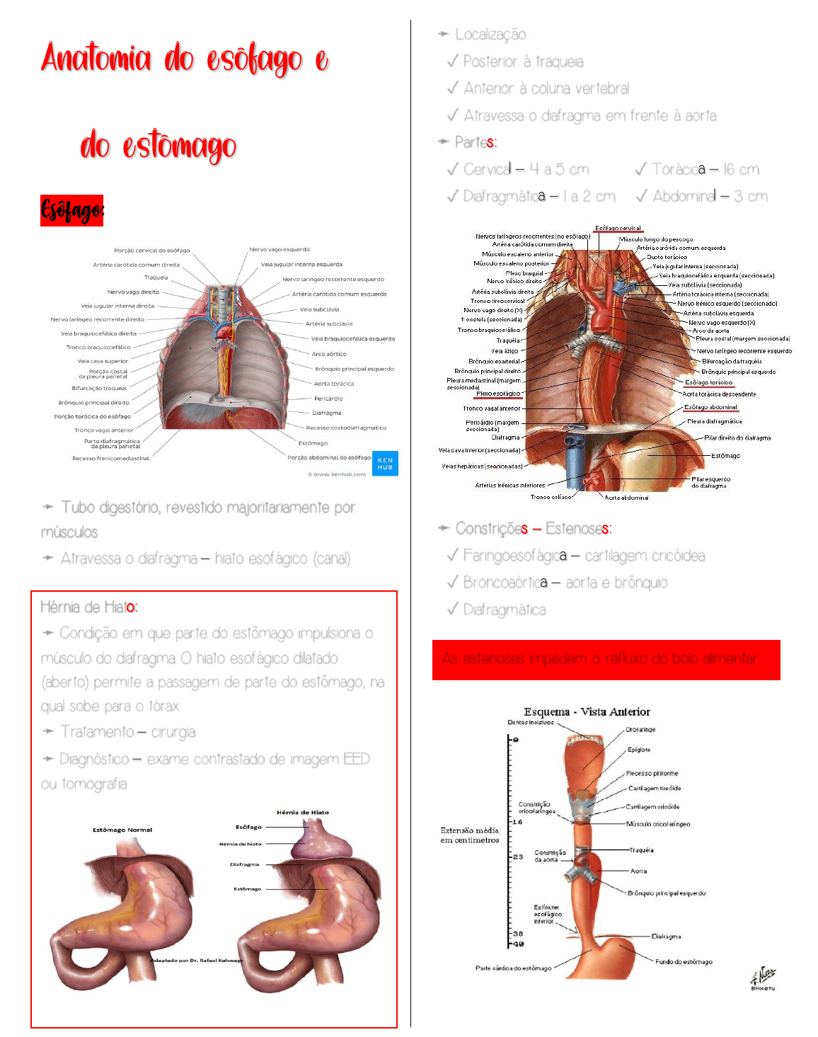 Camila Mariana Castro de Oliveira Medicina Nove de Julho BMF 2 – Anatomia ➛ Tubo digestório, revestido majoritariamente por músculos ➛ Atravessa o diafragma – hiato esofágico (canal) Hérnia de Hiato: ➛ Condição em que parte do estômago impulsiona o músculo do diafragma. O hiato esofágico dilatado (aberto) permite a passagem de parte do estômago, na qual sobe para o tórax. ➛ Tratamento – cirurgia ➛ Diagnóstico – exame contrastado de imagem EED ou tomografia ➛ Localização: ✓ Posterior à traqueia ✓ Anterior à coluna vertebral ✓ Atravessa o diafragma em frente à aorta ➛ Partes: ✓ Cervical – 4 a 5 cm ✓ Torácica – 16 cm ✓ Diafragmática – 1 a 2 cm ✓ Abdominal – 3 cm ➛ Constrições – Estenoses: ✓ Faringoesofágica – cartilagem cricóidea ✓ Broncoaórtica – aorta e brônquio ✓ Diafragmática As estenoses impedem o refluxo do bolo alimentar Camila Mariana Castro de Oliveira Medicina Nove de Julho BMF 2 – Anatomia Irrigação do esôfago: ➛ Artérias esofágicas ✓ Parte cervical: - Artéria subclávia -> tronco tireocervical -> artéria tireóidea inferior -> artérias esofágicas ✓ Parte torácica: - Artéria aorta torácica -> ramos esofágicos ✓ Parte abdominal: - Artéria aorta abdominal -> tronco celíaco -> artéria gástrica esquerda -> artérias esofágicas Drenagem linfática do esôfago: ➛ Parte cervical: ✓ Linfonodos cervicais profundos ✓ Troncos jugulares ➛ Parte torácica: ✓ Linfonodos paratraqueais, mediastinais, paraórticos e traqueiocrônqueais ✓ Troncos boncomediastinais ➛ Parte abdominal: ✓ Linfonodos celíacos ✓ Cisterna do quilo Drenagem do esôfago: ➛ Veias esofágicas ✓ Parte cervical: - Veias esofágicas -> veia tireóidea inferior -> veia braquiocefálica -> veia cava superior ✓ Parte torácica: - Veias esofágicas -> veia hemi-ázigo e hemi-ázigo acessória (lado esquerdo) e veia ázigo (lado direito) -> veia cava superior ✓ Parte abdominal: - Veias esofágicas -> veia gástrica esquerda -> veia porta -> veias hepáticas -> veia cava inferior Inervação do esôfago: ➛ Plexo esofágico: ✓ Fibras simpáticas: - Segmentos torácicos do corno lateral da medula espinal - Tronco simpático - Gânglio celíaco ✓ Fibras parassimpáticas: - Nervo vago (X par) - Hipocondrio direito e esquerdo - Epigástrio (local do estômago) - Região lateral direita e esquerda (“flanco D e E”) - Região umbilical (“mesogastrica”) Camila Mariana Castro de Oliveira Medicina Nove de Julho BMF 2 – Anatomia - Região inguinal direita e esquerdo - Hipogástrio (púbica) ➛ Bolsa muscular em formato de J ➛ Armazena, agita e mistura o alimento ➛ Processo dura em torno de 3-4 horas ➛ Parte mais ampla do tubo digestivo ➛ Armazena 1,5L ou mais (dilatação) ➛ Digestão química (enzimas) ➛ Digestão mecânica (paredes) – músculos que fazem os movimentos peristálticos ➛ Transforma o bolo alimentar em quimo (bolo alimentar -> quimo) ➛ Anatomia: ✓ Cárdia – entrada do estômago, controla o refluxo ✓ Fundo ✓ Corpo – parte central ✓ Antro – logo após o corpo e antes da parte pilórica ✓ Piloro – saída do estômago ✓ Incisura cárdica ✓ Incisura angular ➛ Curvaturas: ✓ Maior – lateral ✓ Menor – medial ➛ Faces: Anterior e posterior ➛ Óstios (esfíncteres): ✓ Esôfago-Gástrico (cardia) ✓ Gastro-Duodenal (piloro) Obs: Movimentação do estômago: ✓ Camada de músculo longitudinal ✓ Camada de músculo circular ✓ Camada de músculo obliquo Camila Mariana Castro de Oliveira Medicina Nove de Julho BMF 2 – Anatomia Vascularização do estômago: ➛ Parte superior da curvatura menor: ✓ Aorta -> Tronco celíaco -> Artéria gástrica esquerda ➛ Parte inferior da curvatura menor: ✓ Aorta -> Tronco celíaco -> Artéria hepática comum -> Artéria hepática própria -> Artéria gástrica direita ➛ Parte superior da curvatura maior: ✓ Aorta -> Tronco celíaco -> Artéria esplênica -> Artéria gastromental esquerda ➛ Parte inferior da curvatura maior: ✓ Aorta -> Tronco celíaco -> Artéria hepática comum -> Artéria gastroduodenal -> Artéria gastromental direita Drenagem do estômago: ➛ Parte superior da curvatura menor: Veia gástrica esquerda -> Veia porta -> Veias hepáticas -> Veia cava inferior ➛ Parte inferior da curvatura menor: ✓ Veia gástrica direita -> Veia porta -> Veias hepáticas -> Veia cava inferior ➛ Parte superior da curvatura maior: ✓ Veia gastromental esquerda -> Veia esplênica -> Veia porta -> Veias hepáticas -> Veia cava inferior ➛ Parte inferior da curvatura maior: ✓ Veia gastromental direita -> Veia mesentérica superior -> Veia porta -> Veias hepáticas -> Veia cava inferior Drenagem linfática e inervação do estômago: