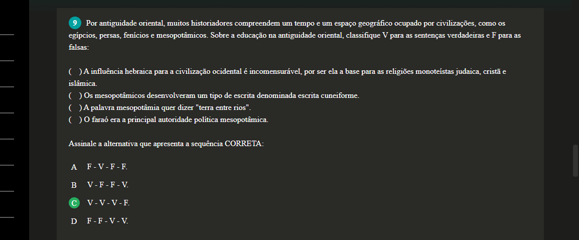 Por antiguidade oriental, muitos historiadores compreendem um tempo e um espaço geográfico ocupado por civilizações, como os egípcios, persas, fenícios e mesopotâmicos. Sobre a educação na antiguidade oriental, classifique V para as sentenças verdadeiras e F para as falsas: Assinale a alternativa que apresenta a sequência CORRETA: ( ) A influência hebraica para a civilização ocidental é incomensurável, por ser ela a base para as religiões monoteístas judaica, cristã e islâmica. ( ) Os mesopotâmicos desenvolveram um tipo de escrita denominada escrita cuneiforme. ( ) A palavra mesopotâmia quer dizer "terra entre rios". ( ) faraó era a principal autoridade política. A - B V-F-F-V. C - D F-F-V-V.