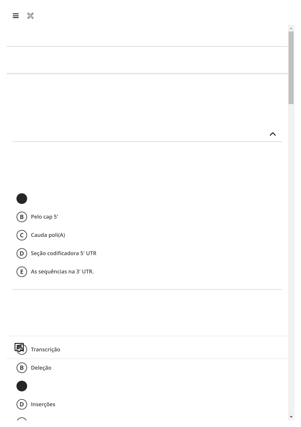 Avaliação On-Line 3 (AOL 3) - Questionário Conteúdo do exercício Comentários Avaliação On-Line 3 (AOL 3) - Questionário Ronaldo Pereira da Silva Pergunta 1 A transcrição nos eucariotos é regulada, também, por fatores pós-transcricionais. Qual das alternativas abaixo não indica um deles? A Resposta corretaRemodelamento da cromatina B Pelo cap 5′ C Cauda poli(A) D Seção codificadora 5′ UTR E As sequências na 3′ UTR. Pergunta 2 Sabendo que a 8-oxoguanina tende a emparelhar com adenina, que tipo de mutação esta alteração induz caso não seja reparada? A Transcrição B Deleção C Resposta corretaTransversão D Inserções Comentários para o aluno Seu instrutor não fez comentários Concluído Nota final Enviado: 09/11/21 20:58 (BRT) ××