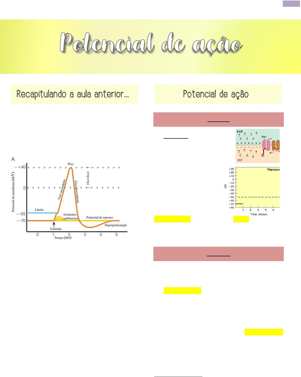 1 IMSD53, RESUMO, Larissa Alves Fernandes. 2021.1 • Estímulos: Os sentidos possuem receptores específicos para detectar um determinado estimulo, esses estímulos precisam ser fortes o suficiente para gerar um potencial de ação. • Potencial limiar: é um limite de voltagem. Quando um estimulo ultrapassar esse limite será permitido o disparo da PA, que automaticamente abre o portão de ativação dos canais dependentes de voltagem do sódio, e assim, inicia-se a fase ascendente. • PRINCÍPIO DO TUDO OU NADA- ou o estimulo é suficiente para alcançar o limiar e gerar a PA ou não terá nada, e quando iniciado não poderá ser interrompido. • Despolarização: fase ascendente; • Repolarização: fase descendente; • Hiperpolarização: fase muito polarizada da membrana. PASSO 1 No REPOUSO o potencial está sendo marcado em (-70 mV). Na situação perimembrana, os canais voltagem dependentes estão fechados (sódio e potássio), portanto, durante o repouso a permeabilidade desses íons estão baixas. PASSO 2 Diante de um estimulo temos uma leve despolarização, não é uma depolarização completa, é apenas um início, mas que alcança o limiar. Ocorre a abertura do canal de sódio (canal de sódio sofre uma conformação alostérica) e ocorre o influxo de sódio para dentro da membrana, a favor do seu gradiente eletroquímico (devido a permeabilidade do íon a membrana). A Fase ascendente está acontecendo, DESPOLARIZAÇÃO rápida e íngreme. Professor Liliany- Aula 2 2 IMSD53, RESUMO, Larissa Alves Fernandes. 2021.1 • Relembrando: Equilíbrio do sódio: +65 mV; A célula (neurônio e muscular) não chega em + 65mV. Quando chega em (+ 30mV / +40mV), os canais de sódio se inativam. PASSO 3 Após a inativação dos canais de sódio, ocorre a ativação do canal de potássio com o retorno do potencial de membrana para o repouso. Essa REPOLARIZAÇÃO ocorre, por que o canal de potássio foi ativado no potencial limiar, porém, ele não se abriu, por que a conformação do canal de potássio é diferente e a abertura desse canal é lenta, ele só estará aberto totalmente no pico do potencial de ação, assim, ocorre efluxo de potássio, a favor do gradiente eletroquímico (o potássio está em maior concentração no meio interno- potencial químico, e o elétrico por que o meio interno está mais positivo). O canal de potássio não se fecha em -70mV ele continua aberto, e o potássio continua saindo, e ele se fecha em torno de -80 mV. • Relembrando o potencial de equilíbrio do potássio é -90 mV/ -100mV. PASSO 4 A lentidão do fechamento do canal de potássio ocasiona a HIPERPOLARIZAÇÃO, assim com o canal demora para abrir, ele demora para fechar, o que permite uma saída (efluxo) extra de potássio. Depois que termina a hiperpolarização, as bombas de sódio e potássio ATPase trabalharão para colocar sódio e potássio em seus níveis de equilíbrio de repouso. Retirando 3 sódios e infundindo 2 potássios, até que o potencial de repouso esteja recuperado. 3 IMSD53, RESUMO, Larissa Alves Fernandes. 2021.1 CANAL DE SÓDIO Quando a célula atinge o pico de despolarização, ocorre o fechamento desse canal, e a primeira comporta a ser desativada é o PORTÃO DE INATIVAÇÃO, essa fase é chamada de PERIODO REFRATÁRIO ABSOLUTO. • O portão de inativação: quando um novo estimulo for acionado não será permitido a despolarização por que o canal está inativado, ou seja, não permite o efluxo de sódio. No repouso o canal de sódio está fechado com o PORTÃO DE ATIVAÇÃO, o que significa que ao chegar o estimulo, nada impede que o portão de ativação se abra rapidamente, essa fase é chamada de PERÍODO REFRATÁRIO RELATIVO. • Na Hiperpolarização, aproximadamente metade dos canais de sódio estão trocando os portões de fechamento, de inativado para portão de ativação. No final da hiperpolarização, todos os canais estarão fechados novamente pelo portão de ativação, se o estimulo for forte o suficiente para gerar um potencial de membrana, vai ocorrer um novo potencial de ação. Qual a importância dos períodos refratários? 1. Garantir o sentido único (unidirecional) do impulso nervoso; 2. Limitar em cerca de (4 a 5 ms) a frequência do PA. A AMPLITUDE DO PA DE CADA CÉLULA EXCITÁVEL É INVARIÁVEL Como funciona a questão dos PA para estímulos contínuos? Os neurônios decodificam o aumento ou a redução na intensidade do estimulo em função da frequência dos impulsos elétricos. O que muda é a intensidade. A amplitude e a duração são fixa. QUANTO MAIOR A FREQUÊNCIA DE PA, MAIOR A FREQUÊNCIA DE NEUROTRANSMISSORES. Ex. Em uma atividade física intensa, pode ser gerado uma FC de até 200 bpm. O que garante que o coração na bata 300 bpm? É por conta do período refratário, por que cada PA precisa de um intervalo de pelo menos (4 a 5 ms). O deslocamento do PA caminha ao longo de todo o nervo. 4 IMSD53, RESUMO, Larissa Alves Fernandes. 2021.1 Na depolarização, os íons Na+ se difundem para o interior por muitos milímetros em ambas as direções, aumentando a voltagem da membrana adjacente acima do valor limiar, deflagrando novos PA! Digamos que nesse ponto da membrana (imagem abaixo, seta verde indicando), ocorreu a abertura do canal de sódio e houve um influxo de sódio, então esse ponto da membrana ficou positivo, o POTENCIAL DE AÇÃO NÃO É BIDIRECIONAL, mas o sódio que entra não fica parado nesse ponto da membrana, por que as membranas adjacentes estão negativas. OBS: Esse axônio é uma fibra nervosa, várias fibras nervosas juntas, forma um nervo, que tem vários centímetros. O sódio será dispensado bidireccionalmente, ocorrendo um fluxo de corrente. Por que o potencial de ação não volta para atrás? Esse potencial de ação não pode voltar para atrás por que o anterior fechou o portão inativação, então esse canal está no seu período refratário absoluto. O que acontece é que sódio que foi para a 