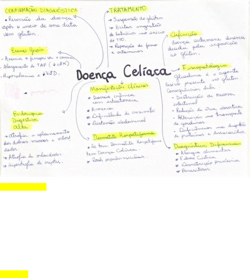 DOENÇA CELÍACA INTRODUÇÃO Doença autoimune de caráter PERMANENTE que aparece em indivíduos geneticamente predispostos, sendo desencadeada pela exposição ao glúten na dieta. Acomete predominantemente o sexo feminino e de origem caucasiano. Na maioria das vezes os pacientes são oligo ou assintomáticos. Apenas 10% dos pacientes recebem o diagnóstico. GLÚTEN Todos os cereais (milho,trigo,aveia,arroz,centeio,cevada...) apresentam o glúten em sua composição. O gluten é um reservatório de prolamina, é essa molécula que irá lesar o sistema digestivo. A prolamina se apresenta de diferentes formas a depender do cereal analisado. Trigo (gliadina), cevada (hordeína), centeio (secalina)... FISIOPATOLOGIA Gluten digerido liberação de gliadina gliadina interage com enzima transglutaminase tecidual formação do complexo macronuclear (transglutaminase está presente nas paredes dos enterócitos na mucosa do intestino delgado). Esse complexo macronuclear pode ser reconhecido como um antígeno, o que leva a estimulação de linfócitos T CD4 gliadina especifico e a apresentação de resposta imune destruição de mucosa intestinal (destruição importante no intestino delgado) MÁ ABSORÇÃO. Má absorção leva a: · Redução da área absortiva · Alteração dos mecanismos da cisão molecular de nutrientes · Alteração nos processos de transporte intracelular de gorduras · Redução da digestão luminal de proteínas pela deficiência de enteroquinase (enzima de borda de escova, a qual está rebaixada na doença celíaca). MANIFESTAÇÕES CLÍNICAS A intensidade dos sinais e sintomas irá depender da extensão do acometimento intestinal. Podem ser elas: · Distensão abdominal · Diarreia crônica com esteatorreia · Dificuldade de crescimento · Desnutrição · Anorexia · Carência de múltiplos nutrientes (ferro, acido fólico, cálcio e vit D, Vit k, vit A, vit E). DERMATITE HERPETIFORME ou DERMATITE DE DUHRING-BROCQ Essa dermatite é considerada uma forma de doença celíaca da pele. Podendo estar presente em pacientes com ou sem queixas intestinais. Nem todo mundo que tem Doença Celíaca tem Dermatite herpetiforme, mas todo mundo que tem Dermatite herpetiforme tem Doença Celíaca. Rash papulovesicular pruriginoso que se distribui sobre regiões extensoras das extremidades e sobre o tronco, couro cabeludo, pescoço e glúteos. EXAMES COMPLEMENTARES O encontro de alterações laboratoriais também depende da extensão do comprometimento intestinal. Exames gerais: · Anemia (geralmente é hipocrômica e microcítica, a deficiência de ferro é a mais frequente). · Alargamento do TAP/INR (má absorção de vit K) · Hipocalcemia e hipovitaminose D (má absorção de cálcio e vit D) · Hipovitaminose Vit A, Vit E... · Acidose metabólica hiperclorêmica e hipocalêmica (pela perda intestinal de HCO3- e K+): quadros de diarreia importante Sorologia: Todo paciente suspeito deve realizar a pesquisa de autoanticorpos: · IgA anti - tTG (IgA antitransglutaminase tecidual): 95 % de sensibilidade e especificidade · Se IgA anti - tTG (-) porém alta suspeita clínica dosagem de IgA total Espera-se que os títulos dos autoanticorpos (qualquer um deles) tornem-se indetectáveis após 3-12 meses de dieta sem glúten. Logo a dosagem seriada serve para verificar a adesão terapêutica. Endoscopia digestiva alta: Deve ser realizada em pacientes na suspeita de Doença Celíaca com sorologia positiva. Se sorologia (-) porém alta suspeita EDA As alterações esperadas na doença celíaca em atividade são: · Macroscópia: atrofia e aplainamento das dobras mucosas e vilosidades. · Microscopia: infiltração linfocítica no epitélio e na lâmina própria, com atrofia das vilosidades e hiperplasia das criptas. Aplainamento das pregas duodenais na doença celíaca. As alterações endoscópicas e histopatológicas NÃO SÃO PATOGNOMÔNICAS de doenças celíaca (alpv, espru tropical, enterite eosinofílica causam os mesmo sintomas). ATENÇÃO: O que confirma em definitivo o diagnóstico de doença celíaca é a reversão do quadro após o início de uma dieta sem glúten. Microscopia: Sem doença celíaca. Atrofia das vilosidades na doença celíaca. DIAGNÓSTICO Não é necessário repetir a EDA para demonstrar a reversão das alterações endoscópicas após o início do tratamento. Porém, alguns autores, acreditam que o diagnóstico fique mais “seguro” com a repetição da EDA e da sorologia. TRATAMENTO A doença celíaca é uma doença permanente em que o indivíduo desenvolve uma hipersensibilidade ao glúten. Tratamento precoce é a suspensão do glúten na dieta. Nunca iniciar dieta antes da biópsia. Por se tratar de uma doença autoimune responde ao tratamento imunossupressor (glicocorticóides) Evitar no inicio do tratamento a ingestão de laticínios (é frequente a coexistência de uma intolerância a lactose transitória). Reposição de nutrientes como ferro, cálcio, ácido fólico, vitaminas A, B12,D,E,K DIAGNÓSTICO DIFERENCIAL · Alergia alimentar · Fibrose cística · Desnutrição primária · Parasitoses