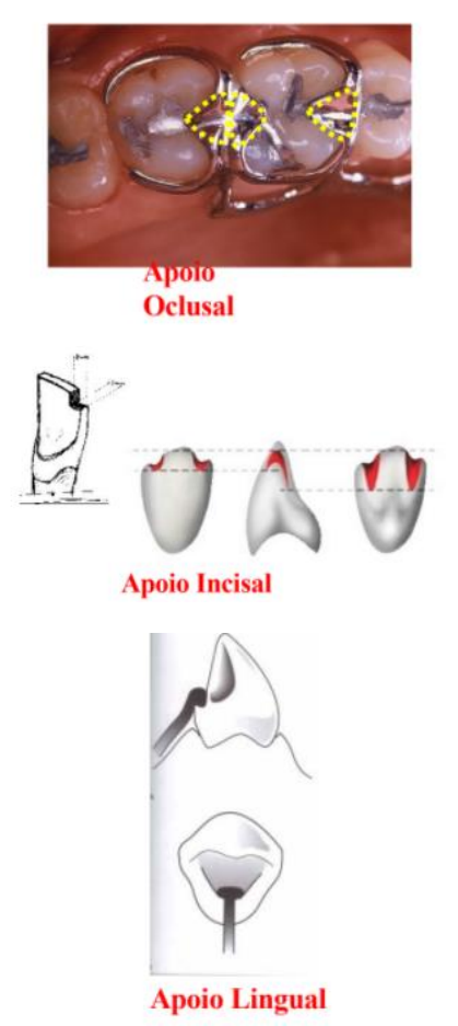 SISTEMA DE RETENÇÃO E ESTABILIZAÇÃO DA PPR É constituído por elementos encarregados de prover a retenção e a estabilização da PPR durante a função mastigatória e os movimentos normais da musculatura bucal. Elementos constituintes deste sistema são: Grampos e/ou encaixes; Apoios; Barras ou conectores. O estudo dos sistemas da PPR pode ser dividido em 4 grupos de elementos que se inter-relacionam: Sistema de suporte ou de sustentação; Sistema de retenção e estabilização; Sistema de conexão (conectores); Sistemas de selas e dentes artificiais. Apoios e nichos Os apoios estão localizados nas faces oclusais dos dentes posteriores e palatina dos dentes anteriores. Nicho está diretamente ligado aos apoios. Apoios – asseguram que a carga excessiva sobre os dentes artificiais durante a função mastigatória seja transmitida para os dentes suportes de forma adequada. Tipos de apoios de acordo com a face e o grupo de dentes a que pertence o suporte: a) Oclusais – sobre as superfícies oclusais de pré-molares e molares. b) Incisais – sobre as superfícies incisais de incisivos e caninos. c) Linguais ou palatinos – sobre superfícies do mesmo nome de incisivos e caninos. Nichos – são preparos arredondados feitos para alojar os apoios. Função dos apoios 1) Transmitir forças no sentido do longo eixo dos dentes pilares - Caso o dente tenha alguma coroa é feito uma outra coroa específica com o preparo (coroa fresada). - O apoio deve ser feito na proximal, deve ser visto a inclinação do longo eixo do dente para que seja possível equilibrar com o apoio. Caso não seja colocado no local correto, pode causar a movimentação do dente em direção do apoio (pode causar alterações no ligamento periodontal). 2) Estabilização da PPR nos dentes pilares diretos ou indiretos, atuando como retentor indireto quando presente nos pilares indiretos. 3) Proteção da papila gengival dos dentes pilares diretos contra o esmagamento e impacto de alimentos. 4) Manter a posição dos grampos. 5) Impedir a extrusão dos dentes. Extrusão – movimentação contra o sentido de mastigação (movimento de saída). Os dentes antagonistas impedem que a força de extrusão seja muito alta. 6) Fixação. Impede o deslocamento da PPR no sentido ocluso-gengival. Impede que os grampos desçam. Classificação dos apoios 1) Apoios primários, principais ou diretos: Partes dos grampos de retenção direta, localizado ao lado do espaço protético. Estão sobre dentes pilares diretos. Função de fixação. 2) Apoios secundários, auxiliares ou indiretos: Pode estar como uma parte integrante de um grampo de retenção indireta, localizado distante do espaço protético, ou isolado, unido diretamente na barra por meio de um conector menor. Possui função de retentor indireto estabilizando a tendência da PPR de rotação em torno de um fulcro. Fulcro – tendência da prótese “girar” em torno do seu eixo de sustentação. O apoio deve ficar do lado oposto do espaço protético livre. 3) Apoios intracoronários: Localizados dentro do contorno da coroa. 4) Apoios extra coronários: Aplicados diretamente sobre o esmalte ou peça protética, sem preparo prévio no dente. Não há preparo de nicho. Nichos ausentes A transmissão de forças laterais, nocivas aos dentes pilares. Como não yteria espaço suficiente os apoios oclusais ocasionariam contatos prematuros. Regras básicas Extensão do apoio: monorradiculares (extensão até a metade do dente) e mais de uma raiz (extensão de uma dos raízes). Angulação do apoio (em relação ao conector menor). Ideal é que forme um ângulo reto – deve ser perpendicular ao conector menor. Regiões para confecção 1º Dentes – anteriores (região de cíngulo) e posteriores (broca 2131). 2º Superfície – esmalte, restaurações diretas e restaurações indiretas (para pilar de prótese removível). Transmissão de esforços Transmissão de esforços em espaço intercalado - O apoio deve estar localizado vizinho ao espaço protético. - Localização da área retentiva. Coloca-se mais um apoio na região contrária para estabilizar o dente. Variações da regra: Estética: aumenta o apoio e diminui o braço de retenção. Transmissão de esforços em extremidade livre - O apoio deve se localizar distante do espaço protético. - Utilizado em prótese dento-mucosuportada. - O apoio deve estar contrário ao espaço protético livre. Características dos nichos em dentes posteriores Parede pulpar ligeiramente côncava (em forma de colher). Rede circundante em forma triangular. Ângulos internos arredondados. Aproximadamente 1,5 mm de profundidade. Esmalte: metade da distância entre pontas de cúspide. Paredes circundantes ligeiramente expulsivas. Parede pulpar ao longo eixo do dente. Broca 2131. Características dos nichos em dentes anteriores Ângulos internos arredondados. Parede cervical ao longo eixo do dente. Parede lingual sem interferir com o eixo da prótese. Broca 2131; Preparo dos nichos Em dentes posteriores não vizinhos aos espaços protéticos (pilares indiretos): Romper as vertentes proximais das cúspides próximas aos nichos preparados. Possibilitar a união dos braços dos grampos circunferenciais aos apoios, sem que ocorram interferências oclusais. Sobre restauração de almágama deve- se preservar 1 mm de AAA para evitar fratura. Nicho esculpido em resina composta: Usar IACO. Cíngulo de dentes anteriores. Parede cervical perpendicular ao longo eixo do dente. Menos invasiva e reversível. Nicho confeccionado em restauração indireta: Esculpido durante o enceramento. As dimensões podem ser maiores. Polimento - Facilita a higienização pelo paciente e ajuda a prevenir a retenção de placa bacteriana. Mesmas fresas usadas durante o preparo dos nichos, porém utilizadas em baixa rotação. Multilaminadas com 12 e 30 lâminas. Disco de feltro com pasta diamantada.