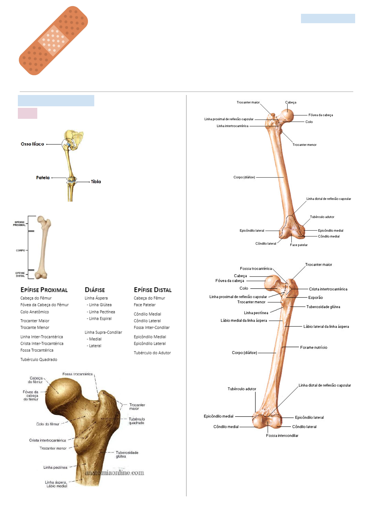 Por Yan Slaviero Augusto ANATOMIA Aula 1 Ossos do membro inferior FÊMUR Se articula com 3 Ossos: ● Ilíaco ● Patela ● Tíbia 1 Período 3- Módulo 3- Anatomia por Yan Slaviero Augusto PATELA Articula-se apenas com o Fêmur. Localiza-se no Interior do Tendão do Quadríceps Femoral BASE: Larga e Superior ÁPICE: Pontiagudo e Inferior FACES ● ANTERIOR ● POSTERIOR: Articular BORDAS ● PROXIMAL ● MEDIAL ● LATERAL TIBIA ● EXTREMIDADE SUPERIOR: Platô Tibia, Funciona como uma base para a Articulação do Fêmur ● EXTREMIDADE INFERIOR: Forma a Articulação do Tornozelo 2 Período 3- Módulo 3- Anatomia por Yan Slaviero Augusto FÍBULA PÉ TARSO ● FILEIRA PROXIMAL: Tálus e Calcâneo ● FILEIRA DISTAL: Navicular, Cuboide, Cuneiformes (Medial, Intermédio e Lateral) 3 Período 3- Módulo 3- Anatomia por Yan Slaviero Augusto METATARSO ● METATARSIANOS: I, II, III, IV e V DEDOS ● FALANGES: Proximal, Medial e Distal FILEIRA PROXIMAL: 1. Tálus (Tróclea) 2. Calcâneo (Túber do calcaneo) FILEIRA DISTAL: 3. Navicular 4. Cubóide 5. Cuneiforme Medial 6. Cuneiforme Intermédio (Médio) 7. Cuneiforme Lateral METATARSO FALANGE 4 Período 3- Módulo 3- Anatomia por Yan Slaviero Augusto Articulação dos membros inferiores QUADRIL 1. ARTICULAÇÃO COXO-FEMURAL A) LIGAMENTOS COXO-FEMURAL 5 Período 3- Módulo 3- Anatomia por Yan Slaviero Augusto JOELHO 2. ARTICULAÇÃO COXO-FEMURAL A) LIGAMENTO PATELAR ● Patela - Tuberosidade da Tíbia - Porção Central do Tendão do Quadríceps Femoral - Face Posterior - Coxim Gorduroso Infra-Patelar – Memebrana Sinovial - Bolsa Sinovial - Tíbia 6 Período 3- Módulo 3- Anatomia por Yan Slaviero Augusto ● MENISCO ● LIGAMENTO CRUZADO ● LIGAMENTOS COLATERAIS LIGAMENTOS POPLÍTEOS 7 Período 3- Módulo 3- Anatomia por Yan Slaviero Augusto MOVIMENTOS DO JOELHO ● Flexão ● Extensão ● Rotação (Diminuta e somente quando está �etido) OBS: Essas Articulações não estão bem Adaptadas umas as outras. Movimento não seja apenas. Gínglimo, de dobradiça. Existe certo grau de Deslizamento e Rotação ARTICULAÇÕES ENTRE TÍBIA E FÍBULA 8 Período 3- Módulo 3- Anatomia por Yan Slaviero Augusto ● TORNOZELO TALO-CRURAL 1. TIBIO-FIBULAR DISTAL 2. TIBIO-FIBULAR DISTAL A) LIGAMENTOS ● TIBIO-FIBULAR ANTERIOR: Bordas Adjacentes de Tíbia e FíbulA ● TIBIO-FIBULAR POSTERIOR: Bordas Adjacentes de Tíbia e FíbulA ● TRANSVERSO INFERIOR: Maléolo lateral - Face Articular da Tíbia ● INTERÓSSEO: Entre a superfície rugosa contínua da tíbia e da fíbula. Principal laço de união dos entre os ossos 3. TALO-CRURAL TORNOZELO 9 Período 3- Módulo 3- Anatomia por Yan Slaviero Augusto 1. lIGAMENTO DELTOIDE 2. lIGAMENTO COLATERAL LATERAL DO TORNOZELO 10 Período 3- Módulo 3- Anatomia por Yan Slaviero Augusto 11