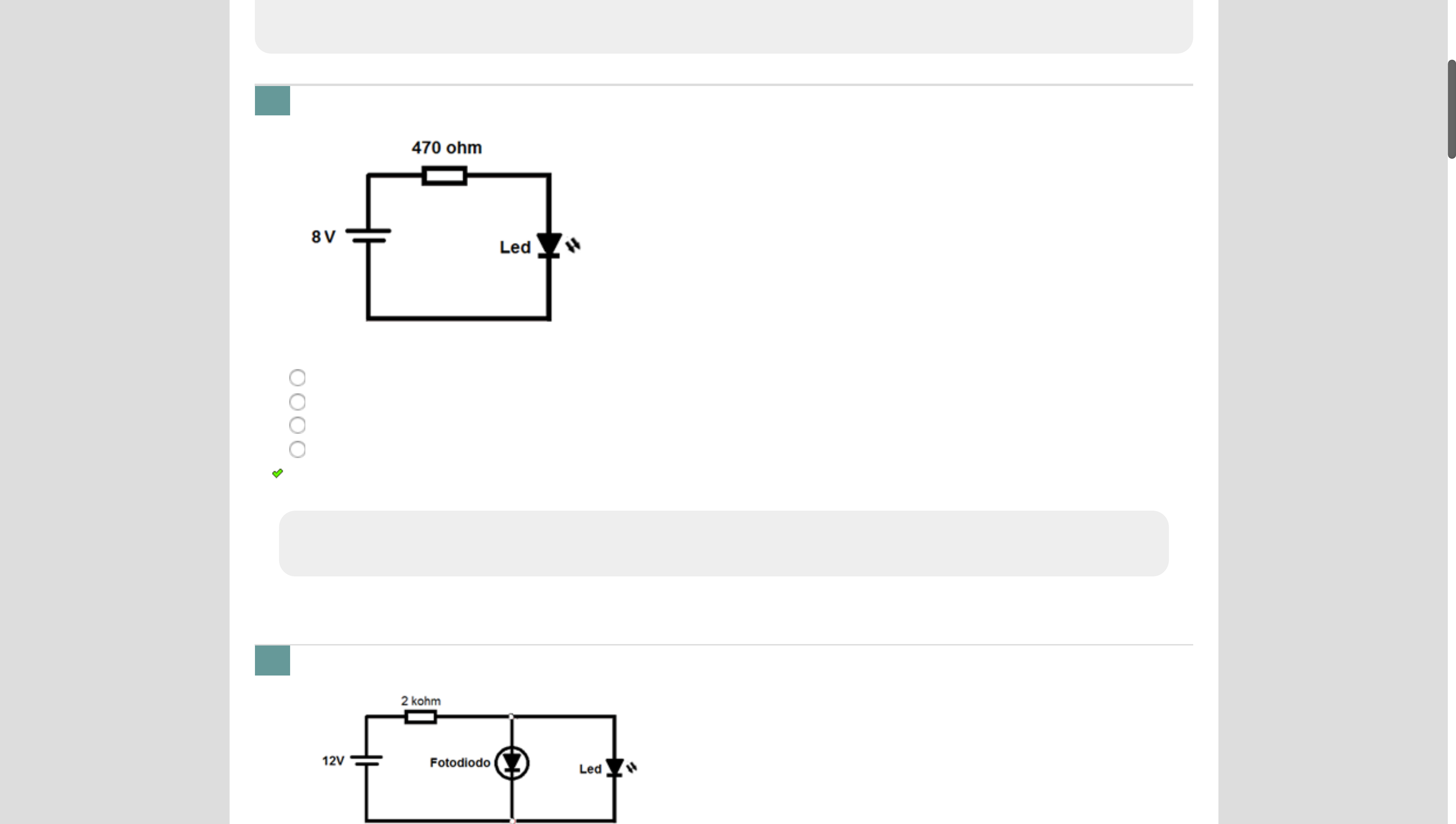 Observando-se o circuito a seguir e sabendo que o diodo LED encontra-se aceso e com uma tensão sobre ele de 2,0 V, qual é, aproximadamente, a corrente do circuito? Observe o circuito a seguir. Sabendo-se que o fotodiodo, quando não iluminado, apresenta uma resistência máxima de 10 kΩ e acende um diodo com uma tensão de 2,0 V, qual é a corrente que atravessa o fotodiodo nessa condição? Após responde cada questão, você terá acesso ao gabarito comentado e/ou à explicação da mesma. Aproveite para se familiarizar com este modelo de questões que será usado na sua AV e AVS. 1. 21,28 mA 17 mA 4,25 mA 0 mA 12,8 mA Data Resp.: 11/10/2021 11:21:46 Explicação: A resposta certa é: 12,8 mA 2.