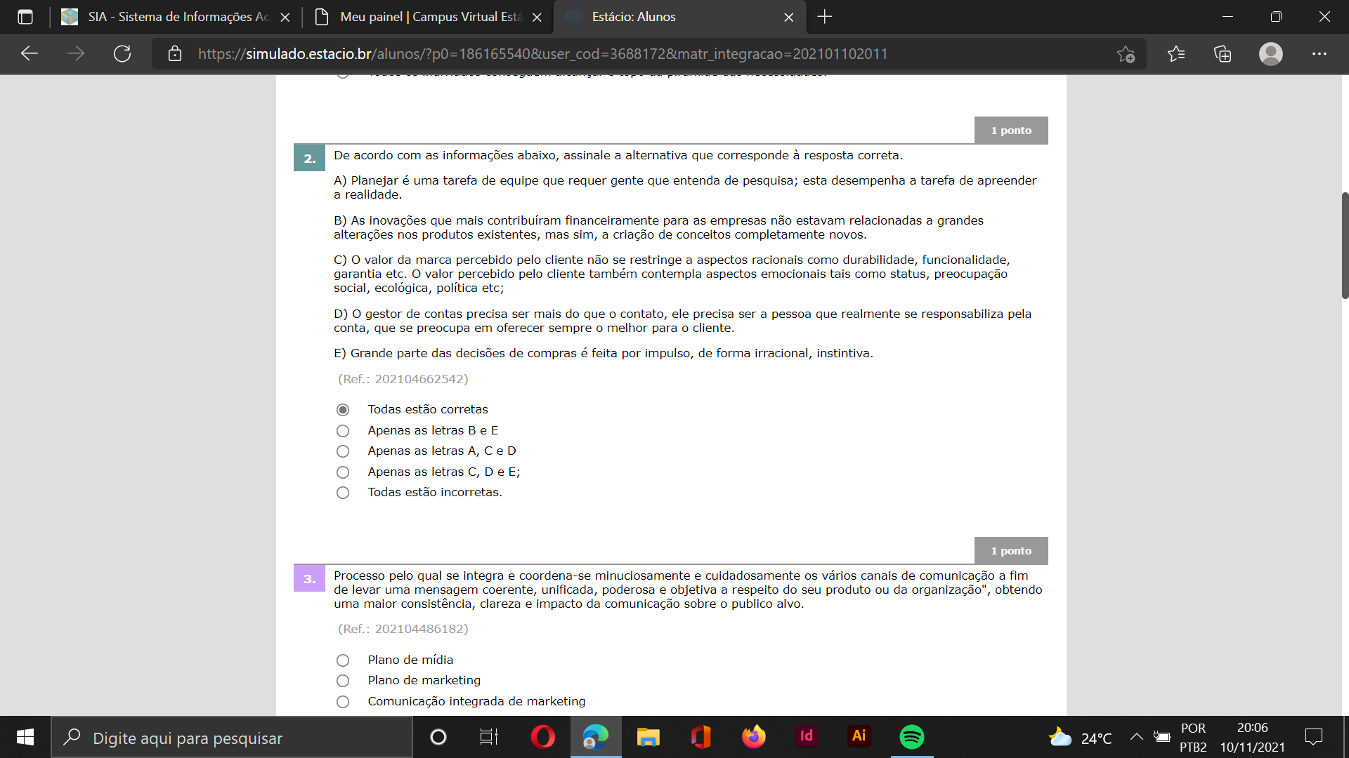 De acordo com as informações abaixo, assinale a alternativa que corresponde à resposta correta. A) Planejar é uma tarefa de equipe que requer gente que entenda de pesquisa; esta desempenha a tarefa de apreender a realidade. B) As inovações que mais contribuíram financeiramente para as empresas não estavam relacionadas a grandes alterações nos produtos existentes, mas sim, a criação de conceitos completamente novos. C) valor da marca percebido pelo cliente não se restringe a aspectos racionais como durabilidade, funcionalidade, garantia etc. valor percebido pelo cliente também contempla aspectos emocionais tais como status, preocupação social, ecológica, política etc; D) gestor de contas precisa ser mais do que o contato, ele precisa ser a pessoa que realmente se responsabiliza pela conta, que se preocupa em oferecer sempre o melhor para o cliente. E) Grande parte das decisões de compras é feita por impulso, de forma irracional, instintiva. Todas estão corretas Apenas as letras B e E Apenas as letras A, C e D Apenas as letras C, D e E Todas estão incorretas