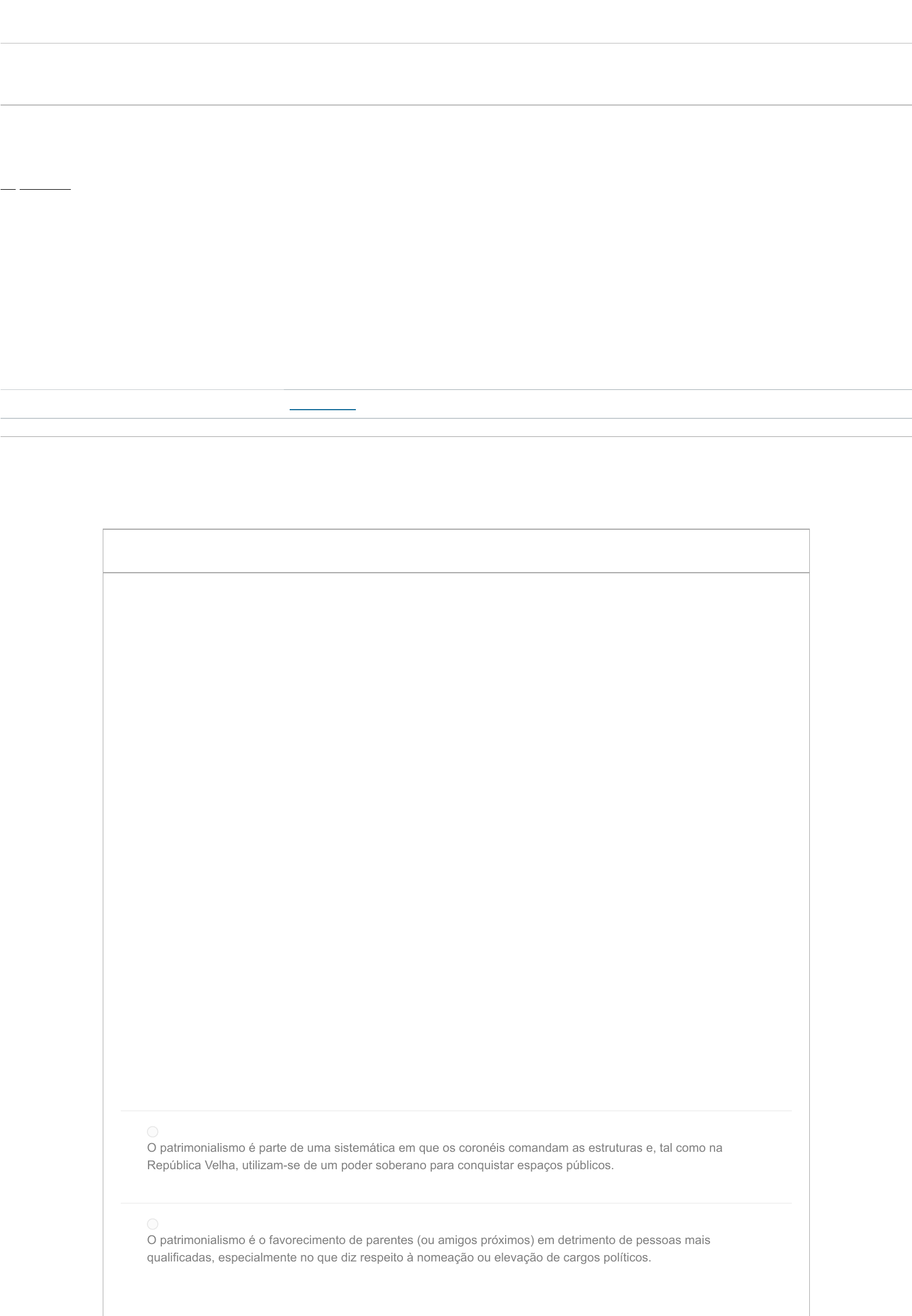 Atividade Objetiva 2 Entrega 17 out em 23:59 Pontos 1 Perguntas 5 Disponível 16 ago em 0:00 - 17 out em 23:59 2 meses Limite de tempo Nenhum Tentativas permitidas 2 Instruções Este teste foi travado 17 out em 23:59. Histórico de tentativas Tentativa Tempo Pontuação MAIS RECENTE Tentativa 1 10 minutos 1 de 1 Pontuação desta tentativa: 1 de 1 Enviado 17 out em 22:47 Esta tentativa levou 10 minutos. Importante: Caso você esteja realizando a atividade através do aplicativo "Canvas Student", é necessário que você clique em "FAZER O QUESTIONÁRIO", no final da página. 0,2 / 0,2 ptsPergunta 1 Leia o texto a seguir: O PATRIMONIALISMO NO NORDESTE. Sem dúvida alguma podemos dizer que a política é uma das grandes paixões do povo nordestino, sobretudo, o nordestino interiorano. Quando chega o ano eleitoral não se fala em outra coisa nos municípios. Onde quer que você vá tem sempre alguém comentando sobre os candidatos e perguntando em quem você vai votar. Em seguida desenvolve-se um diálogo apontando o porquê de votar em A ou B. No período de campanha eleitoral todo dia de comício é dia de festa. Os mais apaixonados acompanham fielmente seus candidatos em seus giros pelos bairros e povoados, a cada fala do candidato (que geralmente é xingando o grupo da oposição) o povo aplaude, grita e festeja. Além disso, enfeitam suas casas com adesivos, bandeiras e colocam os jingles eleitorais para tocar em suas casas, é como se cada casa virasse um “mini comitê” eleitoral. Até mesmo as crianças entram no jogo enfeitando suas bicicletas com adesivo de seu candidato do coração e acompanhando seus comícios. Para eles é importante mostrar sua fidelidade (geralmente passada de geração em geração) por determinado grupo político. No interior, mesmo o eleitor mais “isento” tem um comentário sobre a política local na ponta da língua. Embora pareça um ponto de vista estereotipado da política interiorana essa ainda é a realidade de muitas cidades, principalmente aquelas governadas sobre o jugo do patrimonialismo. Disponível em <https://93noticias.com.br/noticia/53112/o-patrimonialismo-no-nordeste>, acesso em 03/12/2020. Levando em consideração o tema abordado no texto, assinale a opção correta. O patrimonialismo é parte de uma sistemática em que os coronéis comandam as estruturas e, tal como na República Velha, utilizam-se de um poder soberano para conquistar espaços públicos. O patrimonialismo é o favorecimento de parentes (ou amigos próximos) em detrimento de pessoas mais qualificadas, especialmente no que diz respeito à nomeação ou elevação de cargos políticos. https://famonline.instructure.com/courses/16581/quizzes/70266/history?version=1 O patrimonialismo provém do patrimônio e patrimonial, ao qual o se significado está diretamente relacionado ao poder dos campos público e privado e que são confundidos, sendo levados em consideração como se fosse a “mesma coisa”. É no patrimonialismo que o Estado considera todas as instâncias como se fosse suas. Correto!Correto! A alternativa está correta, pois o patrimonialismo deriva da palavra patrimônio e patrimonial, cujo significado diz respeito ao poder em que as esferas pública e privada são confundidas como a mesma coisa. Neste sentido, o Estado é considerado pelo político como um patrimônio seu. Segundo Max Weber "o patrimonialismo é um tipo de dominação onde a administração pública é um assunto pessoal que diz respeito aqueles que têm o que perder se a política lhes falta". O patrimonialismo é uma ideologia que defende que a sociedade é mais bem servida (ou servida de maneira mais eficiente) quando governada ou guiada por conceitos ou pessoas oriundos da cultura, doutrina e sistema militares. O patrimonialismo é refere-se à administração e propriedade pública ou coletiva dos meios de produção e distribuição de bens, propondo-se a construir uma sociedade caracterizada pela igualdade de oportunidades. 0,2 / 0,2 ptsPergunta 2 Leia o texto abaixo: BLACK FRIDAY: UM FESTIVAL DE CONSUMO VORAZ. Alguns países mais ricos economicamente são apresentados como modelos culturais que são impostos aos países menos desenvolvidos; além disso, esta disparidade econômica produz nos países pobres uma situação muito triste e superficial de nostalgia que leva a copiar e comprar em vez de criar. O que muitas vezes está por trás da imagem de um país de sucesso econômico são as muitas vozes que gritam em silêncio e os muitos ombros que carregam o peso de um sistema baseado no consumo excessivo. É o caso, por exemplo, da Black Friday estadunidense, um festival de consumismo, um desfile de "ofertas" e um vai e vem de cartões de crédito que deslizam ao ritmo dos "meses sem juros" até as pessoas se endividarem o máximo possível porque, como se diz: quem não deve nada, não tem nada! Texto adaptado de <https://www.vaticannews.va/pt/mundo/news/2020-11/black-friday-um-festival-de- consumo-voraz-genaro-avila-valencia.html>, acesso em 03/12/2020. A partir do que foi descrito, o consumo voraz e a necessidade que a sociedade tem em consumir é considerado um consumismo que é o ato de comprar o que é essencial e necessário, sendo motivado pela necessidade de comprar. Esse é considerado um comportamento construtivo e que impacta em diversos aspectos da vida cotidiana. consumismo que é a capacidade do ser humano, que pertence ao homem, em ser curioso, em ser corajoso, de enfrentar riscos para construir, elaborar, produzir, formular algo inédito e original. consumismo que está ligado à toda pessoa física ou jurídica que adquire ou utiliza produto ou serviço como destinatário final, sendo o seu comprador(a). consumismo que se dá pela compra excessiva e sem qualquer necessidade, sendo a sua motivação a de impulso ou o desejo de compra. O consumismo é um comportamento destrutivo que está ligado diretamente ao dia a dia das pessoas e seus aspectos de vida e de 
