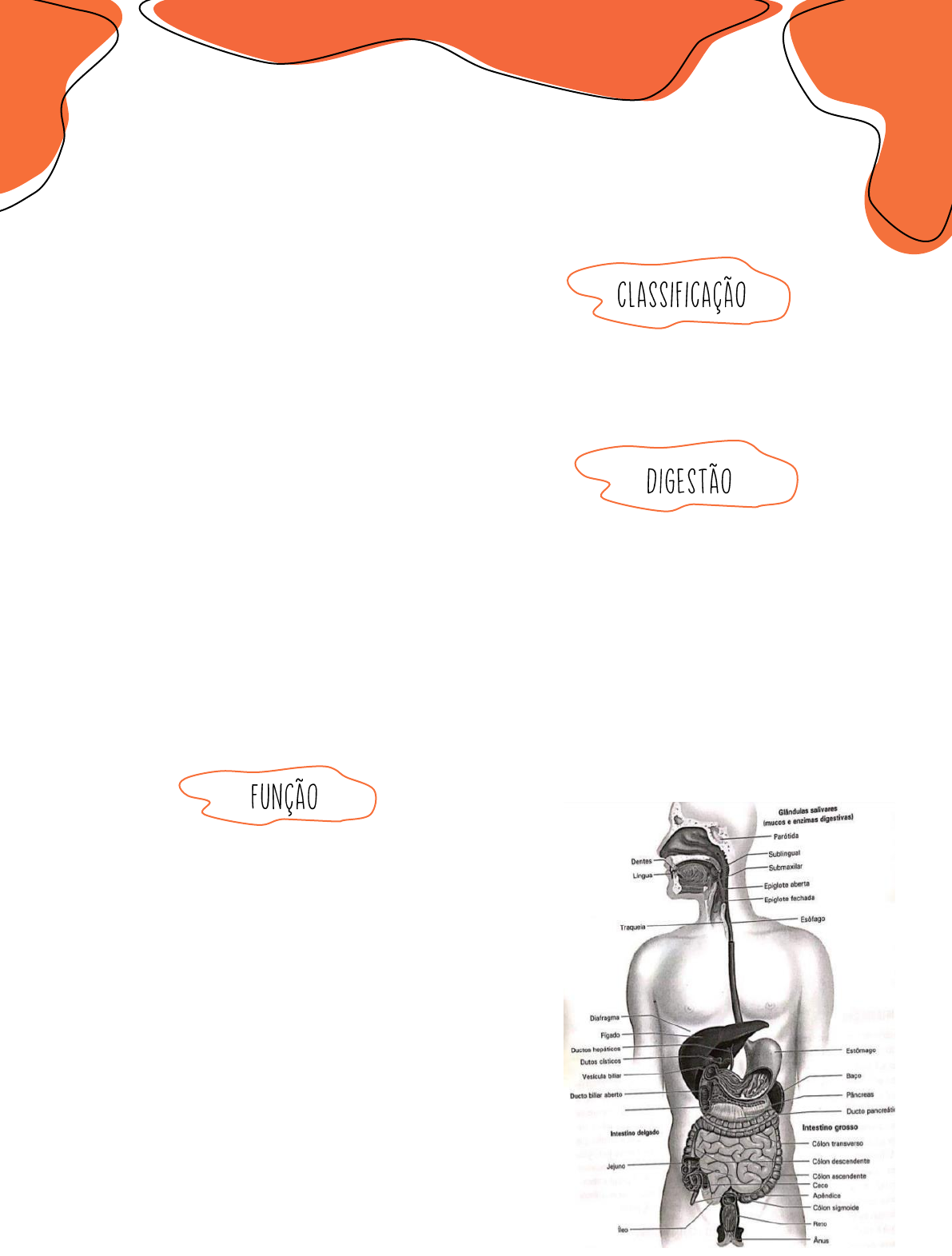 Carboidratos o São compostos orgânicos formados de carbono e água = Cn(H2O)n. Encontrados ligados por uma ligação covalente, a proteínas e lipídios. Essa glicoconjugação origina glicoproteínas, proteoglicanos e glicolipídios; o Principais fontes energéticas: processos de digestão e absorção no intestino delgado e em menor proporção pela fermentação microbiana no intestino grosso; o Frutas, hortaliças, leguminosas, cereais, leite, mel; o Textura e flavor nos alimentos processados; o Disponíveis (digeríveis): hidrolisáveis pelas enzimas do TGI humano e entram nas vias metabólicas o Não disponíveis (não digeríveis): não são hidrolisáveis pelas enzimas, mas são fermentados pela microbiota intestinal, formando ácidos graxos de cadeia curta, que são absorvidos e fornecem energia em menor proporção → Fibras Alimentares o Energéticos e mais eficientes que os lipídios e as proteínas no fornecimento de energia para a atividade celular – 4kcal a cada g. o São economizadores de proteínas, poupando- as para sua função construtora (anticetogenica). o Precursor de composto orgânico – DNA. Ribose e desoxirribose. o Crescimento bacteriano – lactose + tempo no intestino = aumenta o nº de bactérias. (prebióticos e probióticos). Função intestinal – celulose + CHO insolúvel = aumento do bolo fecal (ajuda nos movimentos peristálticos) o Destoxificação – facilita a eliminação de toxina. o Monossacarídeos (não sofre hidrólise): glicose o Dissacarídeo (sofre hidrólise): sacarose o Polissacarídeo (sofre hidrólise): amido o Quando comemos, inicia-se o processo de digestão (na boca), após isso a absorção e liberação de nutrientes no sangue – metabolização; o Não há digestão de carboidrato no estômago, ela ocorre no intestino delgado. o ID + Pâncreas = auxiliam na quebra de enzimas para ser absorvidas pelo organismo.