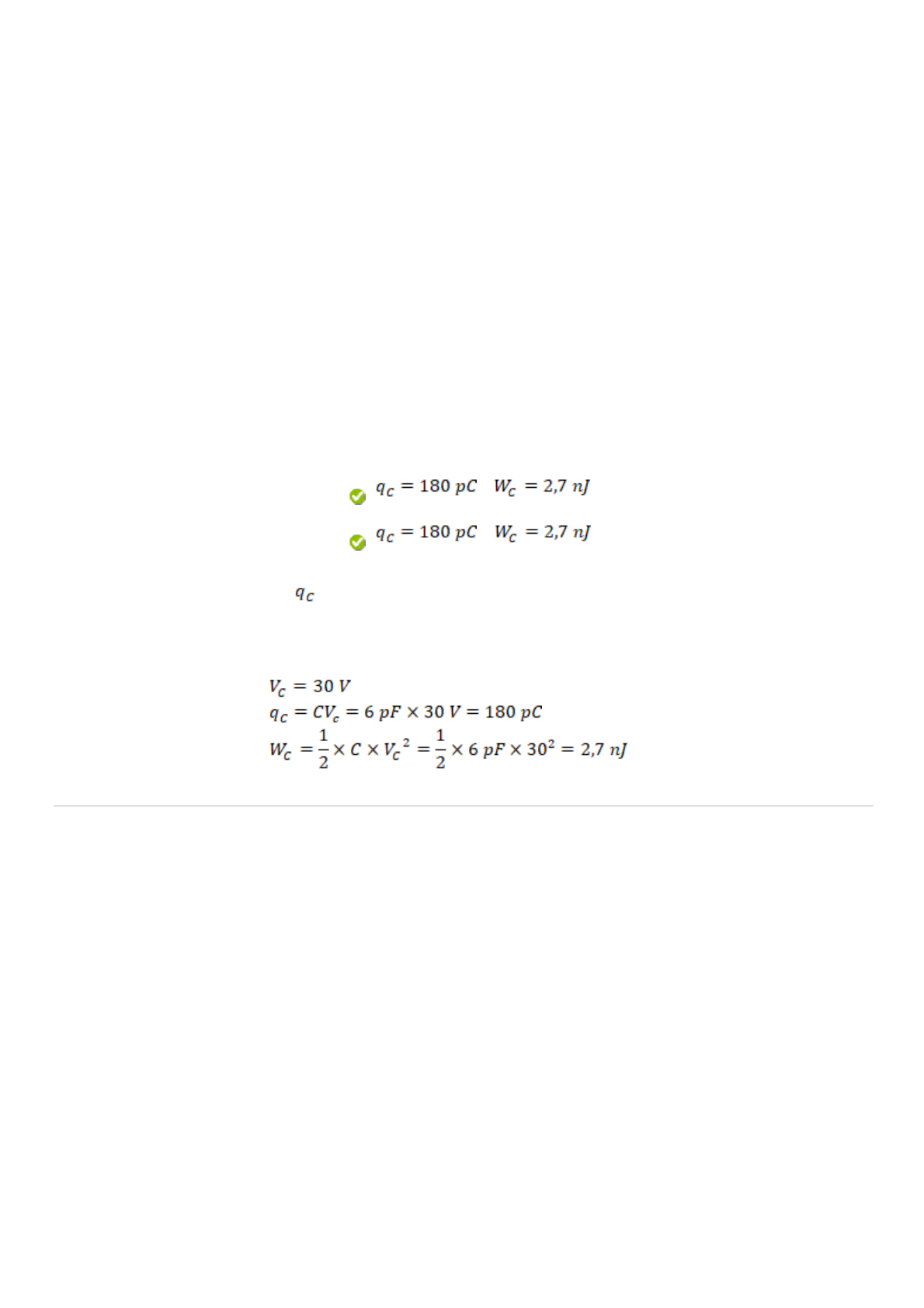 11/11/2021 GRA0605 CIRCUITOS ELÉTRICOS I GR0325-212-9 - 202120.ead-17348.01 https://anhembi.blackboard.com/webapps/late-course_engine_soap-BBLEARN/Controller?COURSE_ID=_735876_1 1/10 Pergunta 1 Resposta Selecionada: Resposta Correta: Comentário da resposta: Leia o trecho a seguir: “Capacitor é um elemento passivo projetado para armazenar energia em seu campo elétrico. Além dos resistores, os capacitores são os componentes elétricos mais comuns, sendo largamente utilizados em eletrônica, comunicações, computadores e sistemas de potência, assim como, por exemplo, em circuitos de sintonia de receptores de rádio e como elementos de memória dinâmica em sistemas computadorizados” (ALEXANDER; SADIKU, 2013, p. 133). ALEXANDER, C. K.; SADIKU, M. N. O. Fundamentos de circuitos elétricos . 5. ed. São Paulo: Bookman, 2013. A partir da leitura do trecho e considerando os conteúdos estudados no ebook da disciplina, questiona-se: se uma tensão de 30 V está conectada a um capacitor de 6 pF, qual é a carga elétrica e a energia armazenada no capacitor? Assinale a alternativa correta: , , Resposta correta. A alternativa está correta porque a carga elétrica representada por é igual à capacitância representada por C multiplicada pela tensão do capacitor. A energia armazenada no capacitor é calculada multiplicando-se a capacitância elevada a dois da tensão do capacitor e dividindo-se o produto por dois. Pergunta 2 Leia trecho a seguir: “Um capacitor é formado por duas placas condutoras separadas por um isolante. Em diversas aplicações práticas, as placas podem ser constituídas por folhas de alumínio, enquanto o dielétrico pode ser composto por ar, cerâmica, papel ou mica” (ALEXANDER; SADIKU, 2013, p. 191). ALEXANDER, C. K.; SADIKU, M. N. O. Fundamentos de circuitos elétricos . 5. ed. São Paulo: Bookman, 2013. Diante do exposto, responda: qual é a energia armazenada nos capacitores do circuito abaixo? Assinale a alternativa correta: 1 em 1 pontos 1 em 1 pontos 11/11/2021 GRA0605 CIRCUITOS ELÉTRICOS I GR0325-212-9 - 202120.ead-17348.01 https://anhembi.blackboard.com/webapps/late-course_engine_soap-BBLEARN/Controller?COURSE_ID=_735876_1 2/10 Resposta Selecionada: Resposta Correta: Comentário da resposta: Figura - Circuito com fonte de tensão, resistores e capacitores Fonte: Elaborada pelo autor. Resposta correta. A alternativa está correta, pois temos dois capacitores e . Podemos substituir a fonte de tensão de 18V e o resistor de 3 kΩ em série por uma fonte de corrente de 6 mA e um resistor de 3 kΩ em paralelo. Para calcular a corrente no resistor de 3 kΩ, utilizamos a regra de divisor de corrente. Então, e e . Portanto: Pergunta 3 Leia o trecho a seguir: “Capacitores em paralelo se associam da mesma forma que os resistores em série. A capacitância equivalente de N capacitores ligados em paralelo é a soma de suas capacitâncias individuais. A capacitância equivalente dos capacitores associados em série é o inverso da soma dos inversos das capacitâncias individuais” (ALEXANDER; SADIKU, 2013, p. 197). ALEXANDER, C. K.; SADIKU, M. N. O. Fundamentos de circuitos elétricos . 5. ed. São Paulo: Bookman, 2013. Diante do exposto, qual é a tensão sobre o capacitor C3 no circuito abaixo? Assinale a alternativa correta: 1 em 1 pontos 11/11/2021 GRA0605 CIRCUITOS ELÉTRICOS I GR0325-212-9 - 202120.ead-17348.01 https://anhembi.blackboard.com/webapps/late-course_engine_soap-BBLEARN/Controller?COURSE_ID=_735876_1 3/10 Resposta Selecionada: Resposta Correta: Comentário da resposta: Figura - Circuito com fonte de tensão e capacitores Fonte: Elaborada pelo autor. Resposta correta. A alternativa está correta, pois dois capacitores de C1 e C2 estão em paralelo, logo, a capacitância equivalente para esses dois capacitores é de 40 mF (20mF + 20mF). A capacitância equivalente de 40mF está em série com o capacitor de 60mF. A capacitância equivalente para o circuito será: . Então: Pergunta 4 Leia o trecho a seguir: “Se um circuito tiver duas ou mais fontes independentes, uma maneira de determinar o valor de uma variável específica (tensão ou corrente) é usar a análise nodal ou a de malhas. Outra forma seria determinar a contribuição de cada fonte independente à variável e então somá-las. Essa última forma é conhecida como superposição” (ALEXANDER; SADIKU, 2013, p. 115). ALEXANDER, C. K.; SADIKU, M. N. O. F undamentos de circuitos elétricos . 5. ed. São Paulo: Bookman, 2013. A partir dessas informações, considere o circuito abaixo: 1 em 1 pontos 11/11/2021 GRA0605 CIRCUITOS ELÉTRICOS I GR0325-212-9 - 202120.ead-17348.01 https://anhembi.blackboard.com/webapps/late-course_engine_soap-BBLEARN/Controller?COURSE_ID=_735876_1 4/10 Resposta Selecionada: Resposta Correta: Comentário da resposta: Figura - Circuito com fonte de tensão, fonte de corrente e resistor Fonte: Elaborada pelo autor. A partir da figura acima e do fragmento citado, calcule a tensão , utilizando propriedade de superposição e, em seguida, julgue qual das alternativas é a correta: 12 12 Resposta correta. A alternativa está correta porque analisamos a contribuição de cada fonte de forma independente, aplicando a fonte de 12 e considerando a fonte de 3 A como contato aberto, calculamos a tensão sobre o resistor e, desse modo, temos: . Aplicando a fonte de 3 A, a corrente sobre o resistor será igual a 0 A ; sendo assim, a tensão sobre o resistor será igual a zero. Pergunta 5 Leia o trecho a seguir: “O teorema de Norton afirma que um circuito linear de dois terminais pode ser substituído por um circuito equivalente formado por uma fonte de corrente I em paralelo com um resistor R , em que I é a corrente de curto-circuito através dos terminais e R é a resistência de entrada ou equivalente nos terminais quando as fontes independentes forem desligadas” (ALEXANDER; SADIKU, 2013, p. 128). ALEXANDER, C. K.; SADIKU, M. N. O. Fundamentos de circuitos elétri
