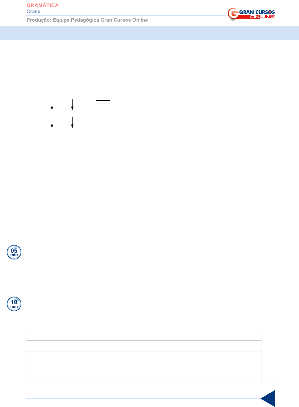 1 Crase GRAMÁTICA www.grancursosonline.com.br Produção: Equipe Pedagógica Gran Cursos Online CRASE CRASE (PALAVRA GREGA QUE SIGNIFICA FUSÃO/MISTURA) Regra n. 1 – a regra é vinculada à regência. Crase é a fusão de dois “as”, em que um é a preposição, requerido pelo regente, e o outro é o artigo, admitido pelo regido. a + a(s) = à(s) art. regente prep. regido O regente pode ser um verbo ou um nome. O regido é o termo que comple- menta o regente. O acento que indica o fenômeno da crase é o acento grave. A desembargadora Célia Pinheiro apresentou um voto contrário à cassação. • Termo regente: contrário, que pede preposição. • Termo regido: cassação, que admite artigo. • Dessa forma, utiliza-se o acento grave. No exemplo “o deputado promoveu a ruptura”, o verbo não pede preposição. Ainda que a palavra regida, ruptura, admita o artigo, não se deve empregar o sinal indicativo de crase. No entanto, veja a seguinte oração: “Obedeço a ela”. Nesse caso, o verbo pede preposição (é verbo transitivo indireto), contudo a palavra “ela” não admite artigo, pois não se emprega “a ela”, portanto o “a” é apenas preposição. Da mesma forma, funciona na oração “Obedeço a essa mulher”, pois “essa” não admite artigo. AN O TAÇ Õ ES http://www.grancursosonline.com.br 2 Crase GRAMÁTICA www.grancursosonline.com.br AN O TA Ç Õ ES Produção: Equipe Pedagógica Gran Cursos Online A desembargadora Célia Pinheiro apresentou um voto contrário a cassações. Nesse caso, não há concordância de “a” com “cassações”, portanto não há artigo aqui, mas apenas preposição. A desembargadora Célia Pinheiro apresentou um voto contrário às cassações. Nesse caso, contudo, há a presença do plural “as”, portanto há o artigo con- cordando de maneira adequada com o regido plural feminino “cassações”. Direto do concurso 1. (CESPE/STJ/ANALISTA/2018) Embora a perspectiva analítica de cada um desses autores divirja entre si, eles estão preocupados em desenvolver for- mas de promoção de situações de justiça social e têm hipóteses concretas para se chegar a esse estado de coisas. A correção gramatical do texto seria mantida caso se empregasse o acento indicativo de crase no vocábulo “a” em “a esse estado de coisas”. Comentário Não seria mantida a correção gramatical, pois o vocábulo “esse” não admite artigo, portanto não há crase. 2. (CESPE/STM/2018) Um zoológico serve para muitas coisas, algumas delas edificantes. Mas um zoológico serve, principalmente, para que o homem te- nha a chance de, diante da jaula do outro, certificar-se de sua liberdade e da superioridade de sua espécie Sem prejudicar a correção gramatical tampouco alterar o sentido do trecho, a expressão “serve para” (linha 1) poderia ser substituída por convém à. Comentário O termo convém à apresenta crase errada. http://www.grancursosonline.com.br 3 Crase GRAMÁTICA www.grancursosonline.com.br AN O TAÇ Õ ES Produção: Equipe Pedagógica Gran Cursos Online 3. (CESPE/SEDF/2017) Para que a disseminação pública da cultura fuja a de- terminações pragmáticas e economicistas, é necessário um espaço público de preservação, de apropriação e de reflexão. A correção gramatical do texto seria prejudicada caso se empregasse o sinal grave indicativo de crase no “a” em “fuja a determinações”. Comentário O “a” aqui funciona apenas como preposição. 4. (CESPE/ABIN/OFICIAL DE INTELIGÊNCIA/2018) Se praticada por autorida- de superior, a espionagem pode configurar, além de infração penal, crime de responsabilidade, que, a despeito do nome, não tem natureza de crime em sentido técnico, mas, sim, de infração política sujeita a cassação de manda- to e suspensão de direitos políticos O paralelismo sintático do último parágrafo do texto seria prejudicado se fos- se inserido sinal indicativo de crase em “a cassação” (linha 3). Comentário Paralelismo – é quando há tratamento simétrico na oração. Direto ao trabalho e à remuneração = há paralelismo, pois há preposição + artigo nos termos grifados. Direito a trabalho e a remuneração = há paralelismo, pois há apenas preposição. Direito a trabalho e remuneração = há paralelismo, pois a preposição deve vir expressa no primeiro regido, mas pode vir elíptica no segundo regido. O paralelismo recai sobre o artigo: se retira-se um artigo, retira-se os outros. Se coloca-se um artigo, deve-se colocar em todos os termos relacionados. Na questão em tela, o paralelismo seria realmente prejudicado. http://www.grancursosonline.com.br 4 Crase GRAMÁTICA www.grancursosonline.com.br AN O TA Ç Õ ES Produção: Equipe Pedagógica Gran Cursos Online 11. (CESPE/TRT/ANALISTA/2013) Em muitos lugares, as mulheres não têm apoio para funções essenciais da vida humana. Elas são menos nutridas que os homens, menos saudáveis e mais vulneráveis à violência física e ao abuso sexual. A supressão do sinal indicativo de crase, em “vulneráveis à violência física e ao abuso sexual” (linha 4), prejudicaria a correção gramatical do período, ainda que o termo “ao” fosse também suprimido. Comentário A supressão prejudicaria a correção, contudo, se for retirado igualmente o “ao”, a correção se manteria. GABARITO 1. E 2. E 3. C 4. C 11. E ���������������������������Este material foi elaborado pela equipe pedagógica do Gran Cursos Online, de acordo com a aula preparada e ministrada pelo professor Claiton Natal. A presente degravação tem como objetivo auxiliar no acompanhamento e na revisão do con- teúdo ministrado na videoaula. Não recomendamos a substituição do estudo em vídeo pela leitura exclusiva deste material. http://www.grancursosonline.com.br