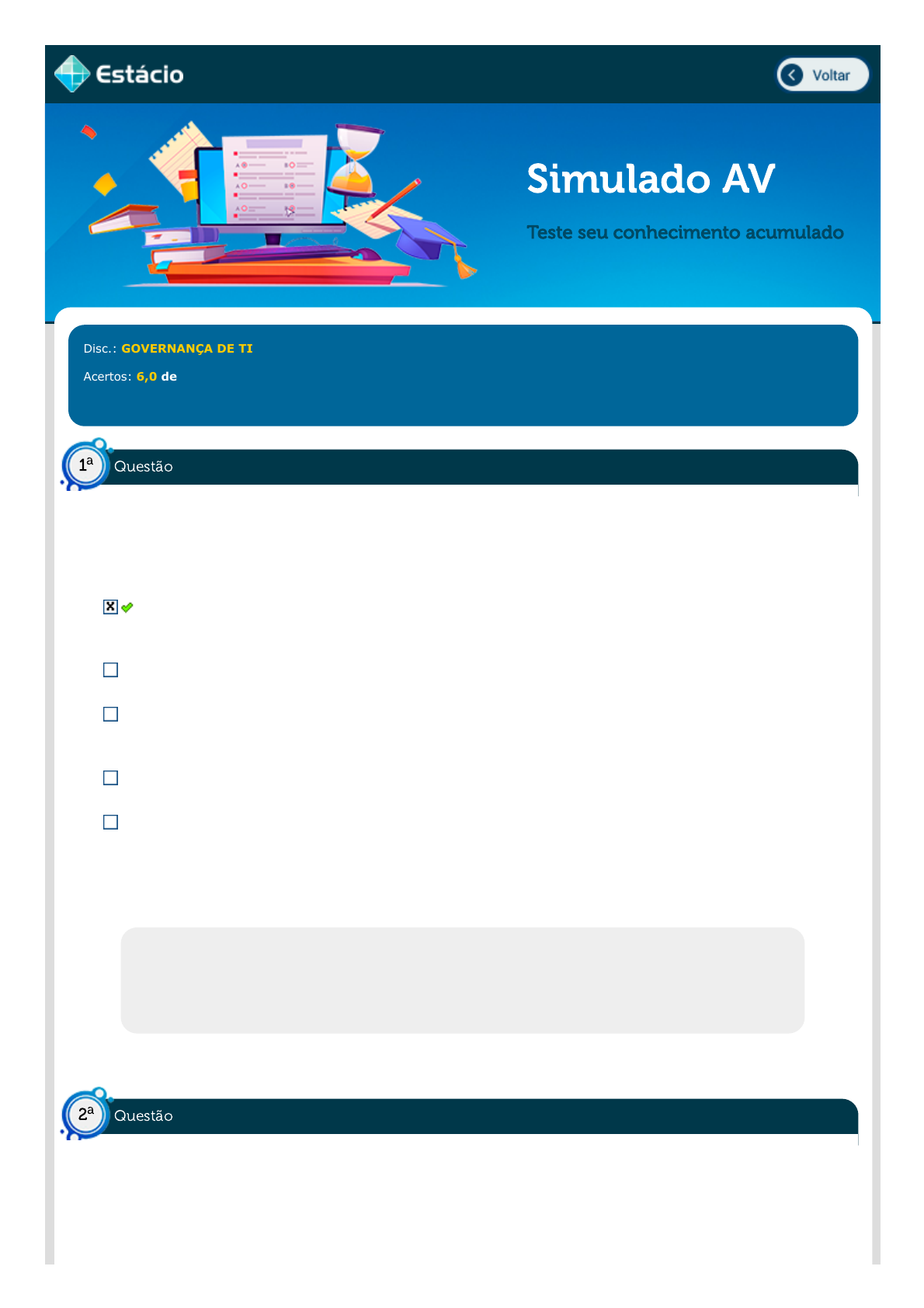 29/10/2021 20:03 Estácio: Alunos 1/5 Simulado AV Teste seu conhecimento acumulado Disc.: GOVERNANÇA DE TI Acertos: 6,0 de 10,0 Acerto: 1,0 / 1,0 O planejamento é um dos fatores fundamentais de uma organização para que os resultados sejam alcançados e as metas atingidas. Uma empresa apresenta as sete etapas do Planejamento Estratégico, entre elas a declaração de Visão e Missão da organização. Em relação a Missão da organização, assinale a alternativa correta. São os princípios e crenças que servem de guia para os comportamentos, atitudes e decisões de todas as pessoas envolvidas na busca dos objetivos da organização. São os pontos fortes e fracos, juntamente comas oportunidades e ameaças do setor onde a organização atua. É uma declaração sobre o que a organização é, definindo seu propósito, finalidade de sua existência, motivo pela qual foi criada, além da sua identidade. É o futuro da organização, o que ela pretende alcançar e como ela deve ser reconhecida. São forças macroambientes e micro ambientais que afetam a habilidade de obter lucro dentro da organização. Respondido em 29/10/2021 19:30:04 Explicação: A resposta correta é: São os princípios e crenças que servem de guia para os comportamentos, atitudes e decisões de todas as pessoas envolvidas na busca dos objetivos da organização. Acerto: 0,0 / 1,0 Quanto à Governança Corporativa temos que: I- é o conjunto de processos, costumes, políticas, leis, regulamentos e instituições que regulam a maneira como uma empresa é dirigida, administrada ou controlada. Questão1 a Questão2 a https://simulado.estacio.br/alunos/inicio.asp javascript:voltar(); 29/10/2021 20:03 Estácio: Alunos 2/5 II- são stakeholders: os acionistas, segurados, corretores e beneficiários. III- Tem havido um renovado interesse no assunto desde 2001, particularmente devido aos espetaculares colapsos de grandes corporações norte-americanas como a Enron Corporation e Worldcom, levando o governo federal norte- americano, em 2002, a aprovar a Lei Sarbannes-Oxley, com o propósito de restaurar a confiança do público em geral na governança corporativa. Verdadeiro, Verdadeiro, Verdadeiro. Falso, Verdadeiro, Falso. Verdadeiro, Falso, Verdadeiro. Verdadeiro, Verdadeiro, Falso. Verdadeiro, Falso, Falso. Respondido em 29/10/2021 19:33:56 Explicação: A resposta correta é: Verdadeiro, Verdadeiro, Verdadeiro. Acerto: 0,0 / 1,0 Que ferramenta(s) a TI deve utilizar para assegurar a satisfação dos clientes que garanta o alinhamento estratégico necessário? Estudo de maturidade dos serviços de TI. Planejamento Estratégico de TI (PETI) e Plano Diretor de TI (PDTI). Planejamento Estratégico de TI (PETI). Plano Diretor de TI (PDTI). Terceirização total ou parcial dos serviços de TI. Respondido em 29/10/2021 19:39:24 Explicação: A resposta correta é: Terceirização total ou parcial dos serviços de TI. Acerto: 1,0 / 1,0 O Planejamento Estratégico de TI (PETI) é composto de funções que definirão as estratégias que serão adotadas pela TI para disponibilizar os recursos tecnológicos para que os objetivos da empresa sejam alcançados. Dentro desta perspectiva, o PETI contempla: A visão de futuro da empresa. Pedidos da alta administração. Requisitos de negócios. As decisões sobre investimento da TI. Software implantados. Respondido em 29/10/2021 19:41:29 Questão3 a Questão4 a 29/10/2021 20:03 Estácio: Alunos 3/5 A resposta correta é: A visão de futuro da empresa. Acerto: 1,0 / 1,0 Qual das alternativas corresponde ao conjunto de componentes do SVS? Utilidade, Cadeia de Valor, Práticas, Princípios Orientadores. Melhoria Continua, Produtos, Governança, Princípios Orientadores. Princípios e Guias, Utilidade, Governança, Melhoria Continua. Valor, Cadeia de Valor do Serviço, Praticas, Melhoria Continua. Cadeia de Valor, Praticas, Melhoria Continua, Governança. Respondido em 29/10/2021 19:44:01 Explicação: Resposta correta: Valor, Cadeia de Valor do Serviço, Praticas, Melhoria Continua Acerto: 0,0 / 1,0 Como as atividades da cadeia de valor de serviço são utilizadas? Na criação de prática. Na criação de demanda. Na criação de princípios orientadores. Na criação de valor. Na criação de fluxos de valor. Respondido em 29/10/2021 19:46:36 Explicação: Resposta correta: Na criação de fluxos de valor. Acerto: 1,0 / 1,0 Quais as principais vantagens de se utilizar indicadores de desempenho em uma organização? As organizações podem otimizar e aprimorar seus processos, redução de custos de forma significativa, a organização poderá investir naquilo que potencializa e gera resultado, a organização poderá fazer uso mais estratégico de seus recursos, a organização atingirá um elevado nível de maturidade e se destacará em relação a seus concorrentes. Aumentar o salário da alta gestão e todos os colaboradores terão participação nos resultados da organização. Ser mais competitivo no mercado de modo a eliminar a concorrência e aumentar o lucro anual. Ser mais transparente com todos da organização, motivar todos os colaboradores e principalmente a direção e alta gestão. Poder contratar de forma eficiente, reduzir custos da operação e aumentar a Questão5 a Questão6 a Questão7 a 29/10/2021 20:03 Estácio: Alunos 4/5 capacidade de entrega da organização. Respondido em 29/10/2021 19:50:11 Explicação: A resposta correta é: As organizações podem otimizar e aprimorar seus processos, redução de custos de forma significativa, a organização poderá investir naquilo que potencializa e gera resultado, a organização poderá fazer uso mais estratégico de seus recursos, a organização atingirá um elevado nível de maturidade e se destacará em relação a seus concorrentes. Acerto: 0,0 / 1,0 Os indicadores de desempenho têm como objetivo facilitar o acompanhamento de todas as ações e iniciativas tomadas na organização. Estes indicadores podem ser: I