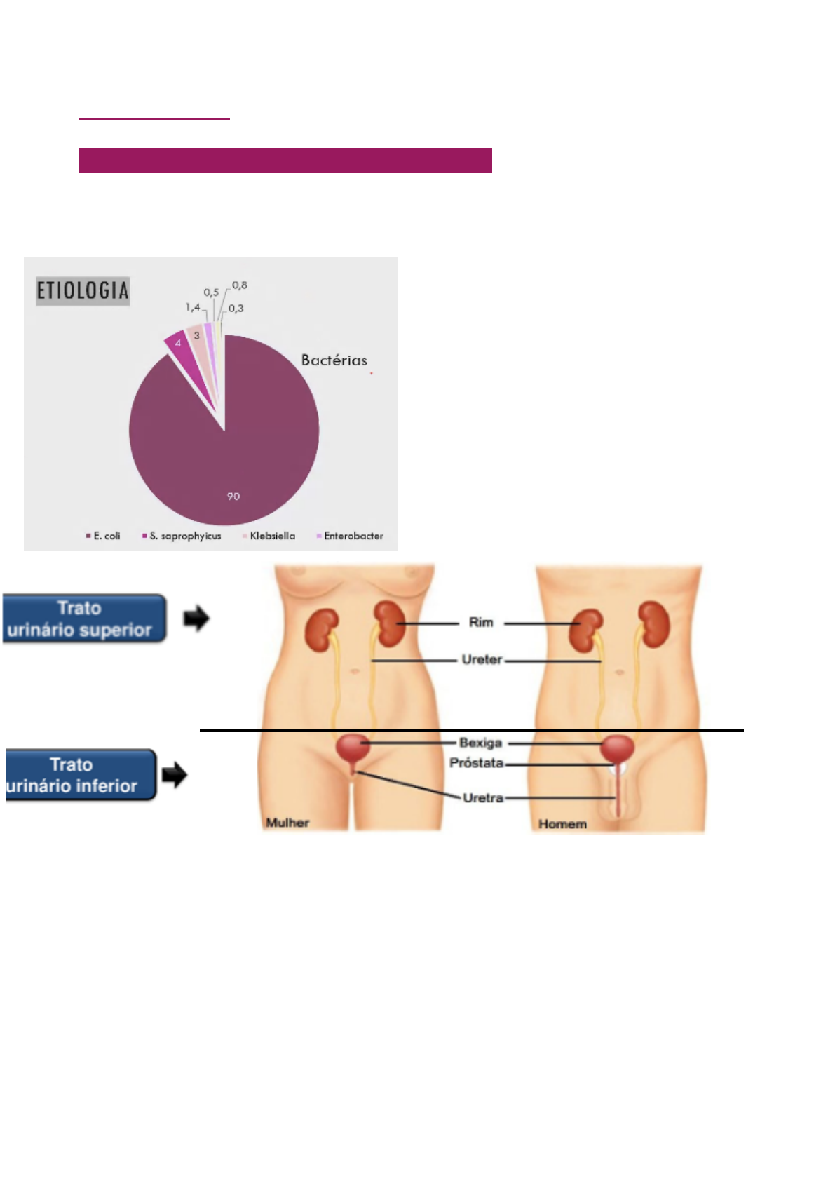 CISTITE E TUMORES UROTELIAIS ●INFECÇÕES DO TRATO URINÁRIO (ITU) -Inflamação patogênica do trato urinário superior ou inferior, predominantemente por bactérias gram negativas. ●FATORES DE PROTEÇÃO DAS VIAS URINÁRIAS: • Esvaziamento completo da bexiga durante a micção • PH ácido • Alta concentração de uréia • Presença de uromodulina e secreções mucosas de uroepitélio • Competência da junção ureterovesical • Competência do esfíncter uretral • Resposta imune protetora uroepitelial ●PATOGÊNESE: 1.Ascendente ou urinária: via mais comum, as bactérias do meio externo atingem as vias urinárias. 2.Hematogênica ou descendente: Pode atuar concomitantemente com a ascendente, ass bactérias pelo sangue chegam ao sistema urinário a partir de focos em outros órgãos (endocardite, infecção pulmonar, septicemia etc). 3.Linfática: através de conexões linfáticas entre o trato urinário inferior e superior com o intestino que favorecem essa rota de contaminação, a disseminação da infecção dentro do rim também pode ser feita . ●CISTITES: >Classificação: 1.Não complicado: ausência de anormalidades anatômicas ou funcionais 2.Complicado: presença de fatores anatômicos ou sistêmicos que aumentam a chance de infecção. >Fatores de risco: -Sexo masculino -Diabetes, -Imunossupressão -Nosocomial -Ostrução do fluxo vesical (hipertrofia da próstata, estenose uretral), -Bexiga neuropática (esclerose múltipla, diabetes mellitus), cateterismo ou stent de ureter etc. 1.AGUDA: -Infecção por invasão bacteriana do urotélio da bexiga por bactérias que migram do reto, como bactérias do períneo e da vagina. -Em homens pode ser um indício de hiperplasia prostática, tumor de próstata e etc. -Geralmente bactérias Gram negativas, como E.coli. 2.CRÔNICA: -Infecção devido tratamentos antineoplásico, alergia alimentar, srubaguda etc. 1.Cistite intersticial: -Ocorre mais em mulheres -Caracterizada por dor sufrapúbica intermitente, frequência urinária, urgência, hematúria e disúria, hemorragias puntiformes na mucosa da bexiga. -MICROSCOPIA: inespecífica e inclue lacerações da mucosa, infiltrado inflamatório crônico composto de linfócitos, macrófagos e células plasmáticas. A contagem de mastócitos pode estar aumentada na muscular própria. -MACROSCOPIA: cistectomia revela um grande espessamento da parede da bexiga, capacidade reduzida e mucosa urotelial inflamada. -DIAGNÓSTICO: biópsia da bexiga. 2.Cistite Folicular: -MACROSCOPIA: presença de folículo linfóide na lâmina com centro germinativo de aparência normal. A cistite folicular também pode ser observada após a terapia para carcinoma urotelial papilar de alto grau ou CIS urotelial. 3.Cistite Eosinofílica: -Muitos casos são idiopáticos, mas outros tem uma causa específica como como cirurgia prévia, reação alérgica a um medicamento ou alimento, resposta a uma infecção parasitária, como esquistossomose, ou doenças vasculares do colágeno sistêmico. -MICROSCOPIA: lâmina própria com intenso infiltrado eosinofílico. Muitos casos são idiopáticos. Em outros, uma causa específica pode ser identificada, como cirurgia prévia, reação alérgica a um medicamento ou alimento, resposta a uma infecção parasitária, como esquistossomose, ou doenças vasculares do colágeno sistêmico. 4.MALACOPLAQUIA: -Parece resultar de defeitos adquiridos na função dos fagócitos em uma infecção crônica especialmente por E. coli. -MICROSCOPIA: coloração do ácido periódico de Schiff (PAS). Observa-se macrófagos com citoplasma granular PAS positivo e vários corpos de Michaelis-Gutman densos e redondos, cercados por espaços claros artefatuais, no campo médio superior (seta). >QUADRO CLÍNICO: -Os idosos além de ter uma apresentação típica, tendem a ter um estado mental alterado, letargia e fraqueza generalizada. >DIAGNÓSTICO: • Urinálise com microscopia • Piúria • Nitritos • Cilindros de leucócitos • Urocultura (> 100.000 bactérias) • Leucócito Esterase DIFERENCIAL: • Cervicite • Epididimite • Prostatite • Sífilis • Uretrite • Vulvovaginite TUMORES UROTELIAIS -Representam 90% de todos os tumores da bexiga. >Lesões etiológicas mais comuns: Invasivo= invadiu lamina própria ou muscular também >FATORES DE RISCO: 1.Tabagismo, aumenta o risco de três a sete vezes, dependendo da duração e do tipo de uso do tabaco. 2.Exposição industrial a arilaminas, particularmente 2-naftilamina e compostos relacionados, como indicado na discussão anterior sobre carcinogênese química. 3.Uso de analgésicos em longo prazo. 4.Exposição a ciclofosfamida por longo prazo, um agente imunossupressor que induz cistite hemorrágica e aumenta o risco de câncer de bexiga. 5.Irradiação, aumenta o risco de carcinoma urotelial, que ocorre muitos anos após a irradiação >ASPECTOS MOLECULARES: -Mutação de perda de função do TP53 e RB = tumor de alto grau -Mutações de ganho de função em FGFR3 -Mutações de ativação do oncogene HRAS -Perdas de material genético no cromossomo 9, as deleções 9p (9p20) abrangem uma região que inclui o gene supressor de tumor CDKN2A, que codifica o inibidor de cinase ciclina-dependente p16/INK4a e ARF, uma proteína que aumenta a função de p53 -Gene supressor tumoral sendo o alvo de deleções no cromossomo 9q, incluindo PTCH e TSC1. -Desses tumores, uma minoria podeperder a função de TP53 e/ou RB e progredir para a invasão. -Na via mais agressiva, lesões não invasivas planas ou papilares de alto grau são iniciadas por mutações de TP53, com a perda do cromossomo 9 e a aquisição de outras mutações segue-se a progressão para invasão. >CURSO CLÍNICO: • Hematúria indolor • Frequência e urgência urinária • Disúria >Prognóstico: -Depende do grau histológico e do estágio ao diagnóstico. -O desafio clinico é detectar precocemente para acompanhamento adequado.